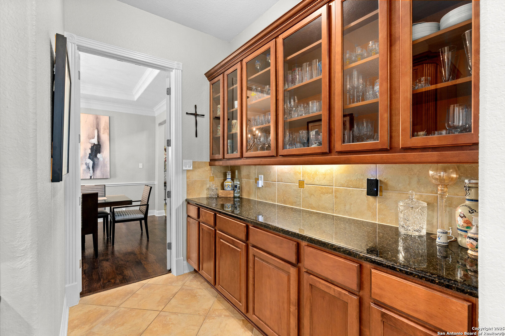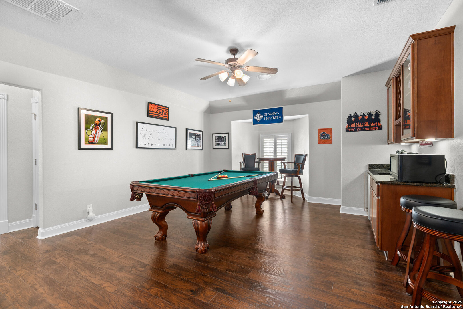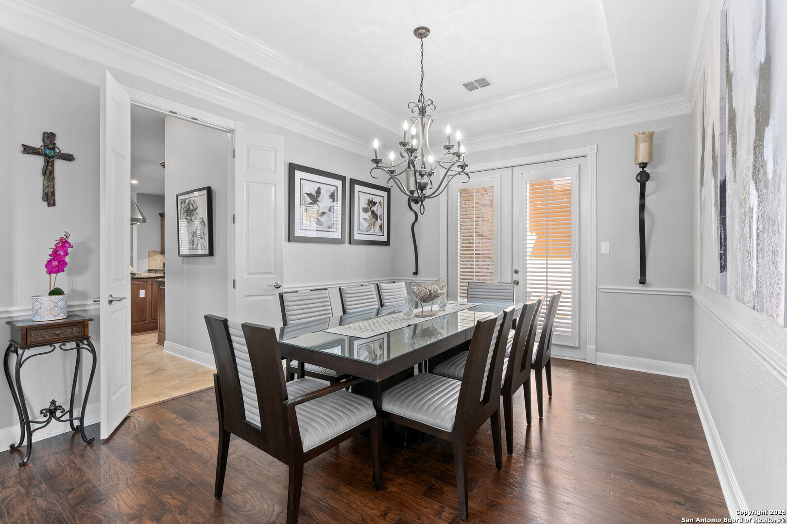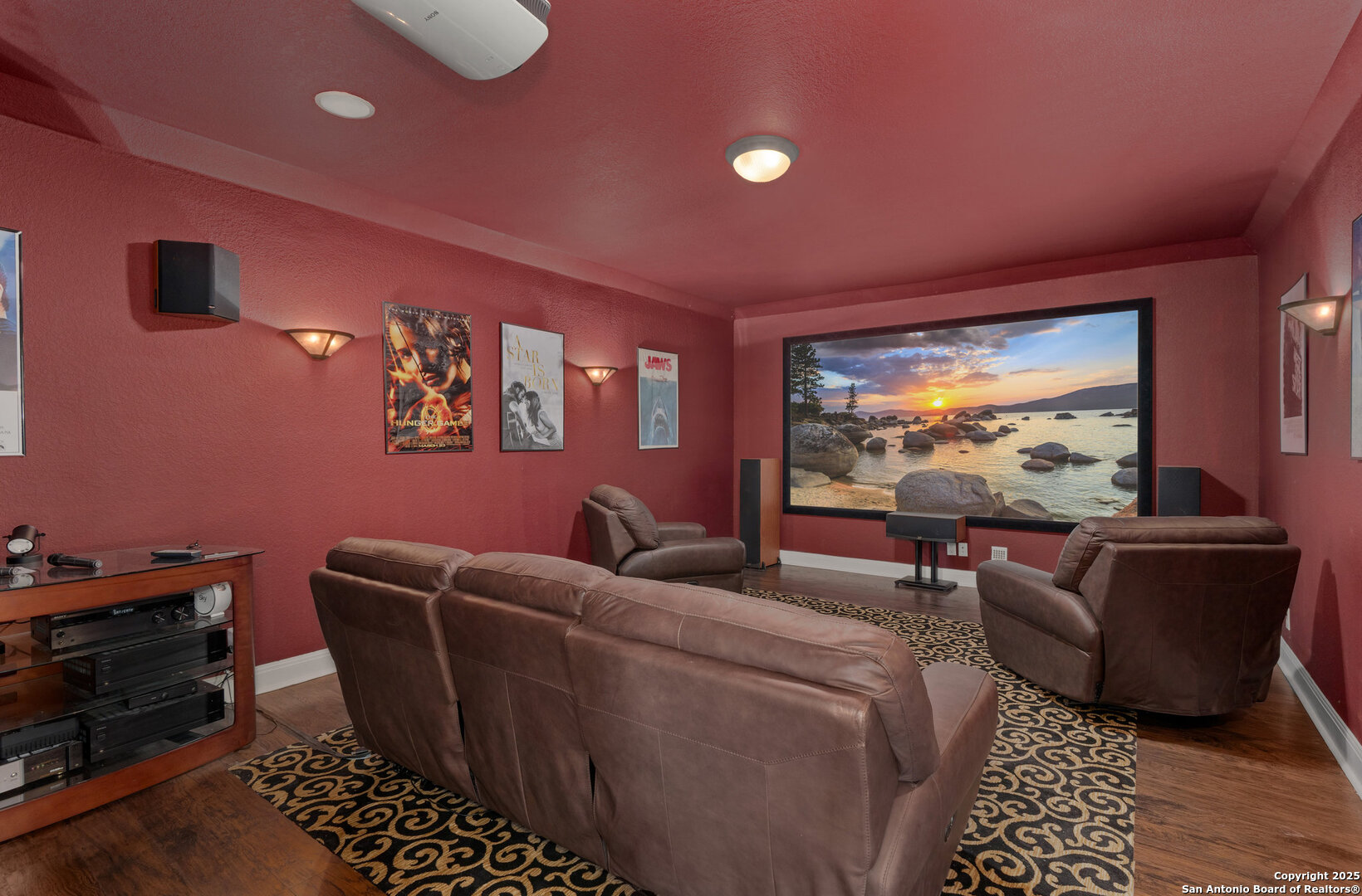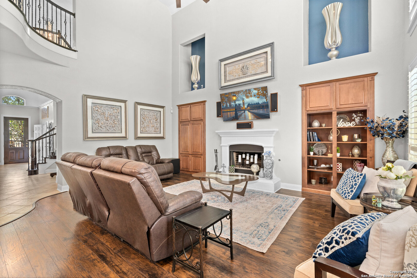 Discover this exquisite Mediterranean home in The Dominion gated community, featuring an open layout with a grand family room and soaring two-story ceilings, perfect for entertaining. This residence offers two first-floor master suites, including one upgraded for handicap accessibility, and two additional upstairs bedrooms with en-suite baths for added privacy. The chef's kitchen boasts stainless steel appliances, gas cooking, a butler's pantry, and a granite island that seamlessly connects to the family room. The home features plantation shutters and engineered hardwood flooring throughout, adding a touch of elegance and timeless style. Convenience is key with a STILTZ Lift handicap-accessible elevator, a handicap-accessible guest bath, a cloud-enabled security system, an upstairs game room, and a private theater with projector and surround sound. Enjoy outdoor living with a covered patio, iron fencing, mature landscaping, and a beautifully maintained backyard, perfect for relaxation and gatherings. This meticulously upgraded home is ideal for multi-generational living, combining luxury with everyday practicality. Schedule your private tour today!