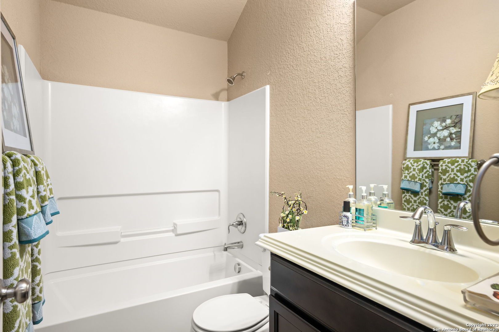 Welcome to 7222 Sunny Day, a stunning 3-bedroom, 2.5-bathroom home nestled within a small private gated community in the desirable medical center area of San Antonio. This charming garden home residence boasts beautiful wood grain tile flooring throughout, creating an inviting and low-maintenance living space. Step inside and discover an open concept layout that effortlessly combines style and functionality. The island kitchen, featuring solid surface countertops and sleek stainless-steel appliances, is