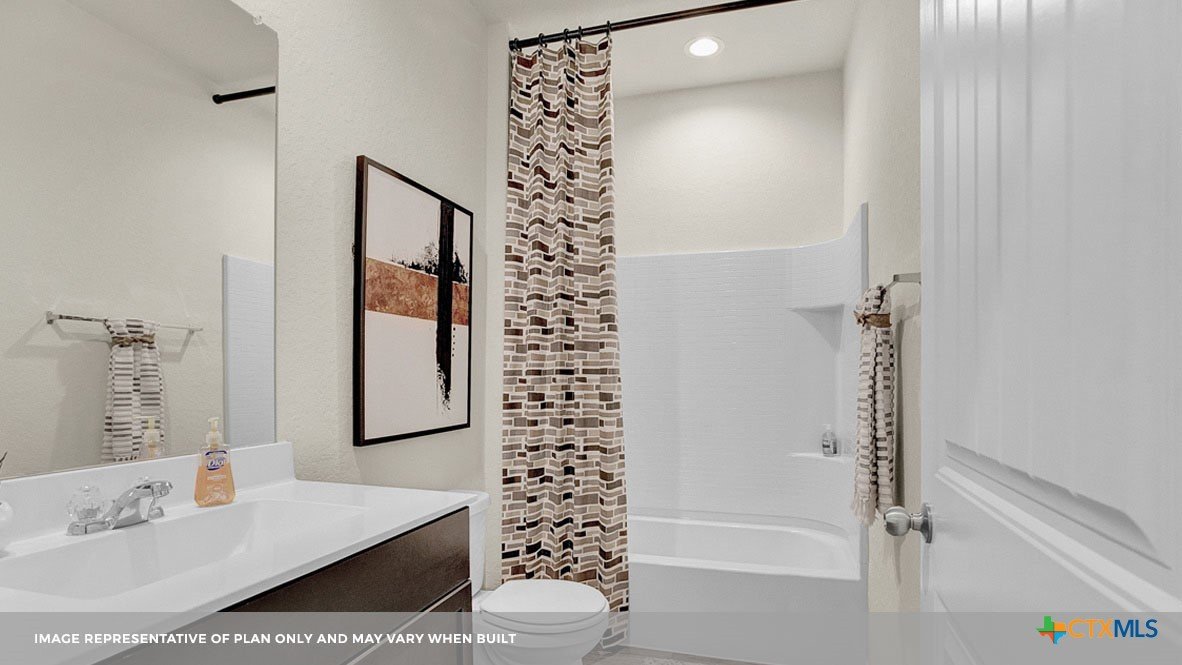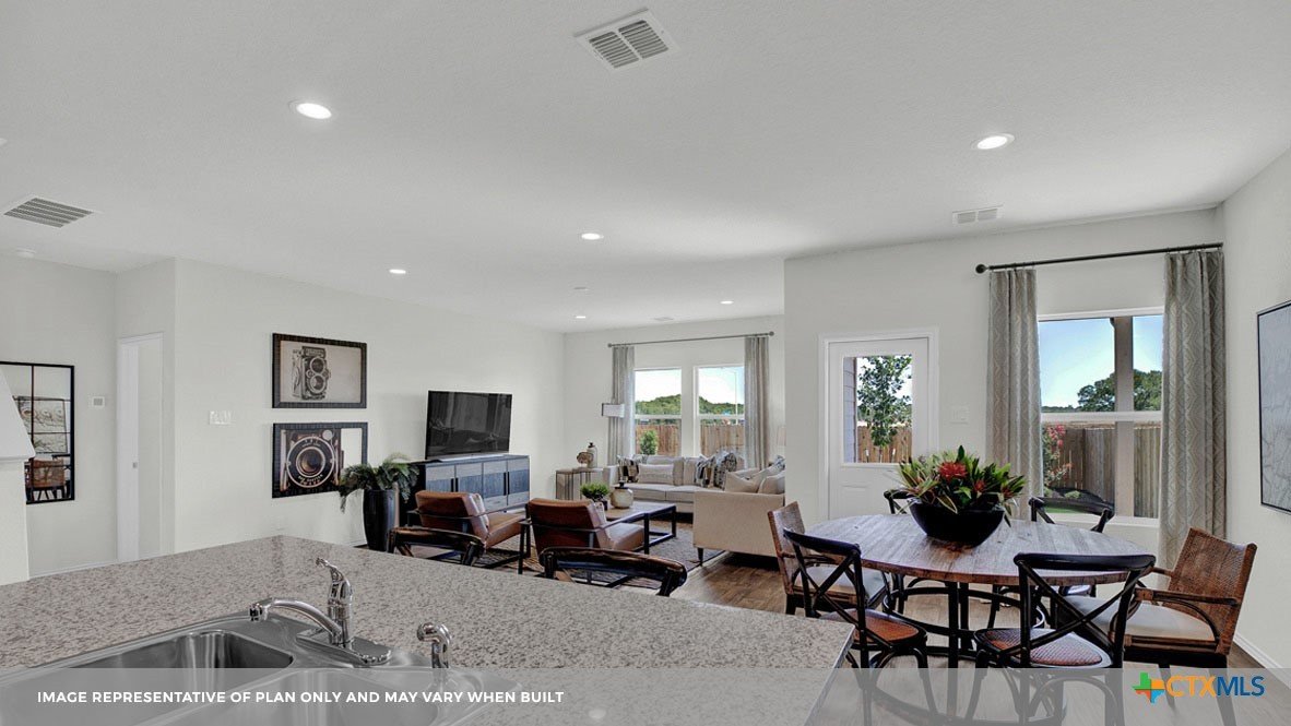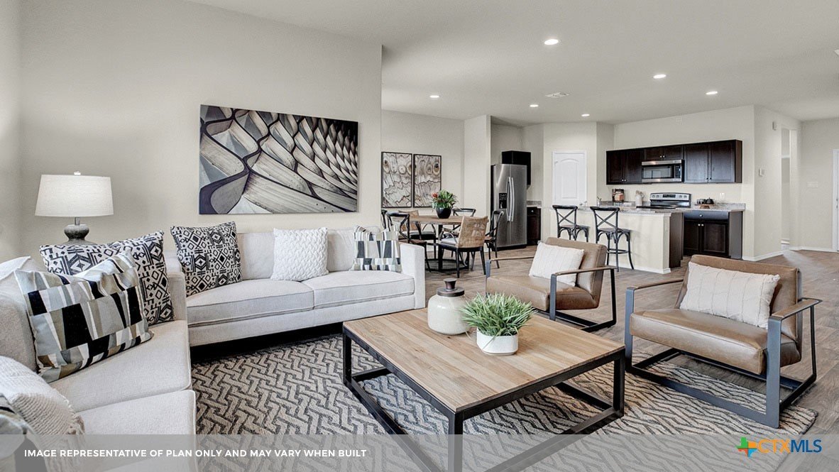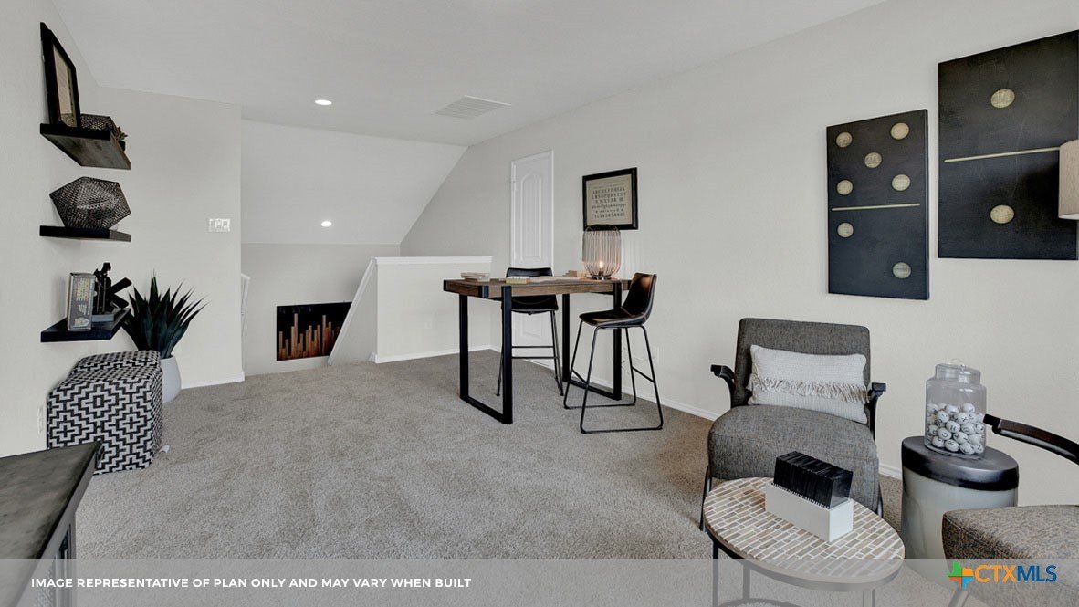 MOVE IN READY! Find all the space you need in our Midland floorplan at Arroyo Ranch in Seguin, Texas. This two-story home includes 4 bedrooms, 3 bathrooms, a loft and 2 car garage within its 2,170 square feet of living space. Our homes in Arroyo Ranch feature brick or brick and stone exteriors and the Midland plan is available with 2 exterior elevations to choose from. Step inside this home and walk through the foyer to the kitchen, dining, and family room. This open concept space is perfect for hosting and entertaining, as well as everyday living. The L-shaped kitchen features granite countertops, a large island facing the family room, a corner pantry closet, stainless-steel appliances and 36’’ upper cabinets. The first floor includes 2 bedrooms and 2 bathrooms. The primary bedroom is at the back of the home, off the family room, and includes an attached bathroom. This relaxing bathroom space features a 5’ walk in shower, double sink vanity, private toilet area with a door, and a walk-in closet. At the front of the home is a secondary bedroom, bathroom, and utility room. The secondary bathrooms include a tub/shower combination. Ascend the stairs to the loft, an extra living space that could be used as an office or play area for the kids. Two additional bedrooms and a full bathroom are upstairs, allowing amble space for the whole family. The Midland includes vinyl flooring throughout the common areas of the home, and carpet in the bedrooms, loft, and stairwell. All our new homes feature a covered back patio, full sod, irrigation system in the front and back yard, and a 6’ privacy fence around the back yard. This home features our America’s Smart Home base package, which includes the Video Front Doorbell, Front Door Deadbolt Lock, Home Hub, Thermostat, and a Smart Switch.