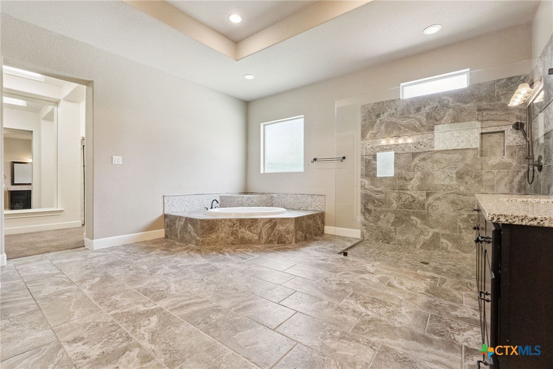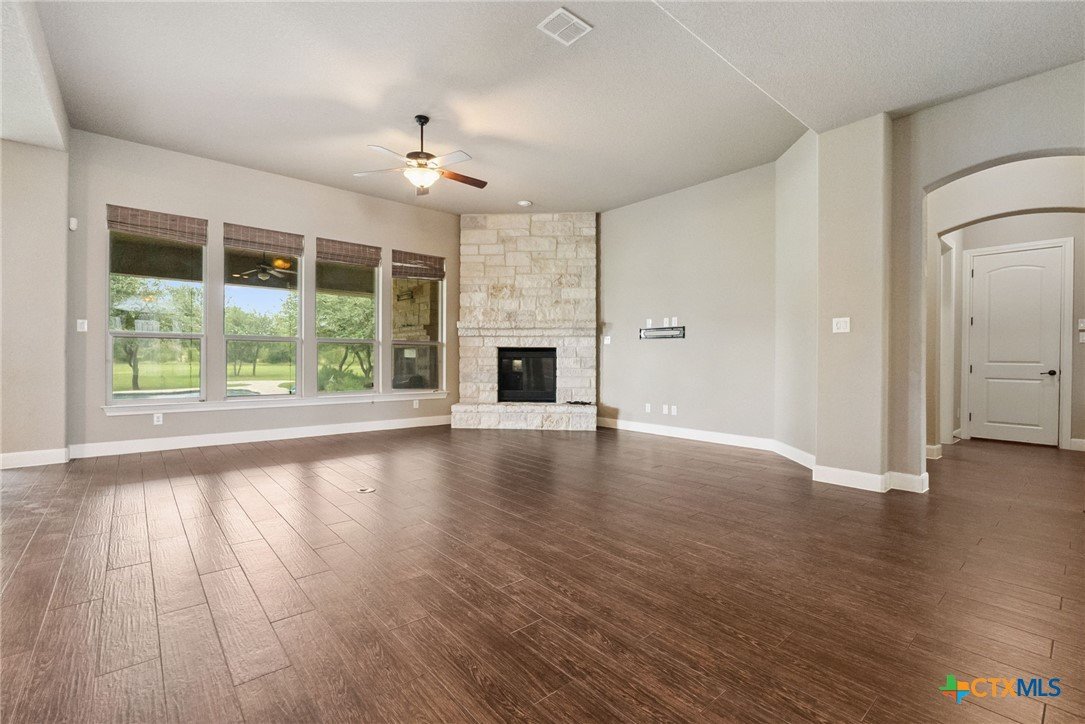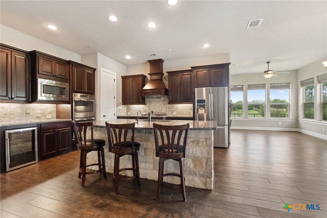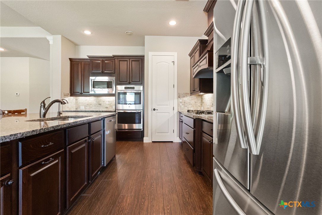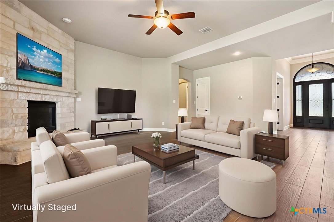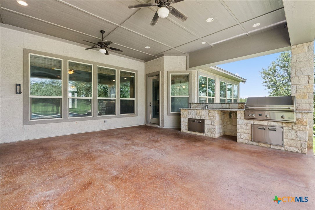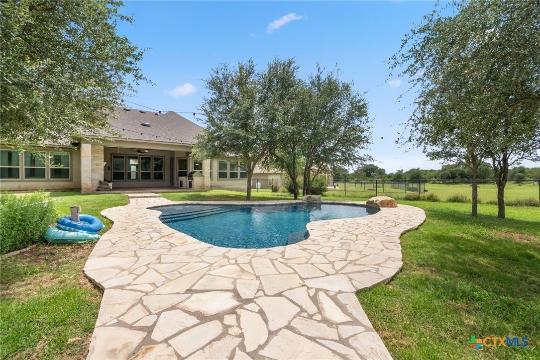 Welcome to your private Texas retreat! This beautifully designed 4-bedroom, 4-bathroom custom home sits at the end of a quiet cul-de-sac on a gated 1.7-acre lot, offering privacy, luxury, and space to entertain both inside and out. A grand circular driveway leads you to the stone and stucco exterior, surrounded by mature trees and well-kept landscaping. Inside, the home features tall ceilings, crown molding, and rich wood-look tile floors throughout the main living areas. The open-concept layout includes a spacious living room with a stone fireplace and large windows overlooking the backyard. The gourmet kitchen is a dream for any chef, complete with granite countertops, dark custom cabinetry, stainless steel appliances, a gas cooktop, and a large island perfect for gatherings. Just off the kitchen, the sun-drenched breakfast area offers peaceful views of the backyard, while the formal dining room adds a touch of elegance for entertaining guests. The primary suite is a true escape, featuring a large bedroom with soft natural light and a spa-inspired bathroom with dual vanities, a soaking tub, a walk-in shower, and plenty of storage. Each of the additional bedrooms is generously sized, and the layout includes a private study, ideal for working from home. Step outside to enjoy your own backyard oasis. The covered patio features a full outdoor kitchen and fireplace, perfect for entertaining year-round. Cool off in the sparkling in-ground pool or relax under the trees while enjoying the peaceful greenbelt view behind the home. This property blends upscale finishes, thoughtful design, and outdoor living in one incredible package. It’s not just a home—it’s a lifestyle!