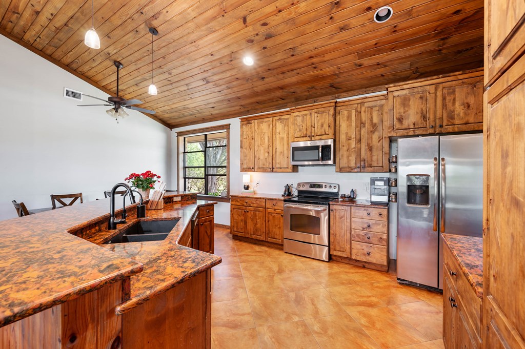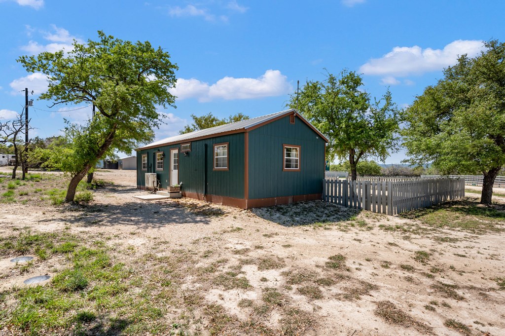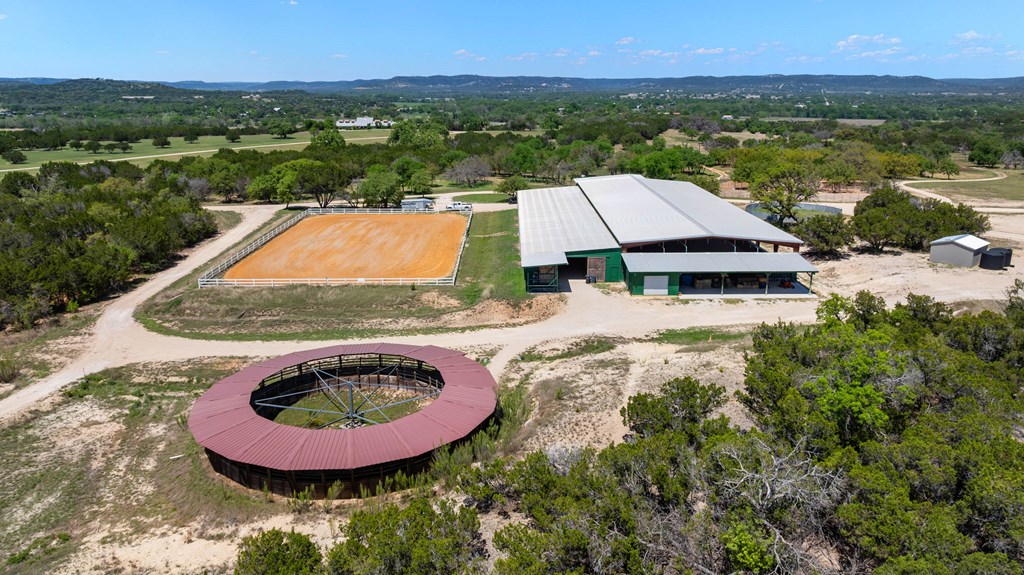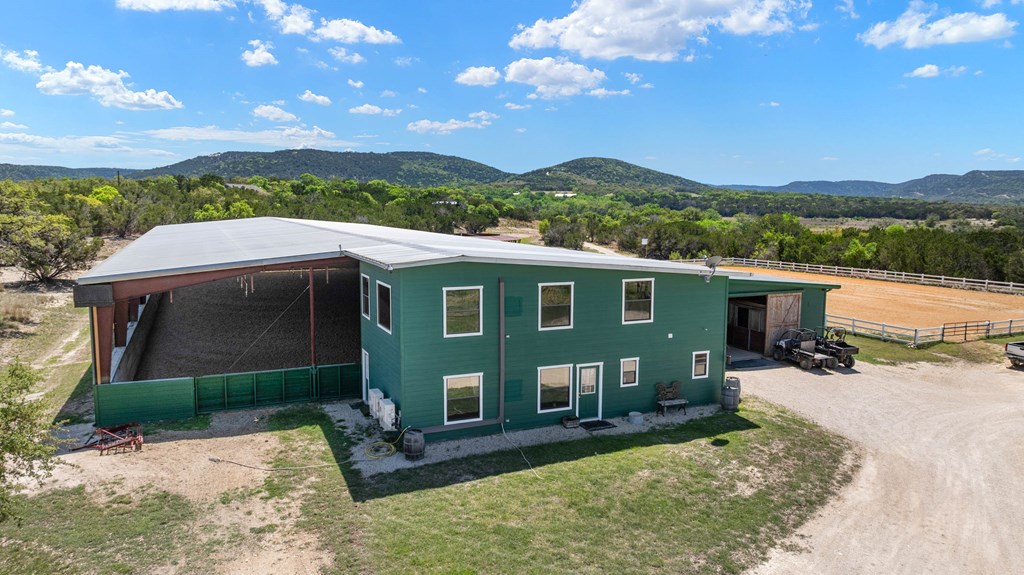 Welcome to Jackrabbit Ranch- A Premier Equestrian Retreat in the Texas Hill Country! Nestled on 60 acres Jackrabbit Ranch is a horse lover's dream appealing to both Western and English riders. This property offers top-tier facilities, ranch style living, and breathtaking views. The property is equipped with 2 wells with 9,000 gallons of storage and a new pump house with UV filtration and water collection. An automatic gated entrance and caliche rd lead you to the main house, a 3-bed, 2-bath home retreat. A separate 2-bedroom cabin provides accommodations for guests, trainers, or staff. The covered, mirrored arena and fully updated barn is equipped with a clubhouse complete with a kitchen, office, sleeping quarters, and viewing windows designed for professional training and boarding. The arena has been re-leveled for superior footing, while the barn features spacious stalls with black mats, automatic waterers, and a fly spray system. Thoughtful upgrades, include new LED lighting, updated electrical and foaling stalls, all which enhance both safety and efficiency. The barn includes concrete-floored hay storage, a centralized manure management spot, dual RV hookups, and a security sys