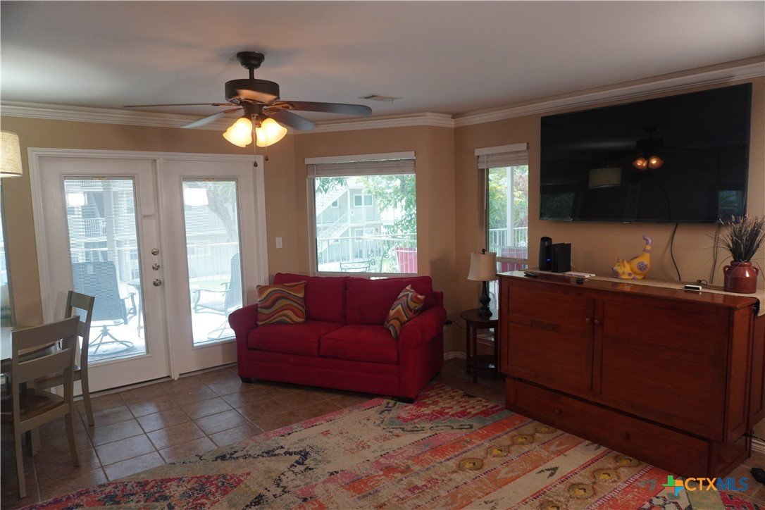 WATERFRONT CONDO IN NEW BRAUNFELS RIGHT ON THE GUADALUPE RIVER. THIS 2 BEDRM/2 BATH RIGHT NEAR SCHLITTERBAHN WATER PARK AND DOWNTOWN AREA. THIS CONDO HAS ENGINEERED WOOD FLOORING IN ALL BEDROOMS AND THE OTHER FLOORING IS TILE SO NO CARPET. THIS FULLY FURNISHED SHORT TERM RENTAL HAS A GREAT COMFORTABLE LAYOUT THAT CAN SLEEP UP TO 9 COMFORTABLY WITH AN EXTRA COUCH THAT IS A FULL BED AS WELL AS A FULL SIZED MURPHY BED. FULL SIZED REFRIGERATOR ALONG WITH CORIAN COUNTERTOPS AND A DEEP CRUSHED GRANITE SINK. A MUST SEE PROPERTY!!!!