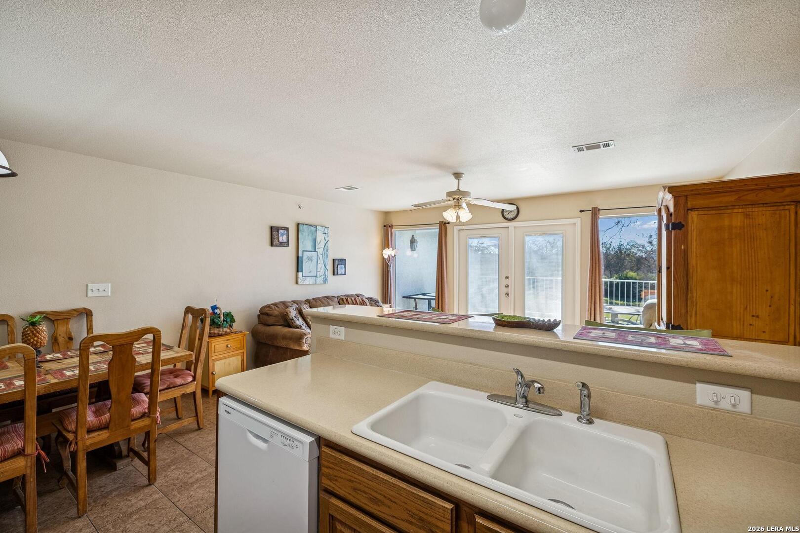 Riverfront condo living meets resort-style amenities in the heart of New Braunfels. This short-term rental-friendly Guadalupe River condo places you steps from the water and just minutes from Landa Park, Downtown New Braunfels, and Gruene, where shopping, dining, and live music are always nearby. The highlight is the large private balcony, wrapped in stucco privacy walls and overlooking the Guadalupe River, river park, and community pools-ideal for morning coffee, post-float relaxation, or sunset views. With no upstairs neighbors, the condo offers extra privacy, along with exterior elevator access, assigned parking, and additional guest parking. The community is designed for easy river living, featuring a pool with two hot spas, a shaded river park with picnic tables and grills, and direct Guadalupe River access with 280' of shoreline, all surrounded by mature trees. Secure, coded entry keeps amenities convenient for owners and guests. Inside, the open split floorplan is bright and low-maintenance with tile flooring throughout, dual-pane windows, and ceiling fans. The living area opens through French doors to the balcony, blending indoor and outdoor space. The kitchen includes bar seating, matching appliances, and a large sink with disposal. The owner's suite offers abundant natural light, large walk-in closet, and en suite. Whether you're seeking a lock-and-leave river escape or an STR-friendly investment, this condo delivers the New Braunfels lifestyle-without the upkeep.