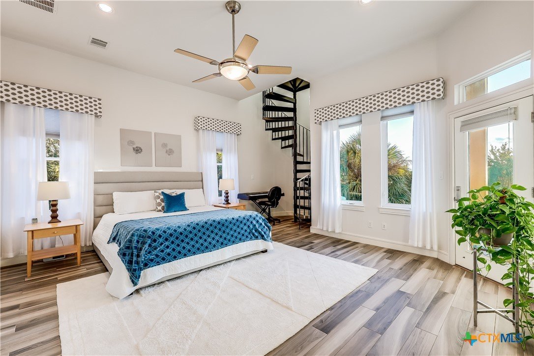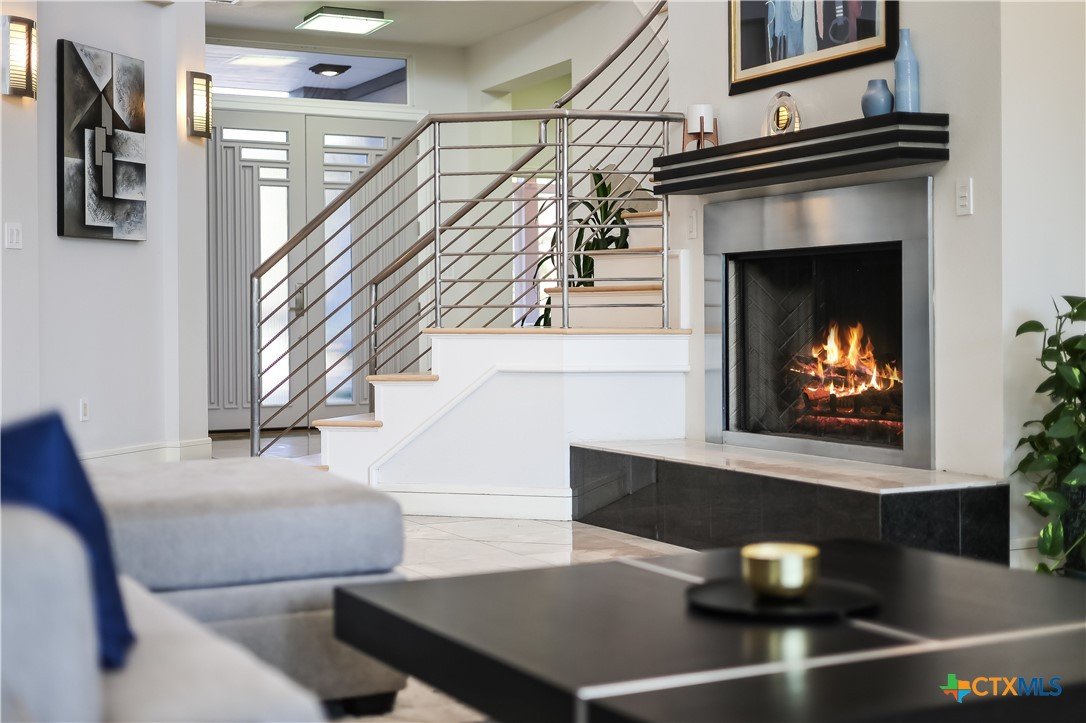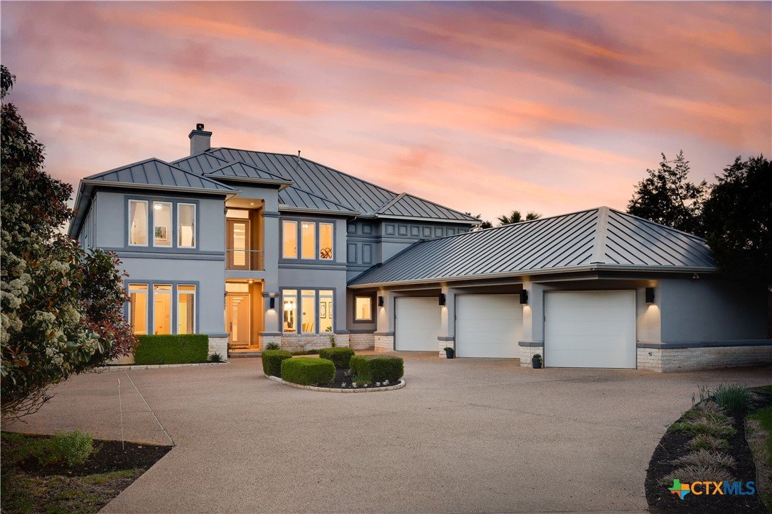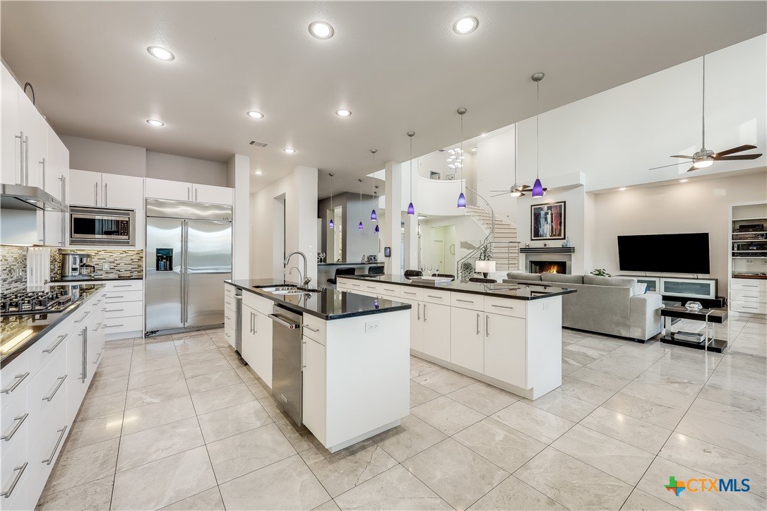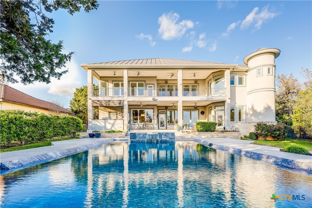 WATERFRONT estate boasting captivating views of Lake Travis and hill country from every vantage point. Nestled within an exclusive gated community, this immaculate residence offers a lifestyle and ambiance that epitomize luxury living. Exuding sophistication, the living spaces feature elegant honed limestone tile flooring, lofty ceilings, and designer lighting fixtures. Designed with entertaining in mind, the open floor plan seamlessly integrates a modern fireplace in the living room, an extensive wet bar complete with a dumbwaiter to the second floor, and panoramic views of the pool and lake. An integrated audio system connects the great room and outdoor living areas, ensuring a seamless ambiance for gatherings. The gourmet kitchen is a culinary enthusiast's dream: double islands, sleek flat-panel cabinetry, and top-of-the-line stainless steel appliances. The primary suite offers a private sanctuary with two walk-in closets, and lavish en-suite featuring a double vanity, expansive curbless walk-in shower, and a jetted tub. A spiral staircase off the primary suite leads to a secluded office space with custom built-in desks, awe-inspiring views, and access to a private 548 square foot balcony. Additional accommodations on the main floor include a guest suite, a second office, and a pool bathroom with a walk-in shower and ample storage. Ascend the sleek custom staircase to the second floor, where two bedrooms, a flex room, a spacious game room, and a theater room with sound insulation and a projector screen await. Outdoor living is elevated to new heights with a pristine pool and hot tub, expansive patio space with motorized sun shades, and a professional-grade outdoor kitchen. Located less than two miles from Northshore Marina and minutes from Lago Vista and Cedar Park, this unparalleled resort-style home also grants access to The Hollows amenities, including hiking trails, a beach club, pool, restaurant, park, and fitness center with optional membership.