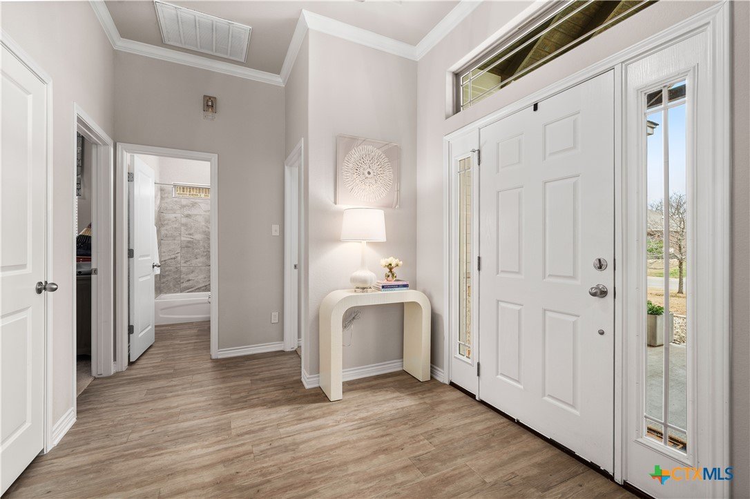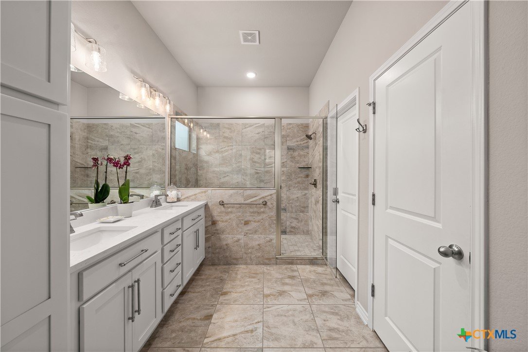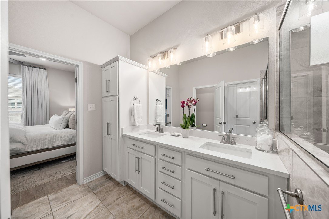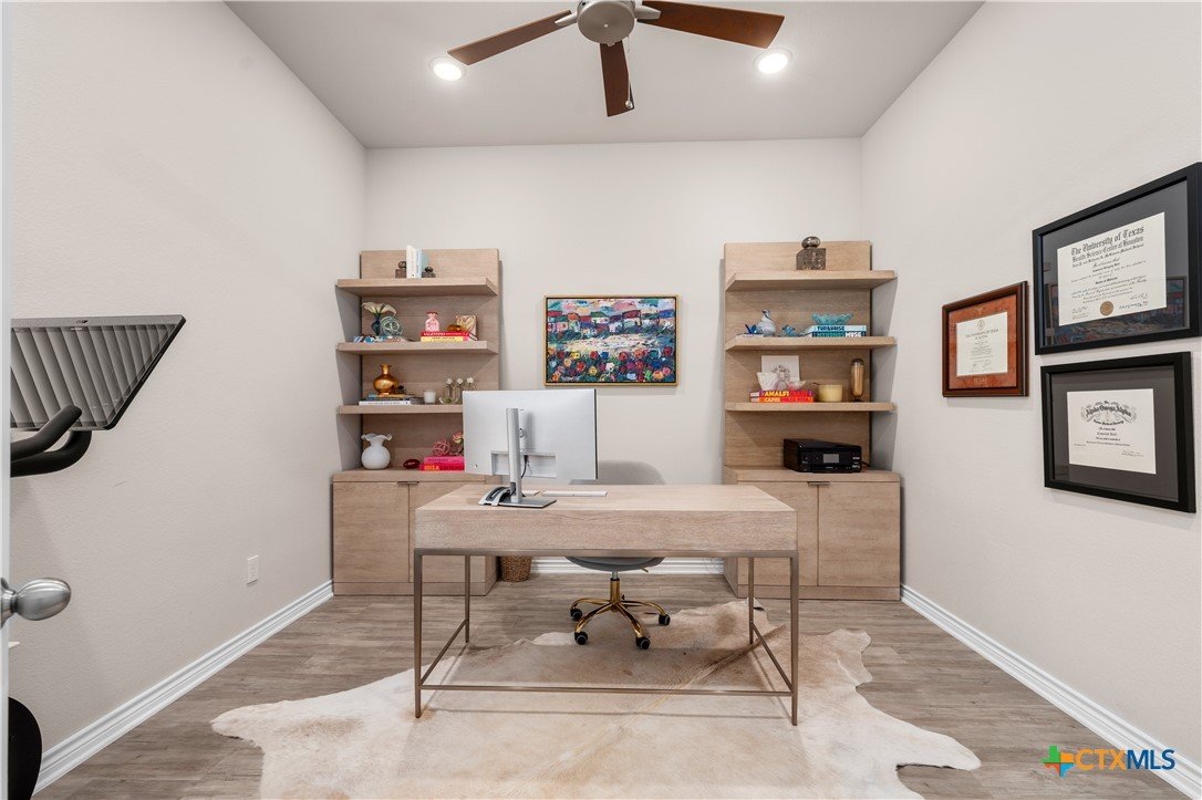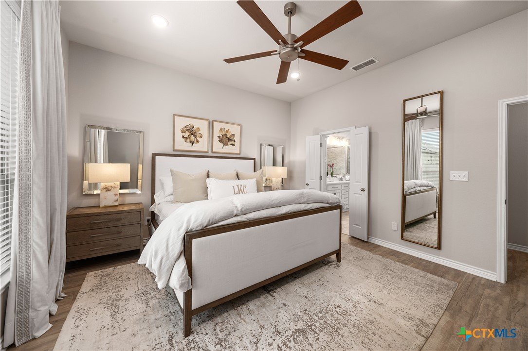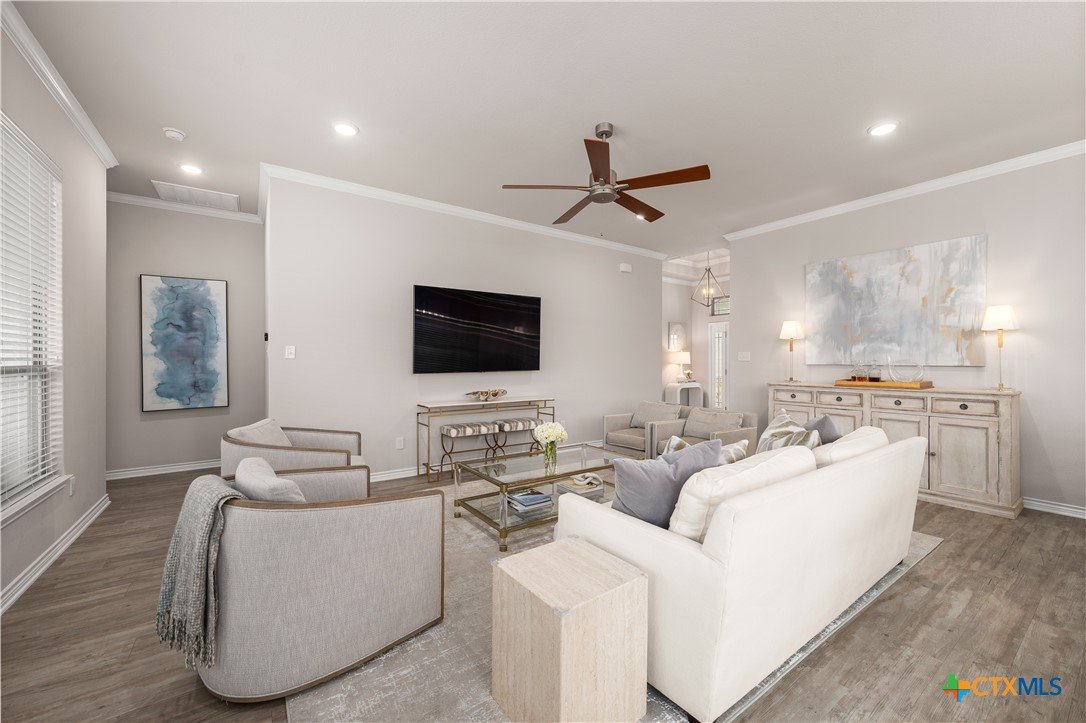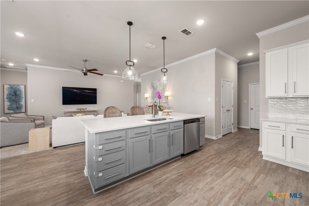 From the moment you step inside, this striking home feels both welcoming and refined. Thoughtful upgrades and carefully selected finishes elevate the space, creating an atmosphere of effortless style and everyday comfort. The heart of the home is the open living, kitchen, and dining area—designed to bring people together. Whether you’re hosting lively gatherings or enjoying quiet evenings at home, the seamless layout allows conversation to flow easily from room to room. Quartz countertops sparkle throughout the kitchen and all baths, while ivory maple cabinetry lends a soft, timeless elegance. The ash-toned center island adds contrast and warmth, anchoring the kitchen as a natural gathering spot. A farmhouse-style undermount stainless steel sink and upgraded fixtures complete the space with both beauty and function in mind. primary bedroom is a true retreat—generously sized & thoughtfully designed for relaxation at the end of the day. The ensuite bath feels spa-inspired, featuring an oversized walk-in shower with bench seating, dual vanities with quartz countertops,& a separate commode area for added privacy. A spacious walk-in closet completes the suite, providing both function & organization. Upgraded vinyl plank flooring runs throughout the home, including the primary bedroom & closet, offering durability without sacrificing style. Secondary bedrooms provide cozy comfort with plush carpeting, while ceramic tile in the bathrooms add a clean, polished finish. Canister lighting enhances the living room, primary bedroom, & office/study, creating a bright yet relaxing ambiance day & night. Comfort-height commodes & upgraded faucets further reflect the attention to detail found throughout the home.Step outside to the covered patio, where a wood-burning fireplace creates the perfect setting for cozy evenings, casual get-togethers, or relaxing under the stars. This home isn’t just beautifully upgraded—it’s designed for the way you live, gather, & unwind every day.