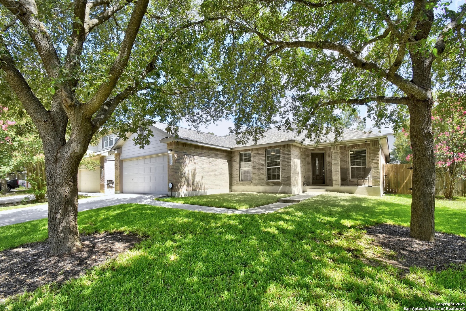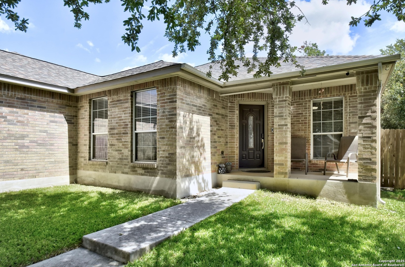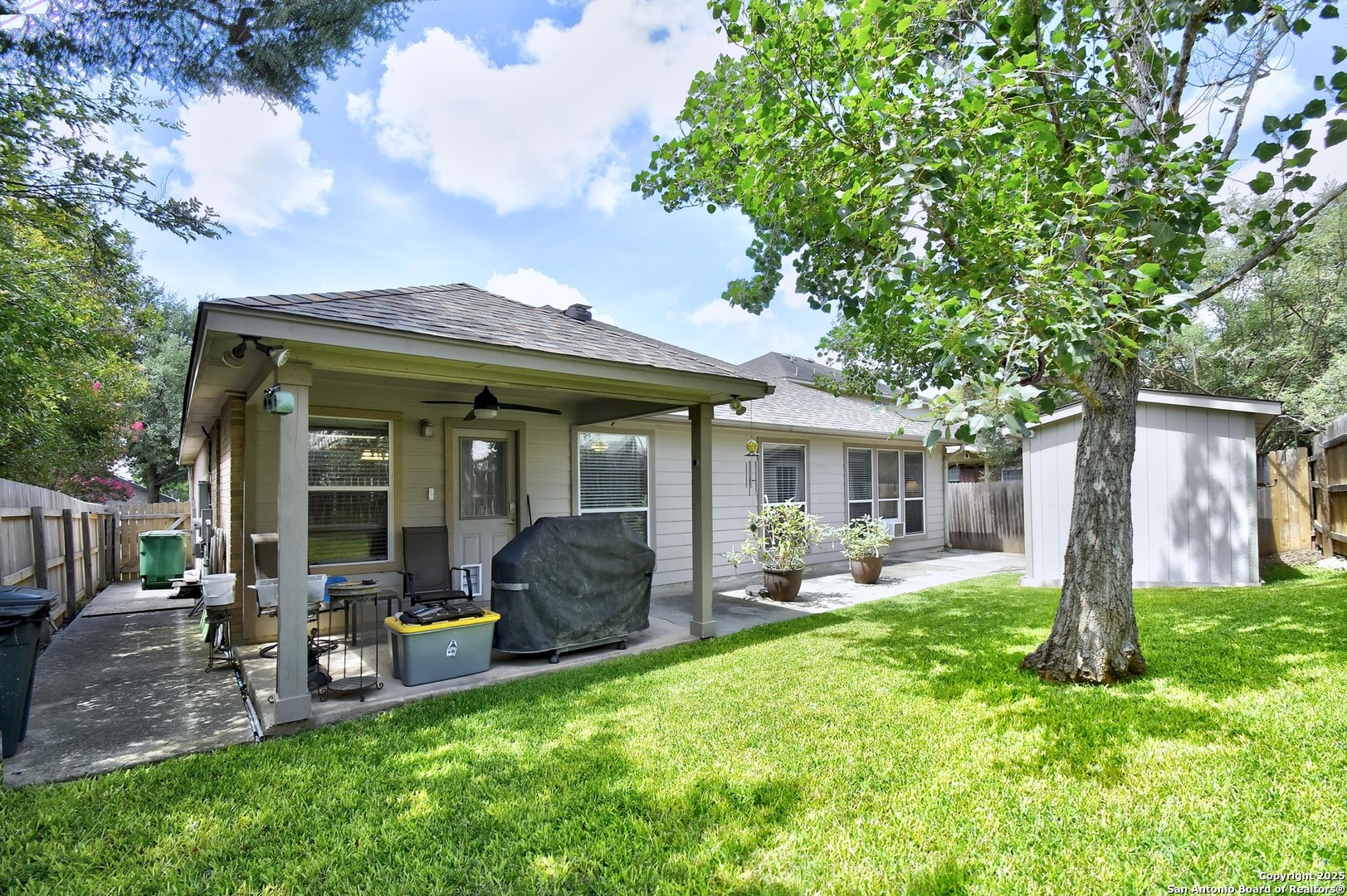 Nestled among mature trees, this stunning brick residence offers a perfect blend of elegance and functionality in a prime location near UTSA, USAA, and La Cantera. Step inside to an open floor plan featuring a spacious living room with immersive surround sound, ideal for entertaining or cozy nights in. The island kitchen is a chef's dream, boasting ample cabinetry, a bright breakfast nook, and a separate dining room for formal gatherings. The master suite, thoughtfully split from the other bedrooms for privacy, provides a serene retreat. A dedicated office space enhances the home's versatility, perfect for remote work or study. Outside, enjoy a covered back patio, ideal for relaxing or hosting, complemented by a convenient storage building in the beautifully landscaped backyard.