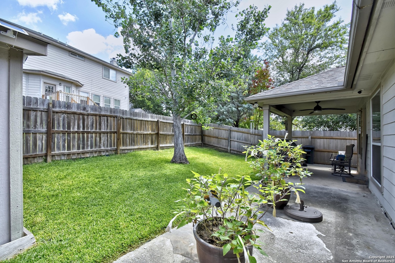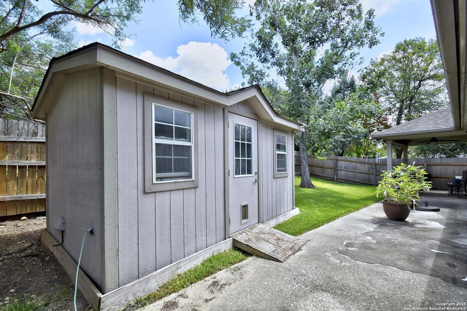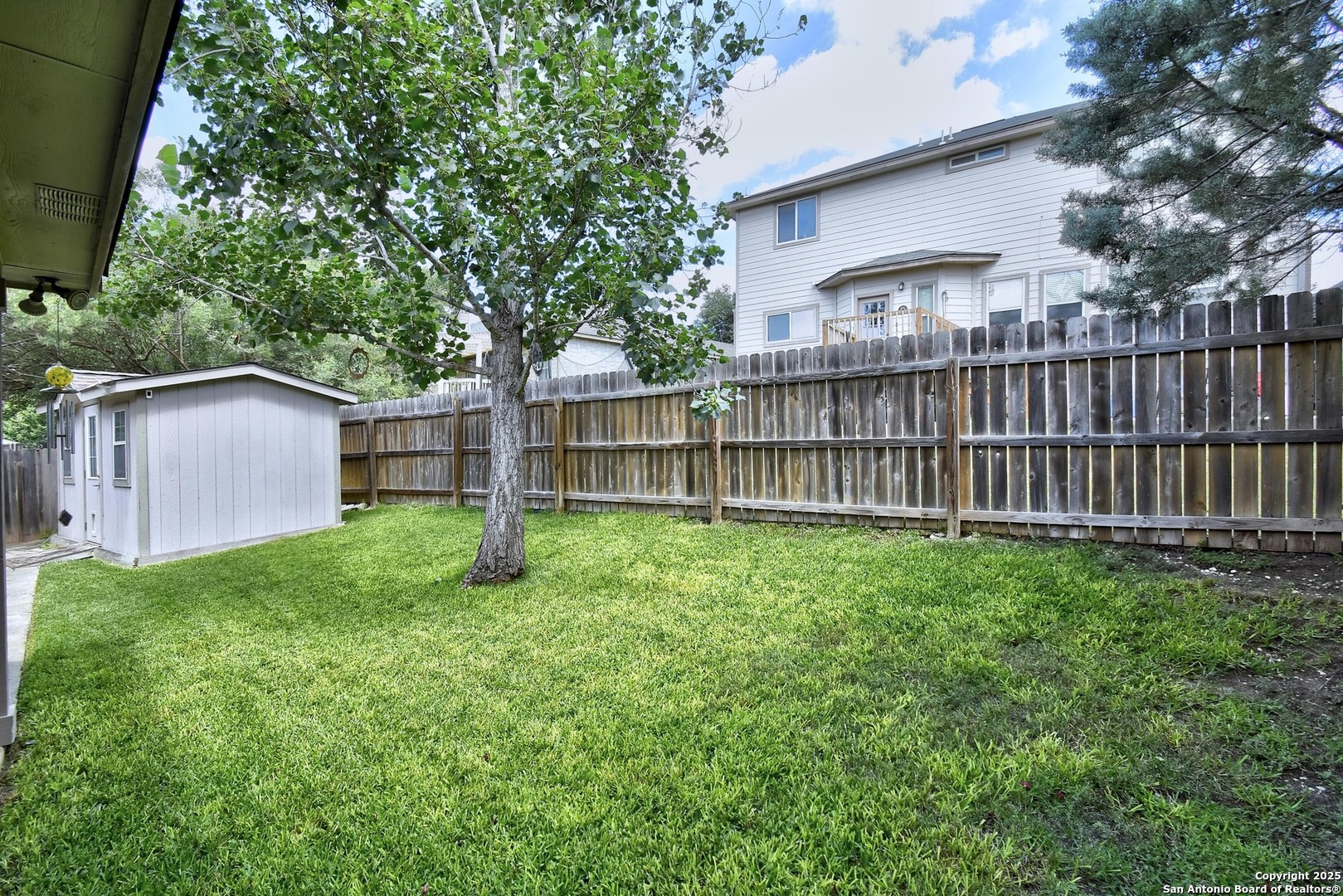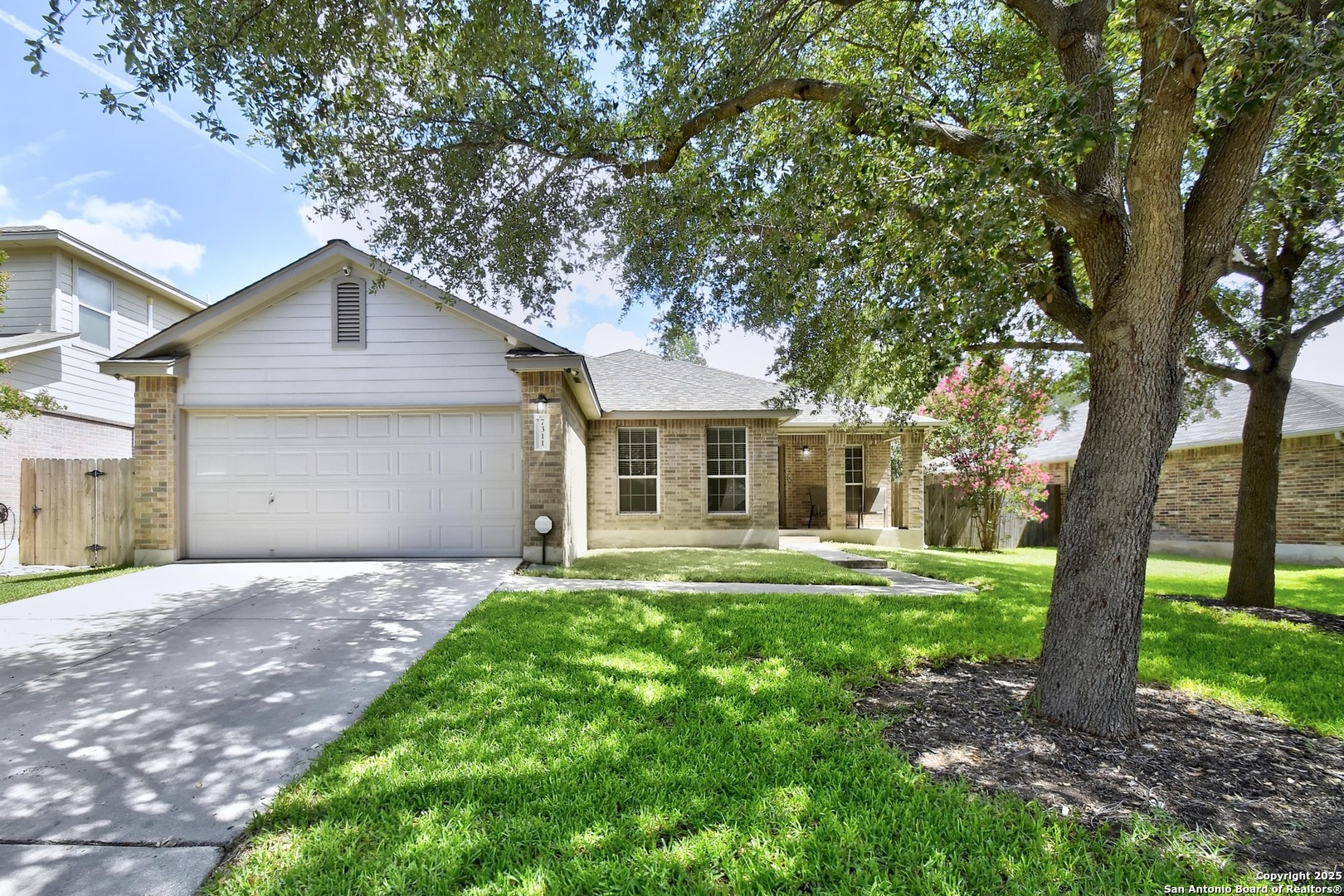 Nestled among mature trees, this stunning brick residence offers a perfect blend of elegance and functionality in a prime location near UTSA, USAA, and La Cantera. Step inside to an open floor plan featuring a spacious living room with immersive surround sound, ideal for entertaining or cozy nights in. The island kitchen is a chef's dream, boasting ample cabinetry, a bright breakfast nook, and a separate dining room for formal gatherings. The master suite, thoughtfully split from the other bedrooms for privacy, provides a serene retreat. A dedicated office space enhances the home's versatility, perfect for remote work or study. Outside, enjoy a covered back patio, ideal for relaxing or hosting, complemented by a convenient storage building in the beautifully landscaped backyard.