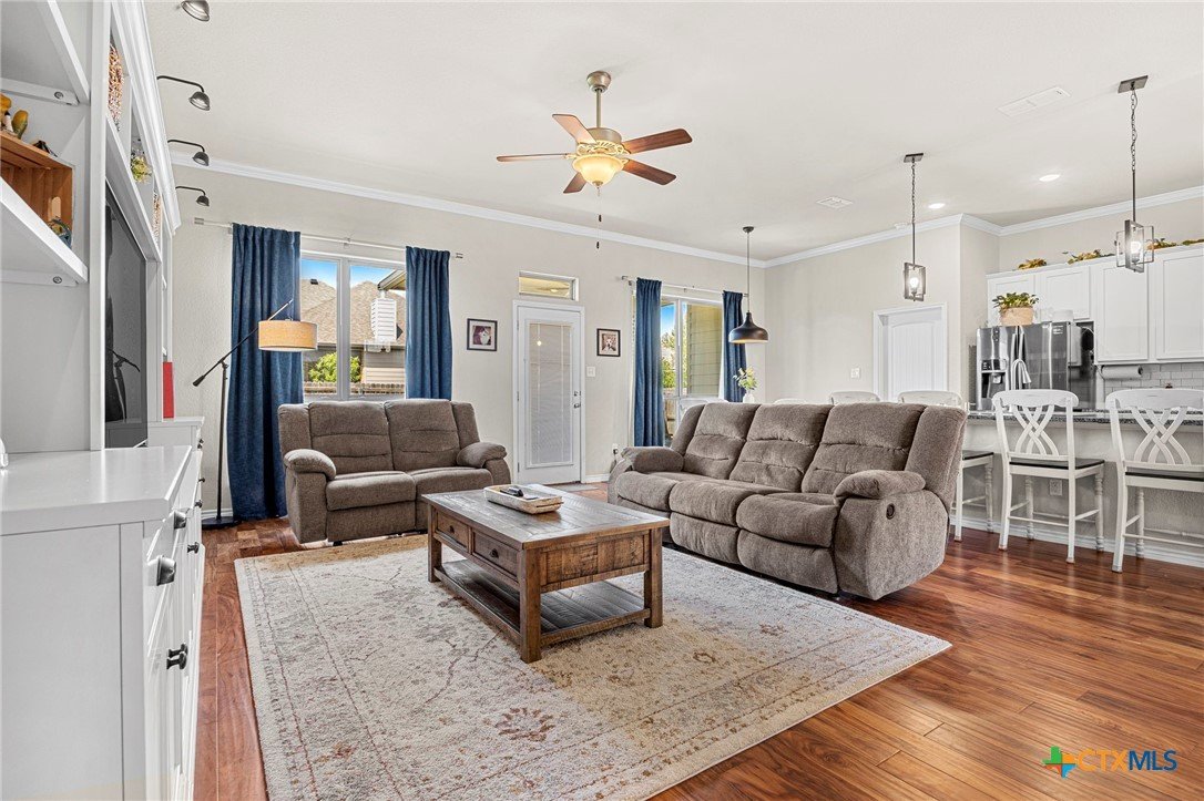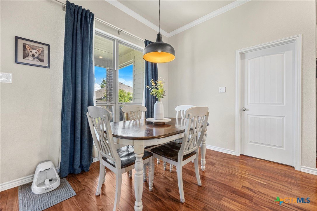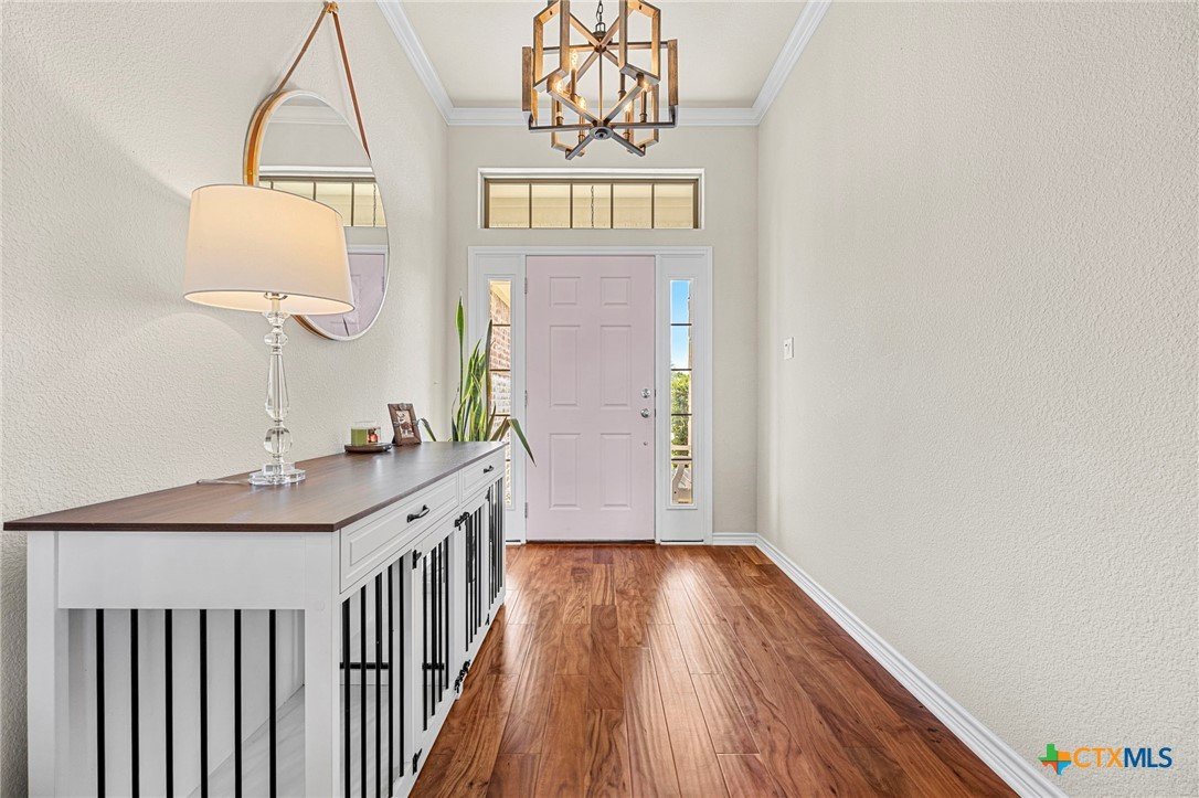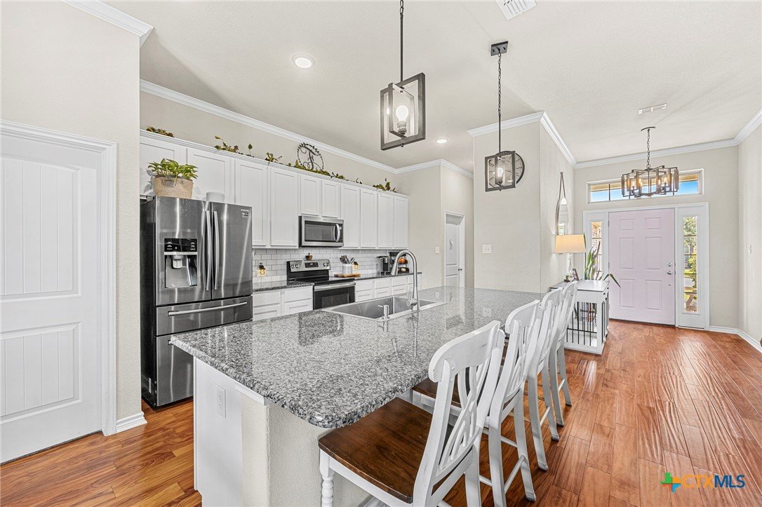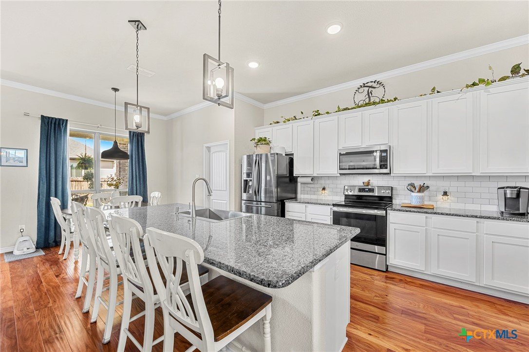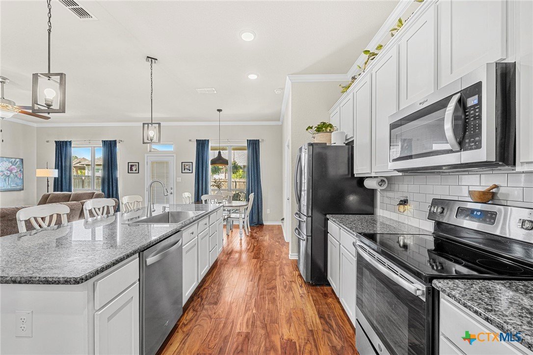 The flow of this home is everything you didn’t know you needed! Designed for comfort, functionality, and everyday living that just feels right. From the moment you walk in, you’ll notice how seamlessly the spaces connect, creating an open yet inviting layout. This 4-bedroom, 2-bath home offers the space you’ve been searching for, paired with thoughtful upgrades throughout. The main living areas feature acacia wood flooring, while the bedrooms bring comfort with soft cashmere carpet. Custom tile flooring in both bathrooms and the laundry room adds durability where it matters most, all complemented by upgraded fixtures that elevate the feel of the home. The kitchen is both stylish and functional, featuring custom white cabinetry, a flat one-piece granite island and plenty of space to gather, prep, and enjoy. The primary bathroom features a custom vanity, dual sinks, a walk-in shower, a spacious closet designed to keep everything organized and plenty of cabinets for added storage. Step outside to enjoy a fully irrigated yard, front and back, along with a full gutter system and fence gates on both sides for added convenience. Roof replaced 2024. All flooring done in 2023.