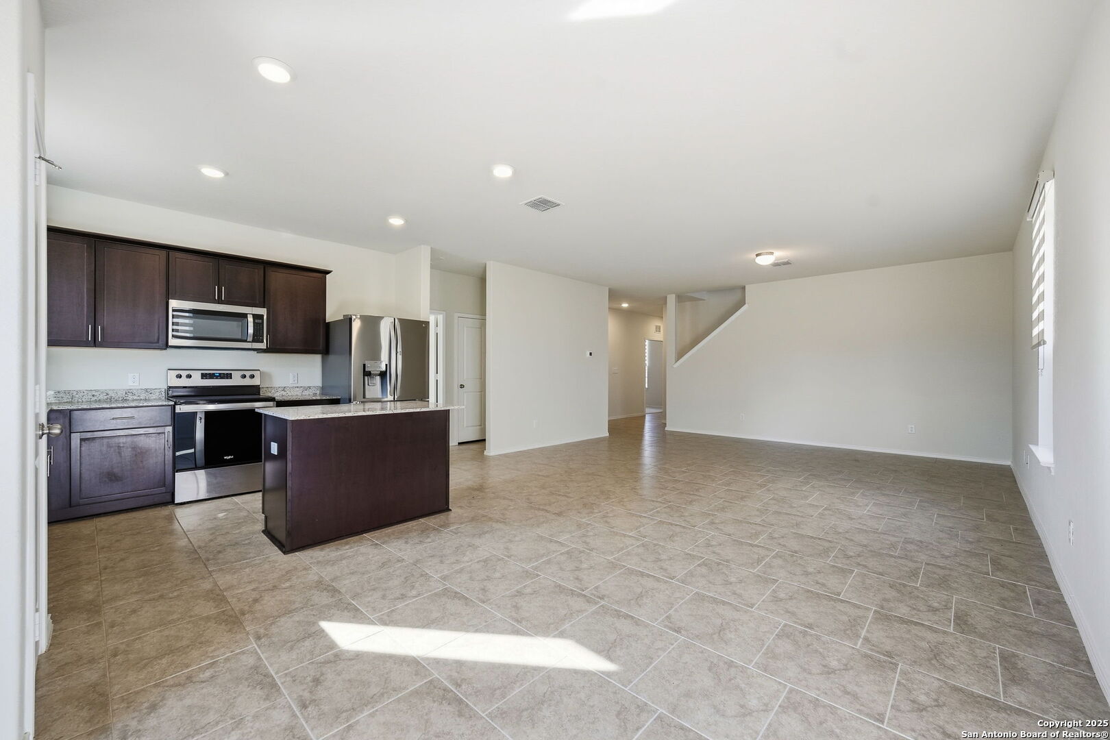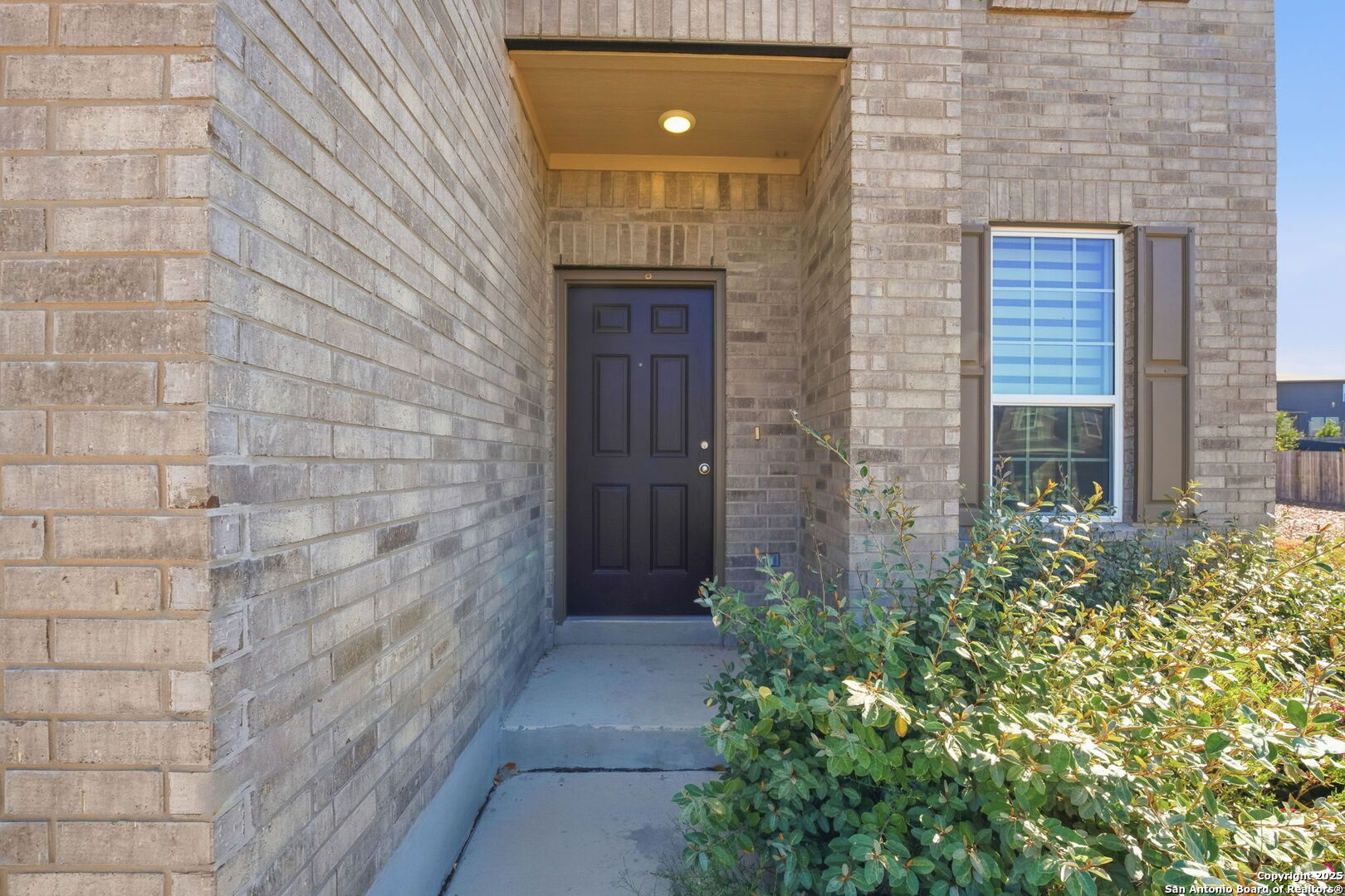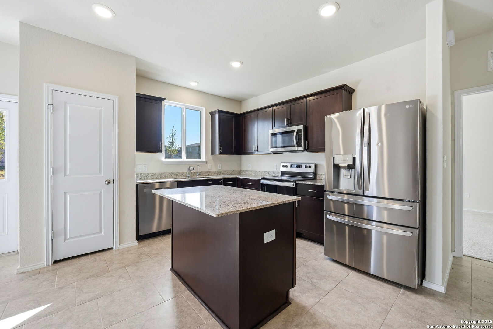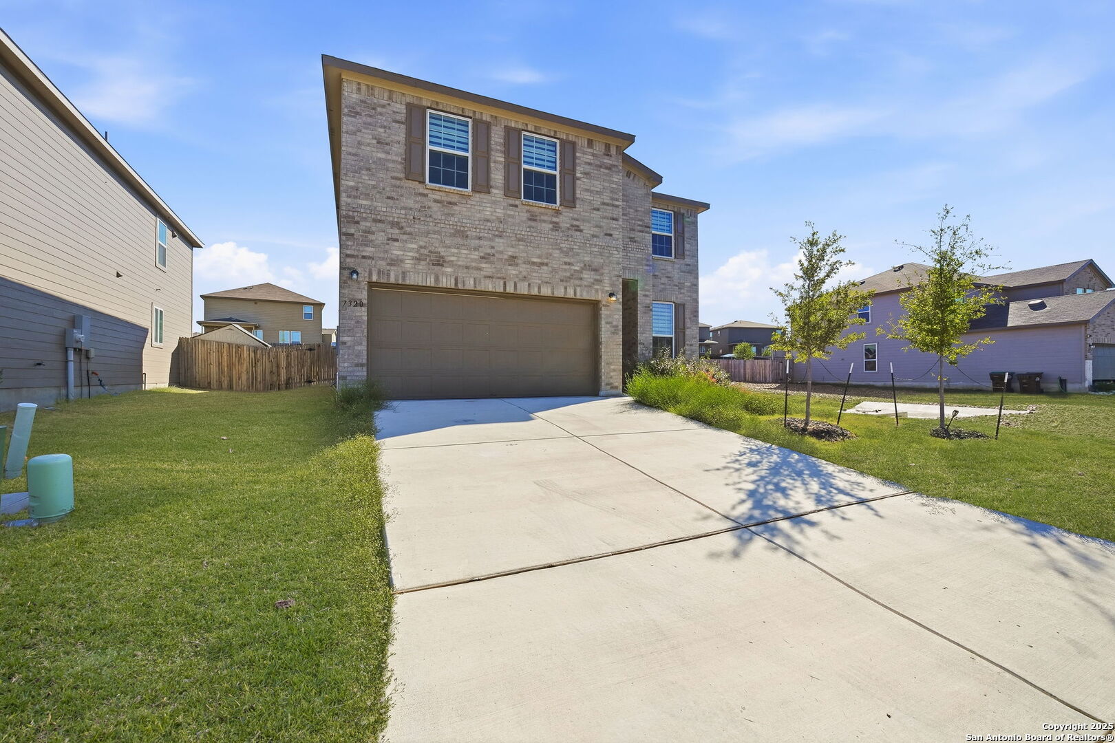 Newer build in the Cinco Lake community, this thoughtfully designed home blends modern style with everyday functionality. The open floor plan highlights recessed lighting, elegant custom blinds in the living area, and rich dark cabinetry paired with granite countertops and stainless steel appliances. A spacious kitchen island adds extra seating and prep space, creating a seamless setting for both cooking and entertaining. A flexible room on the first floor is ideal for a home office or creative studio, while the primary suite on the main level includes a full bath and walk-in closet. Upstairs, a comfortable loft provides additional living space, complemented by a conveniently located laundry room. Additional enhancements include a water softener, gutters, and a fully fenced backyard designed for privacy and easy upkeep. Residents can enjoy community amenities such as a pool and neighborhood park. Located just minutes from Lackland Air Force Base, SeaWorld, and major destinations across San Antonio, with quick access to Loop 1604, shopping, dining, and entertainment.