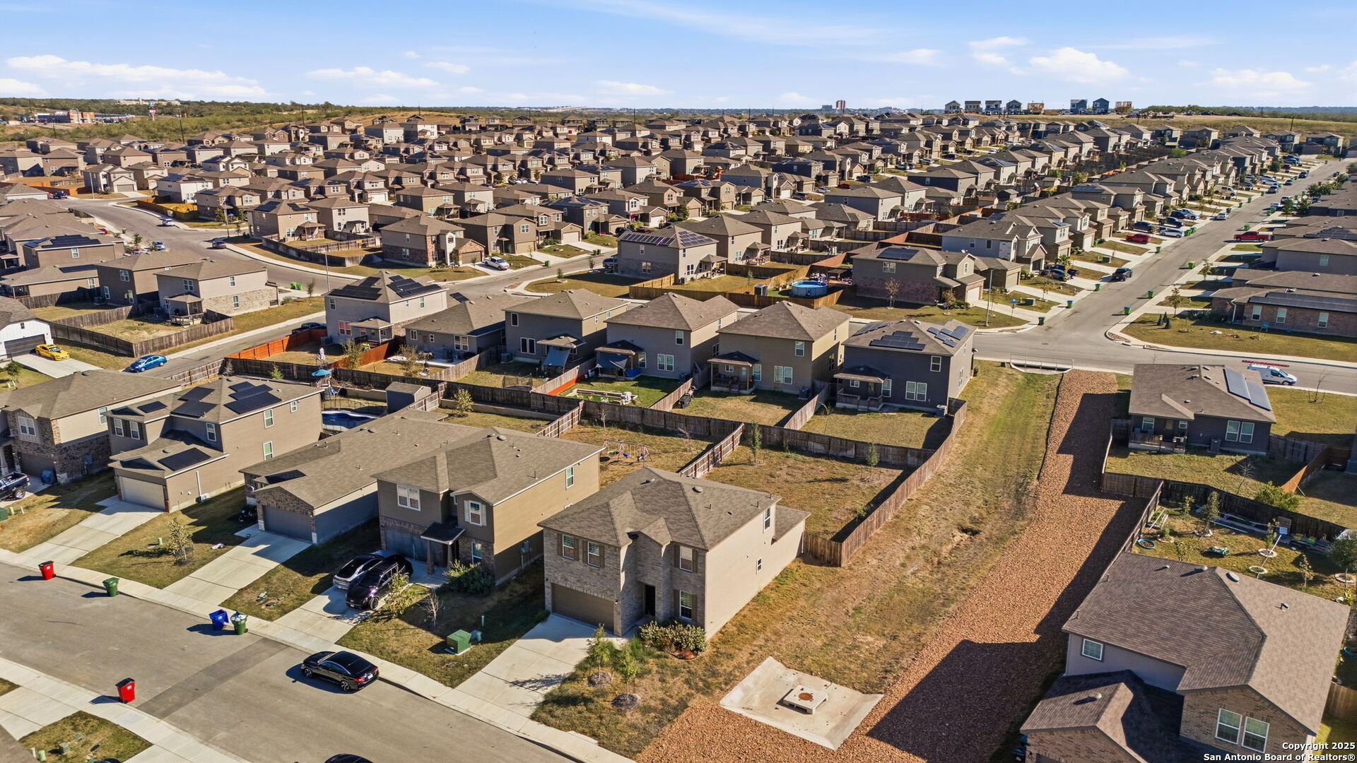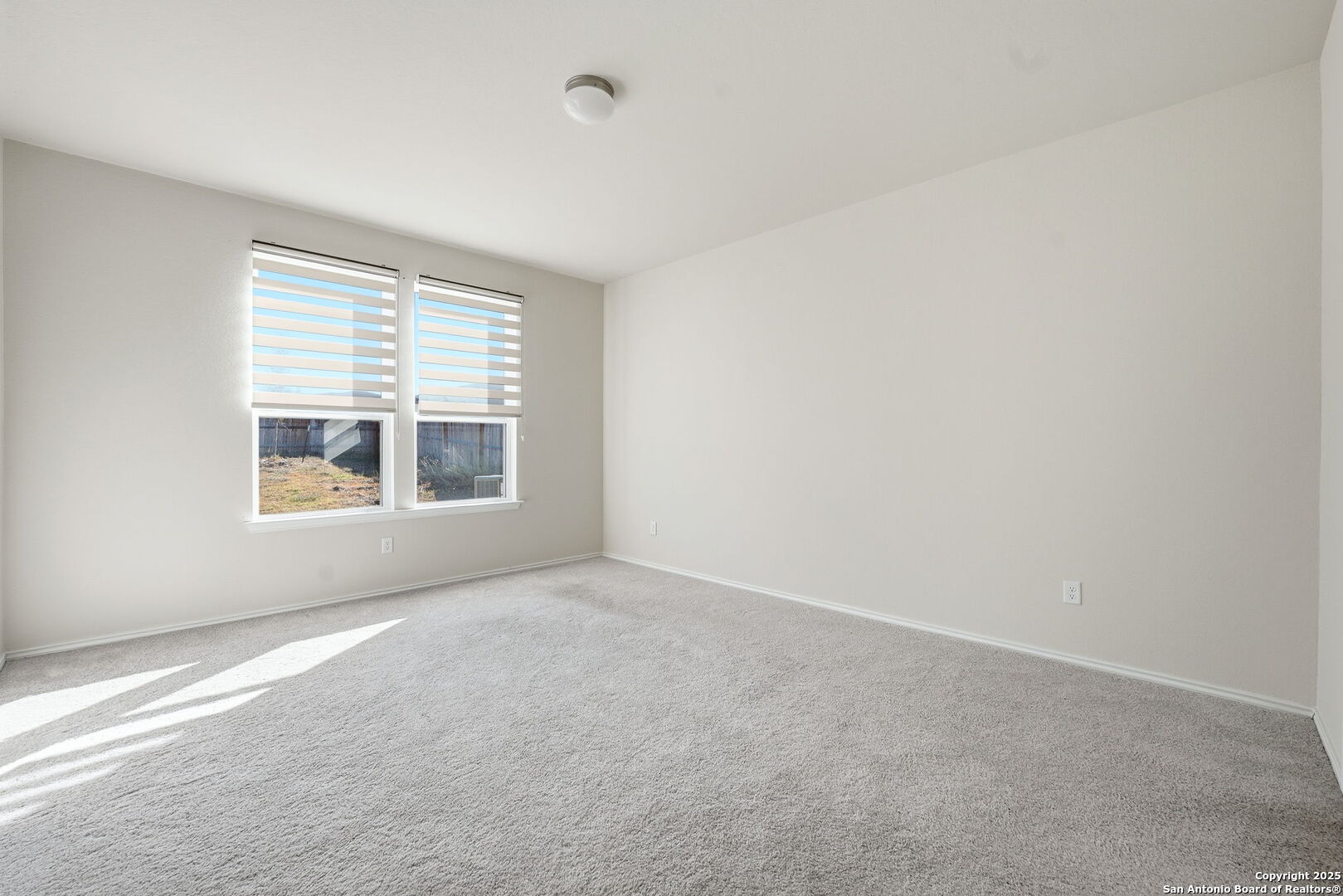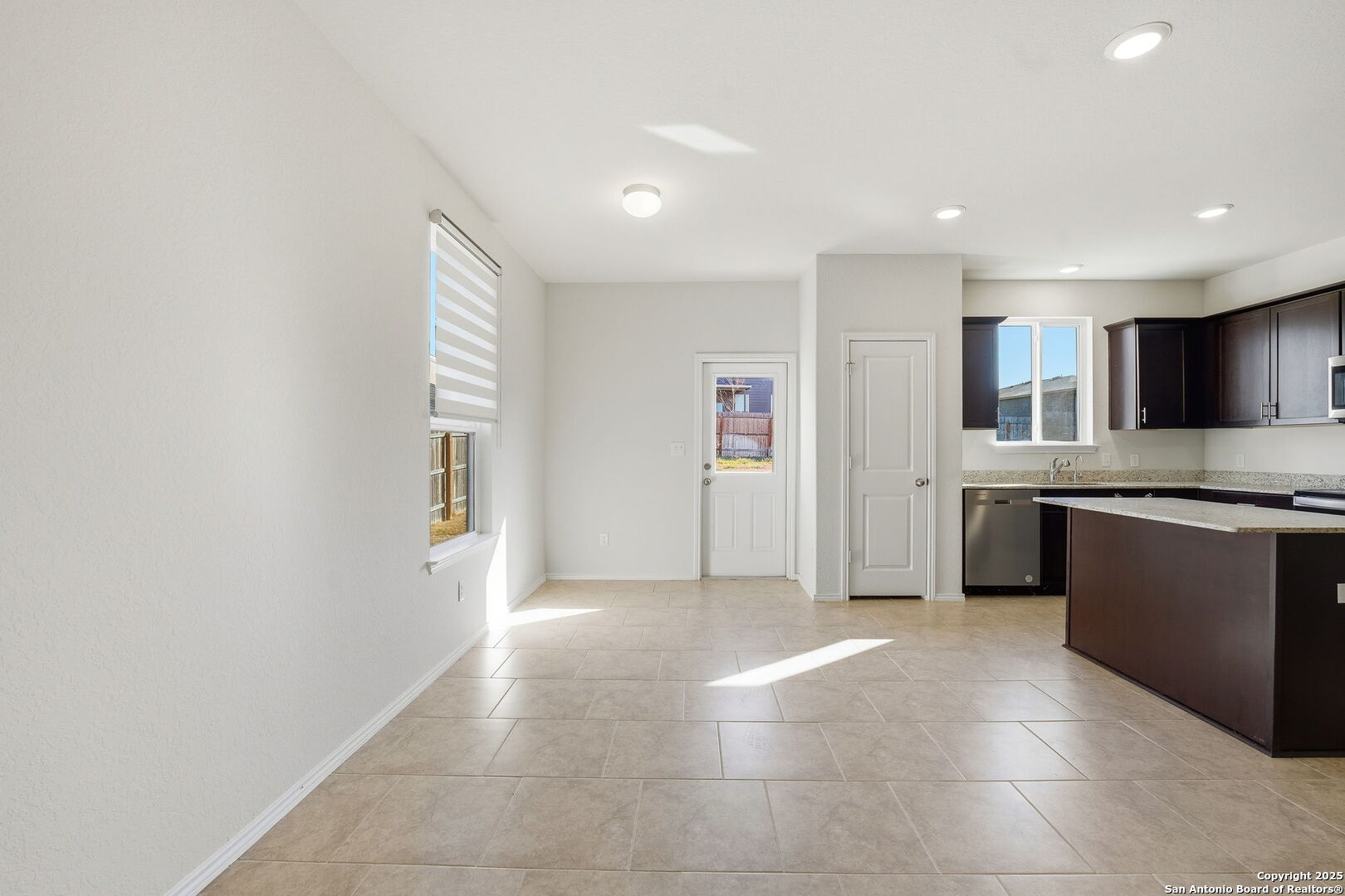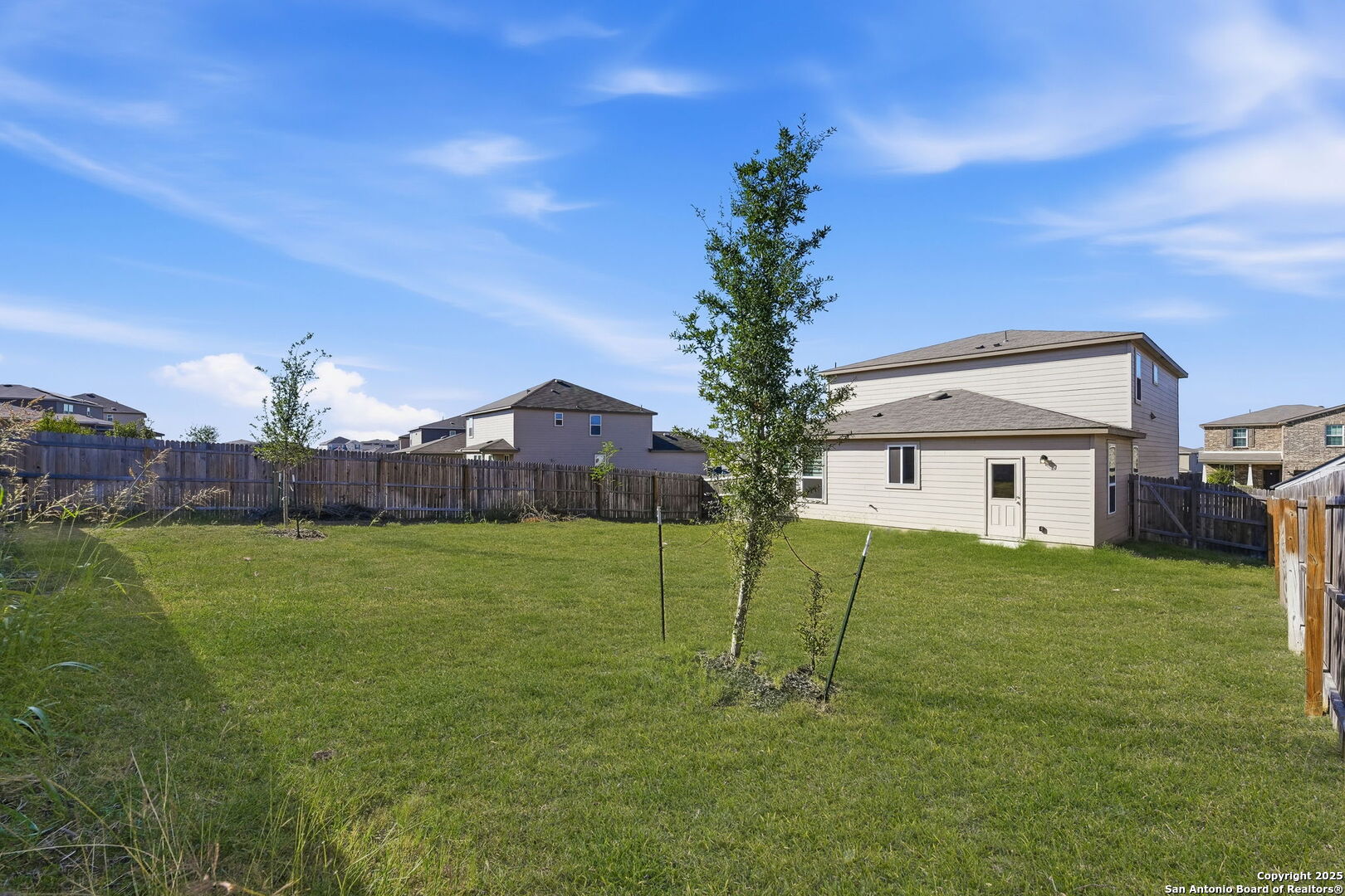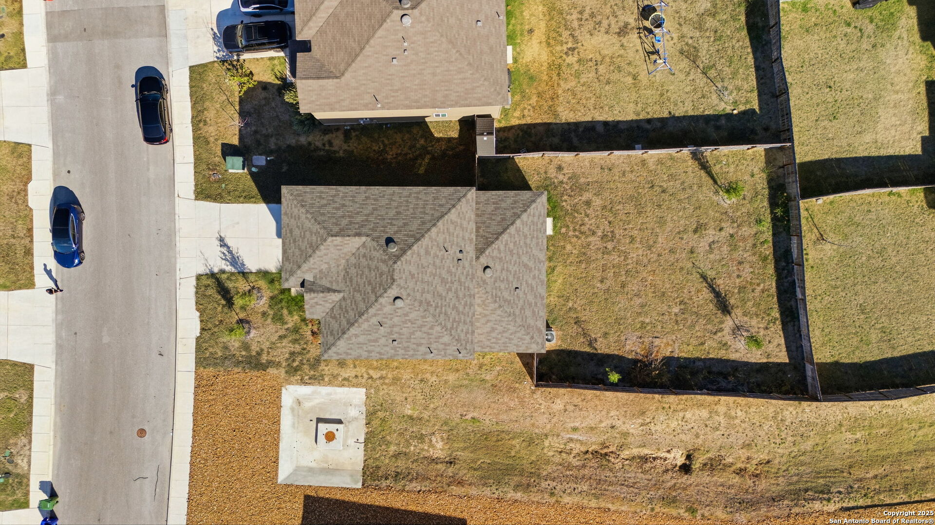 Newer build in the Cinco Lake community, this thoughtfully designed home blends modern style with everyday functionality. The open floor plan highlights recessed lighting, elegant custom blinds in the living area, and rich dark cabinetry paired with granite countertops and stainless steel appliances. A spacious kitchen island adds extra seating and prep space, creating a seamless setting for both cooking and entertaining. A flexible room on the first floor is ideal for a home office or creative studio, while the primary suite on the main level includes a full bath and walk-in closet. Upstairs, a comfortable loft provides additional living space, complemented by a conveniently located laundry room. Additional enhancements include a water softener, gutters, and a fully fenced backyard designed for privacy and easy upkeep. Residents can enjoy community amenities such as a pool and neighborhood park. Located just minutes from Lackland Air Force Base, SeaWorld, and major destinations across San Antonio, with quick access to Loop 1604, shopping, dining, and entertainment.