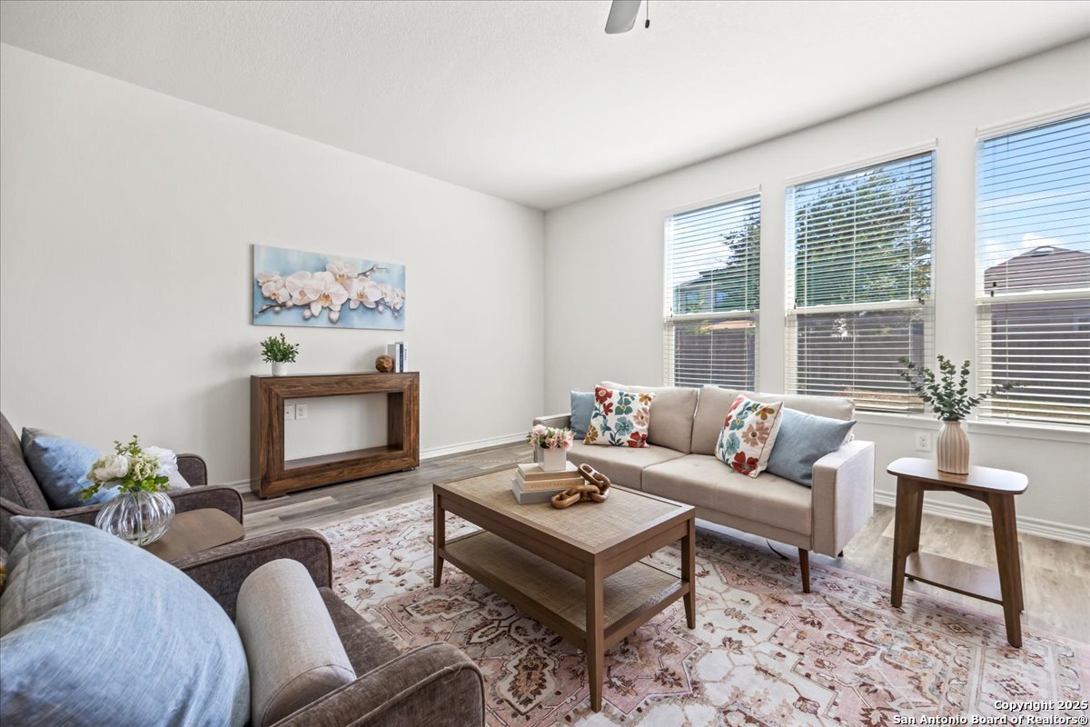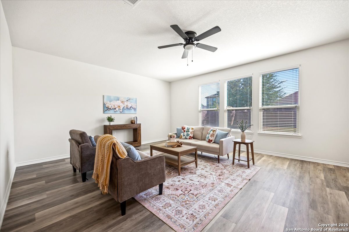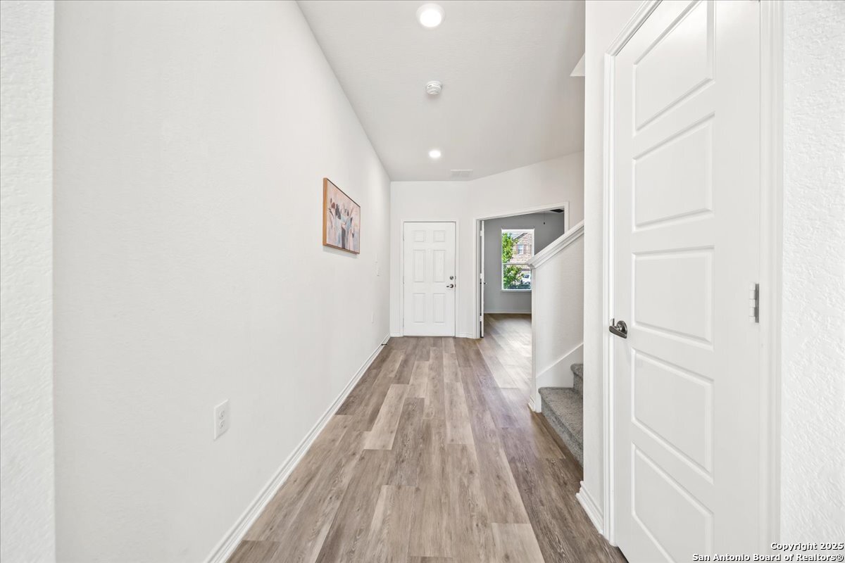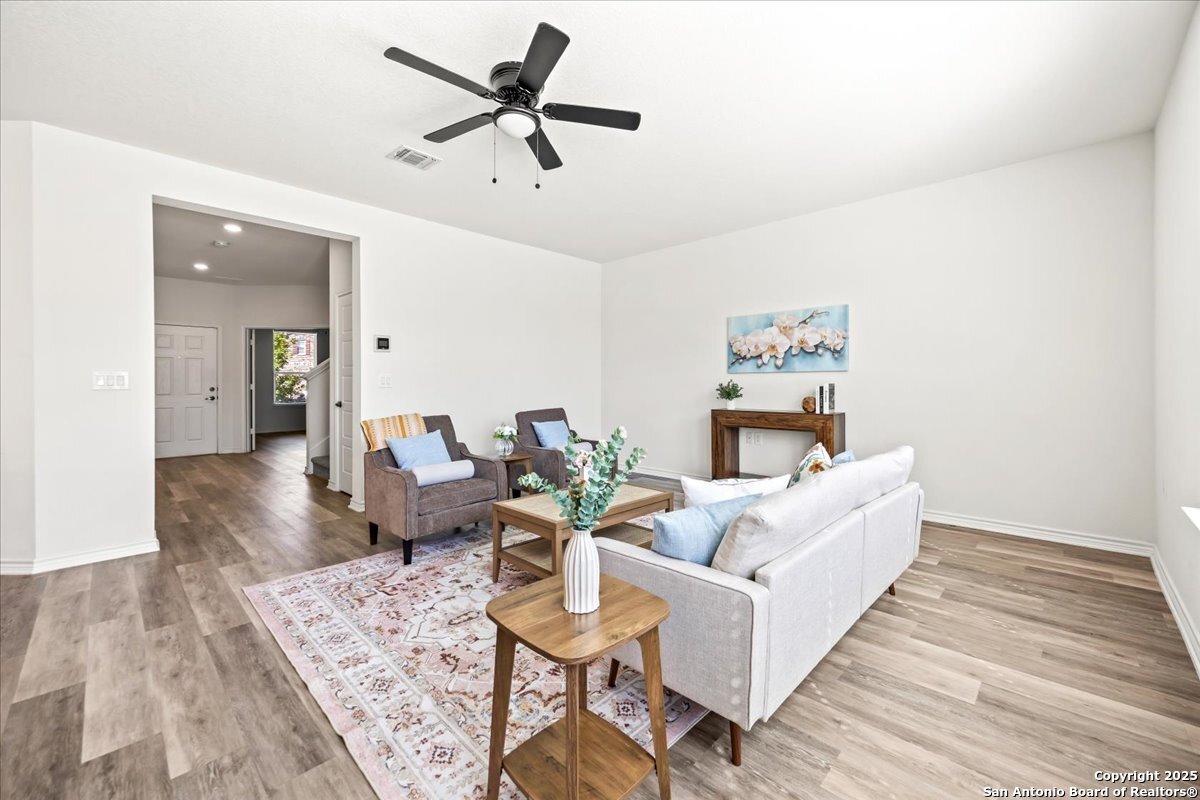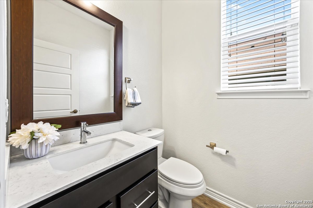 This well-maintained home offers a practical and flexible layout with three bedrooms, two and a half bathrooms, a dedicated office on the main level, and a spacious loft upstairs-ideal as a second living area, game room, or guest space. Natural light fills the home, highlighting its clean design and upgraded features. The kitchen and bathrooms feature upgraded quartz countertops, offering both durability and a modern touch. Luxury vinyl plank flooring throughout the first level adds comfort and ease of maintenance. The oversized primary bedroom provides a quiet retreat, with enough space for a sitting area or additional furniture. The adjoining bathroom includes a walk-in closet and a stand-alone shower in the owner's retreat. The garage has been finished with epoxy flooring, creating a polished and functional space for storage or automotive work. Conveniently located near major roads in San Antonio, this home offers quick access to shopping, schools, and daily essentials. Welcome home!