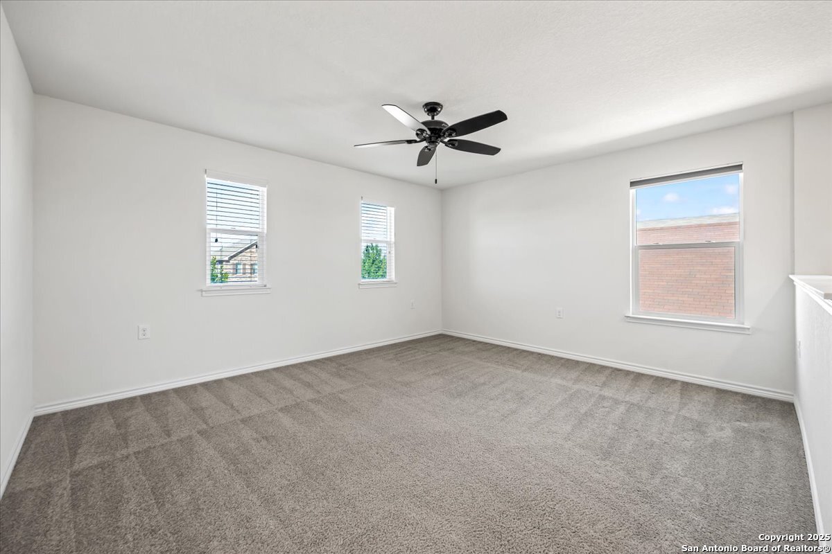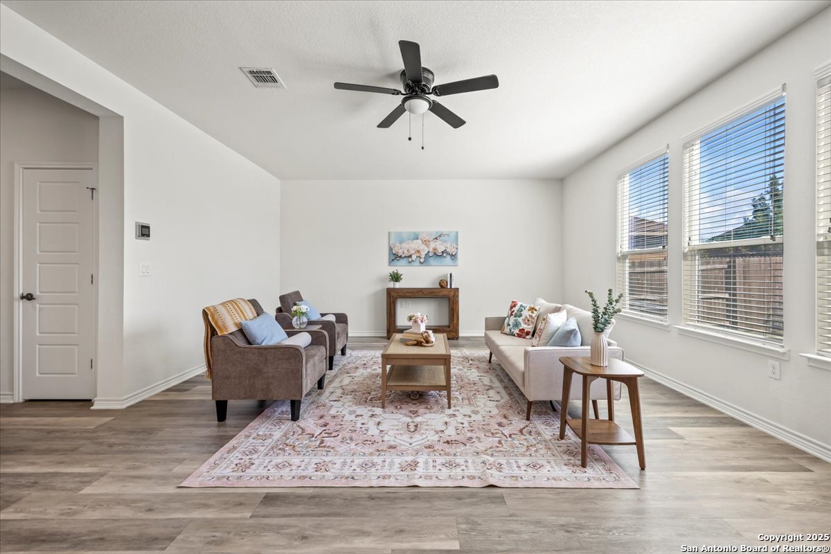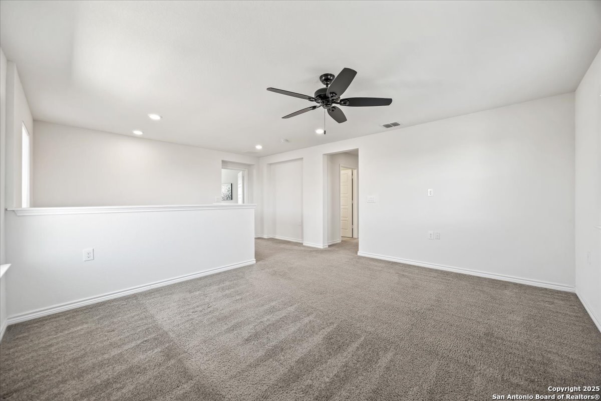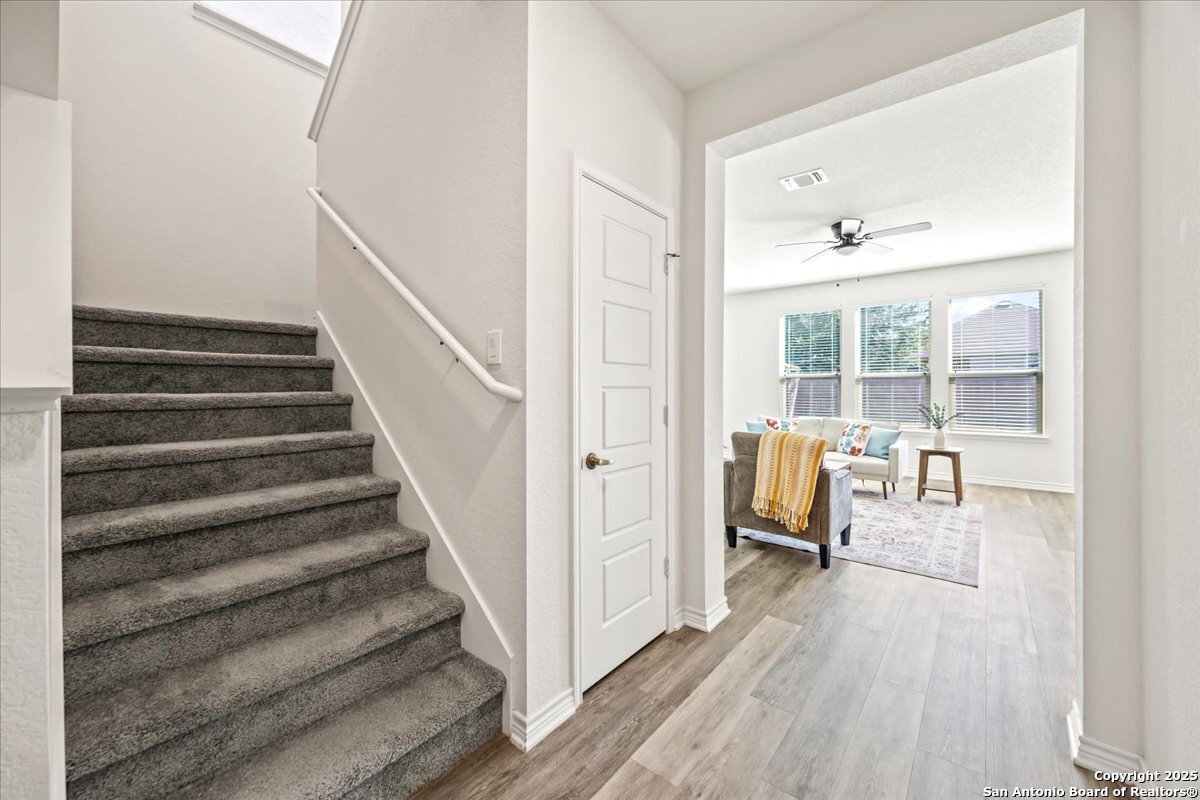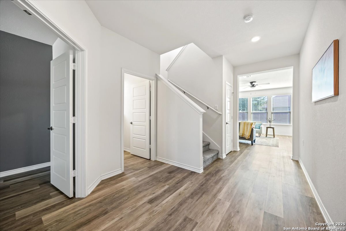 This well-maintained home offers a practical and flexible layout with three bedrooms, two and a half bathrooms, a dedicated office on the main level, and a spacious loft upstairs-ideal as a second living area, game room, or guest space. Natural light fills the home, highlighting its clean design and upgraded features. The kitchen and bathrooms feature upgraded quartz countertops, offering both durability and a modern touch. Luxury vinyl plank flooring throughout the first level adds comfort and ease of maintenance. The oversized primary bedroom provides a quiet retreat, with enough space for a sitting area or additional furniture. The adjoining bathroom includes a walk-in closet and a stand-alone shower in the owner's retreat. The garage has been finished with epoxy flooring, creating a polished and functional space for storage or automotive work. Conveniently located near major roads in San Antonio, this home offers quick access to shopping, schools, and daily essentials. Welcome home!