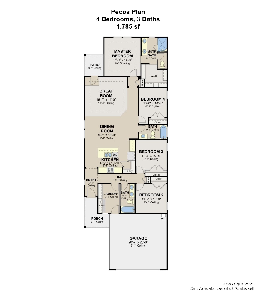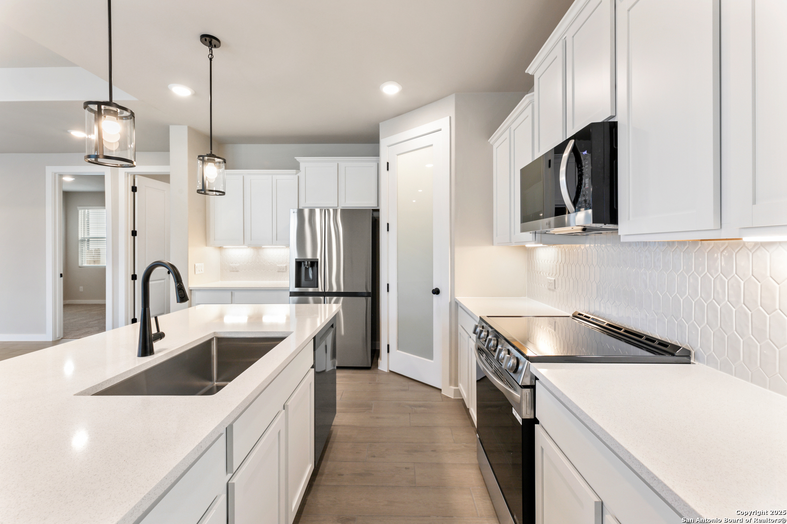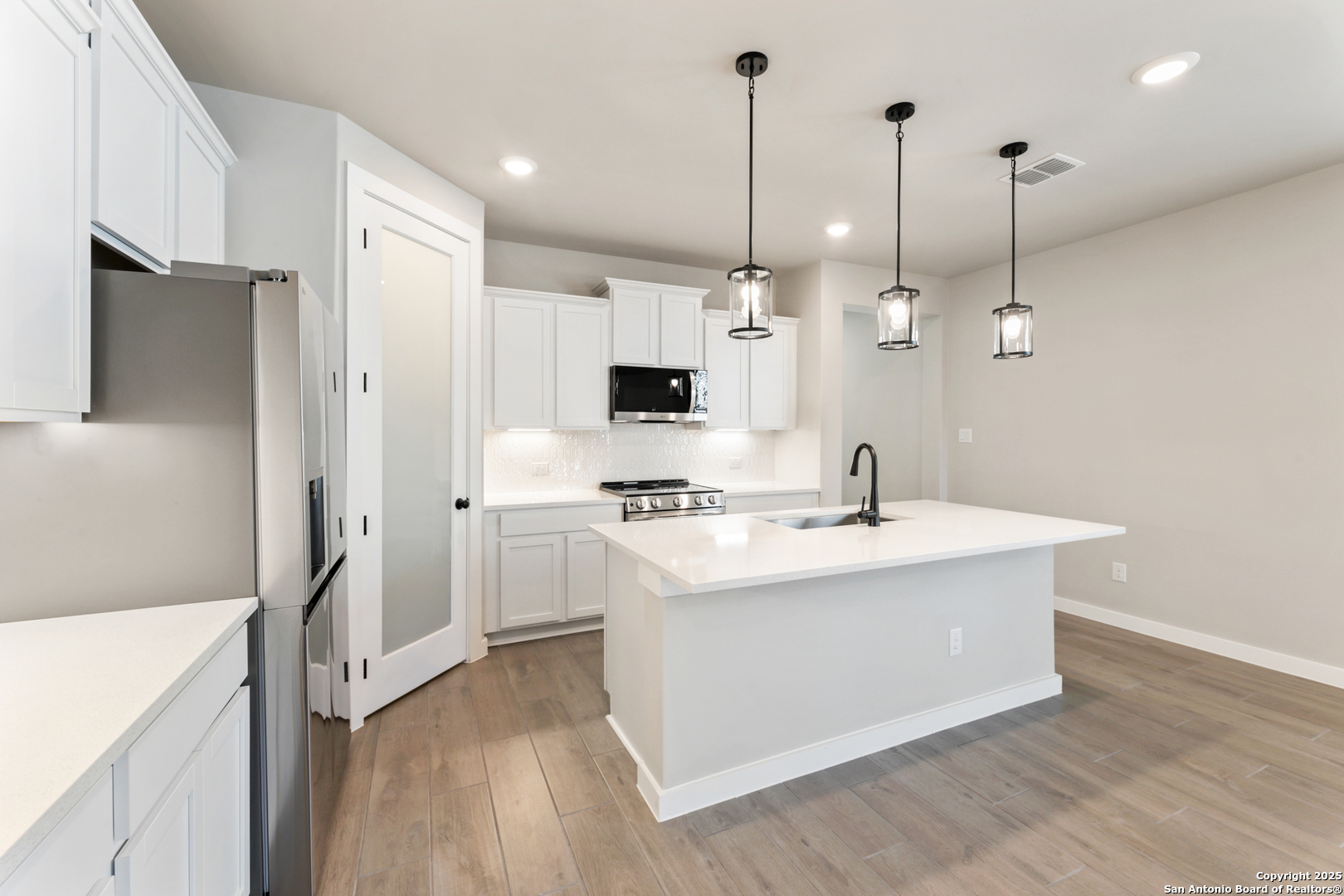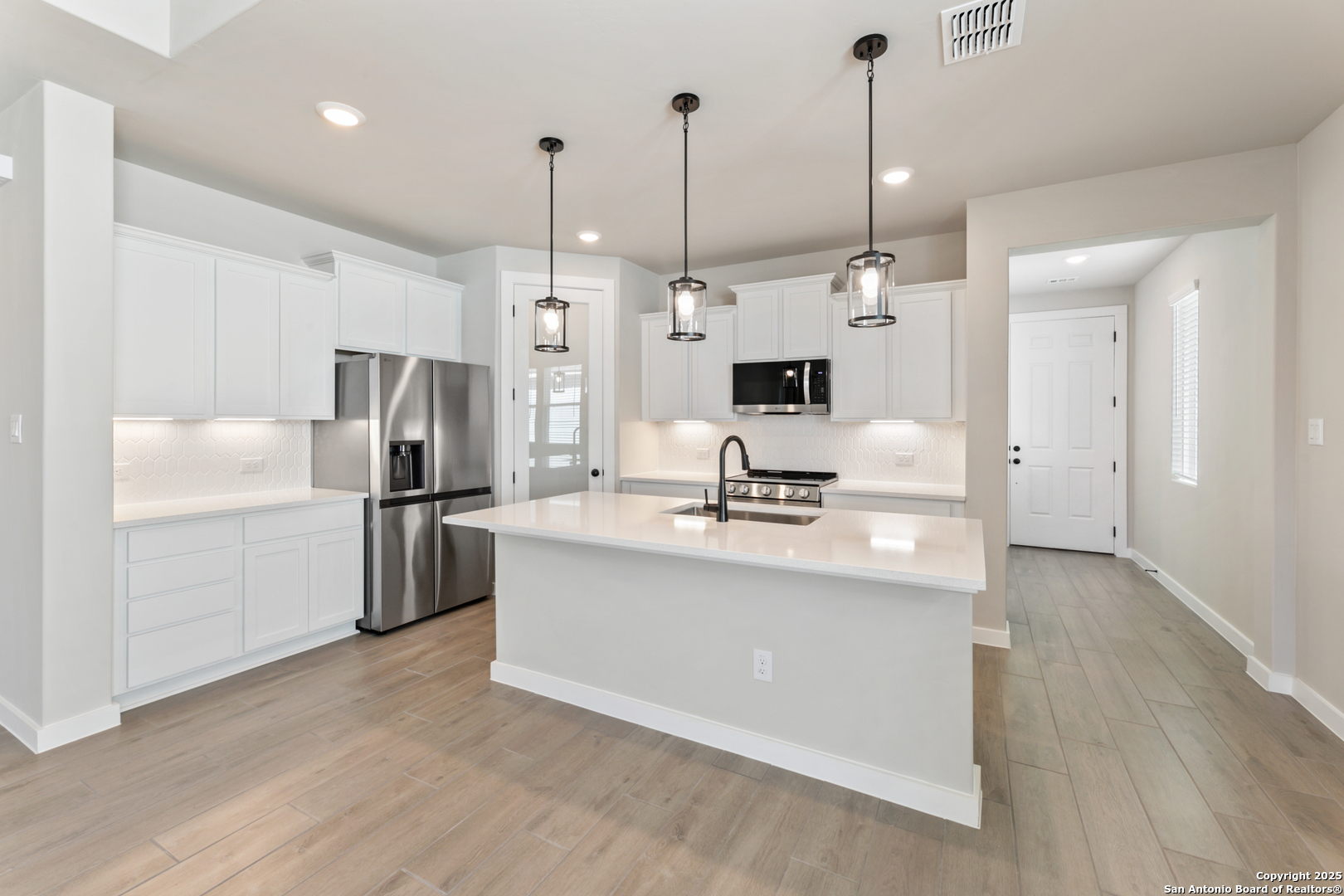The Pecos Plan in Highland Ridge is built on a desirable home site with no rear neighbors, offering added privacy and welcome shade on the covered patio in the late afternoon and evening. The charming front elevation features board-and-batten styling with stone accents and an 8-ft front door set back from the front of the garage for added dimension. Inside, wood-look tile sprawls throughout the open-concept main living areas. The kitchen is bright and modern with white quartz countertops, white cabinets, a gleaming white hex tile backsplash, black pendant lights, and under-cabinet lighting. A sleek stainless steel and black glass-top electric range is paired with a built-in microwave above, while the large island features a single-bowl stainless steel sink. The walk-in pantry is accented by an 8-ft frosted glass door. The Great Room is open and inviting, anchored by a 10-ft high coffered ceiling. Throughout the home, 8-ft interior doors and black plumbing, lighting, and hardware details create a unified and contemporary aesthetic. The master bedroom suite includes a tray ceiling and a spacious en-suite bath with dual vanities, an oversized walk-in shower with drop-in tile floor and glass enclosure, a private water closet, and a walk-in closet. Two secondary bedrooms are located in a separate wing of the home and share a full bathroom. A third secondary bedroom is situated off the main living areas, closer to the master bedroom, making it an ideal space for a nursery or private guest room with its own full bath. For more information on this home, please visit our Hakes Brothers model home in Highland Ridge today!