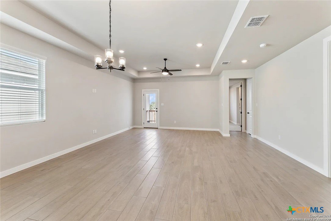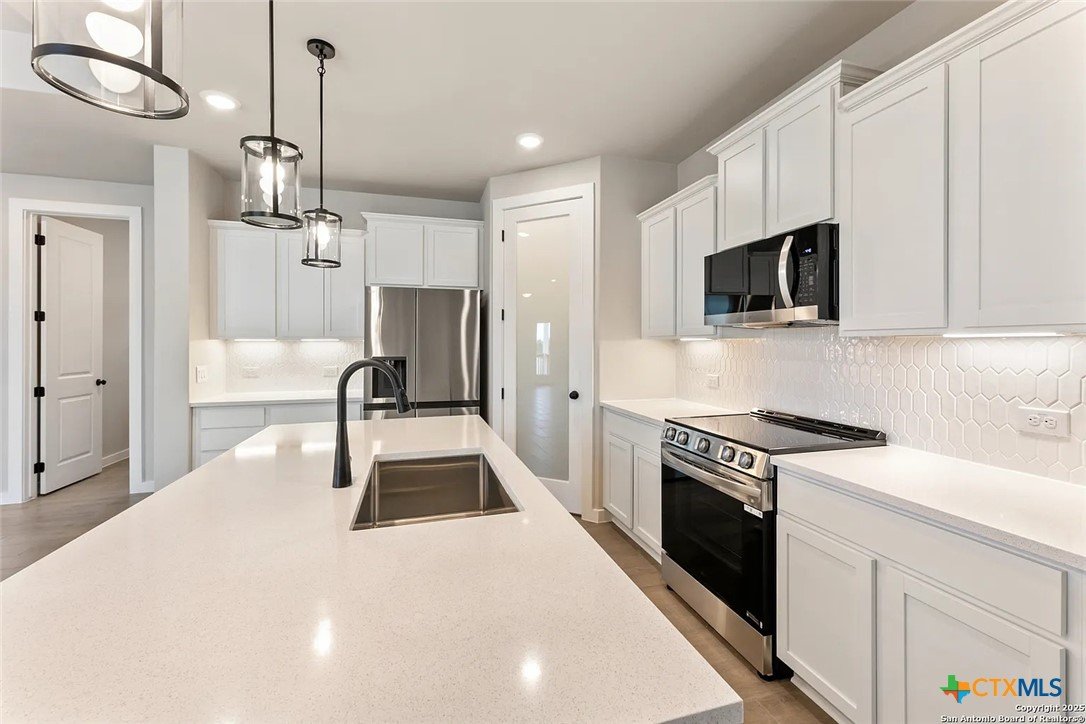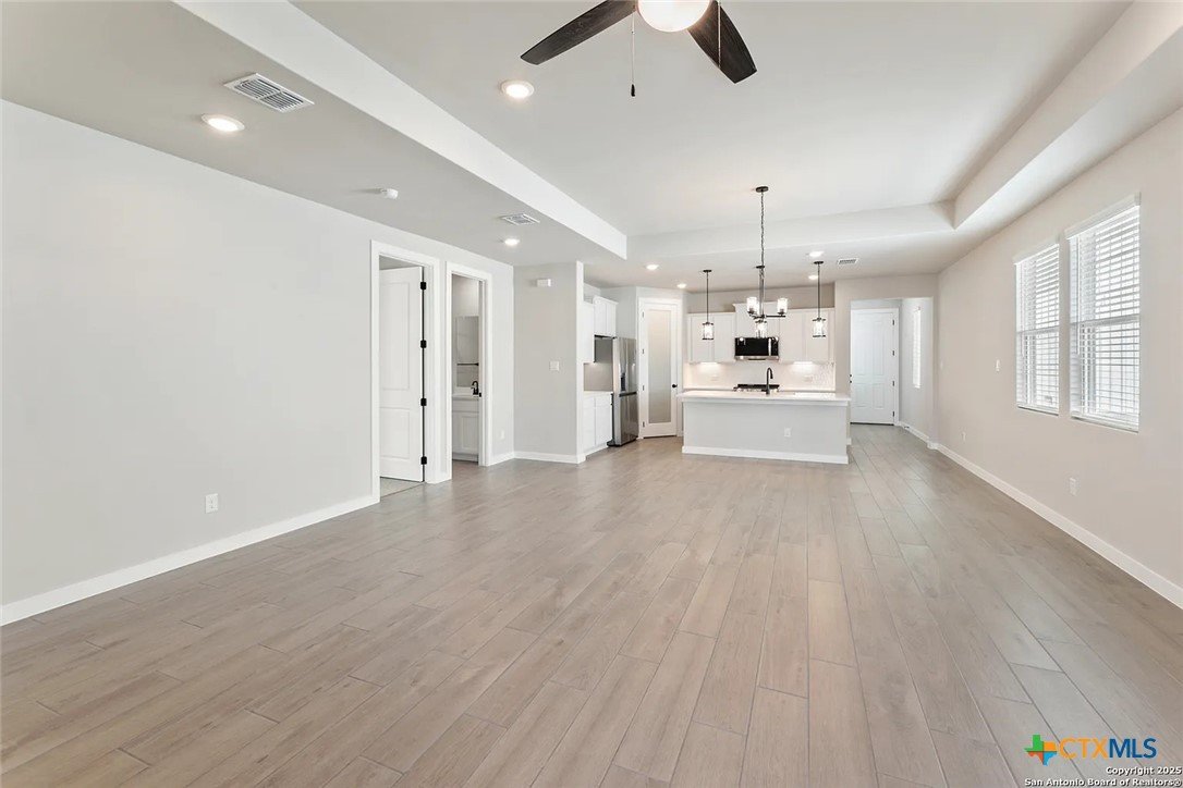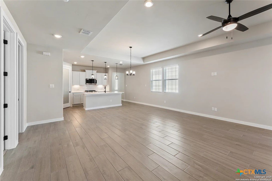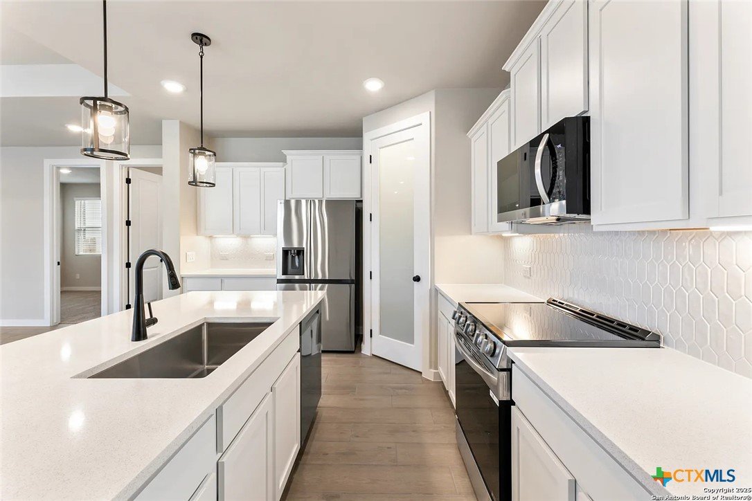 The Pecos Plan in Highland Ridge is built on a desirable home site with no rear neighbors, offering added privacy and welcome shade on the covered patio in the late afternoon and evening. The charming front elevation features board-and-batten styling with stone accents and an 8-ft front door set back from the front of the garage for added dimension. Inside, wood-look tile sprawls throughout the open-concept main living areas. The kitchen is bright and modern with white quartz countertops, white cabinets, a gleaming white hex tile backsplash, black pendant lights, and under-cabinet lighting. A sleek stainless steel and black glass-top electric range is paired with a built-in microwave above, while the large island features a single-bowl stainless steel sink. The walk-in pantry is accented by an 8-ft frosted glass door. The Great Room is open and inviting, anchored by a 10-ft high coffered ceiling. Throughout the home, 8-ft interior doors and black plumbing, lighting, and hardware details create a unified and contemporary aesthetic. The master bedroom suite includes a tray ceiling and a spacious en-suite bath with dual vanities, an oversized walk-in shower with drop-in tile floor and glass enclosure, a private water closet, and a walk-in closet. Two secondary bedrooms are located in a separate wing of the home and share a full bathroom. A third secondary bedroom is situated off the main living areas, closer to the master bedroom, making it an ideal space for a nursery or private guest room with its own full bath. For more information on this home, please visit our Hakes Brothers model home in Highland Ridge today!