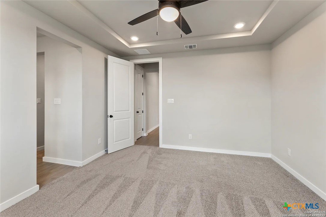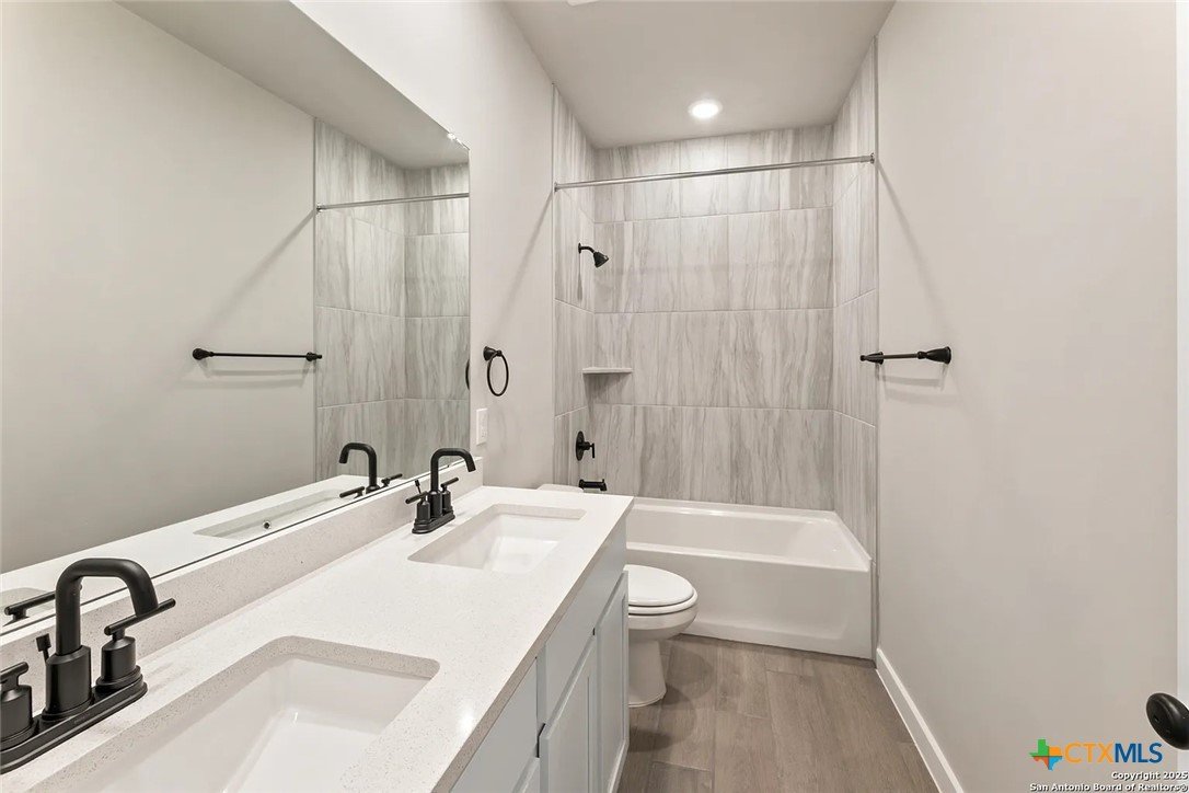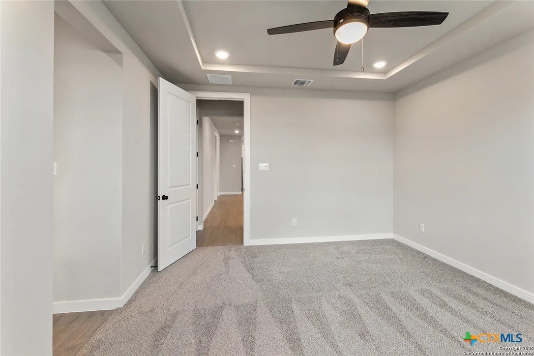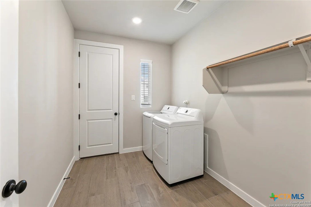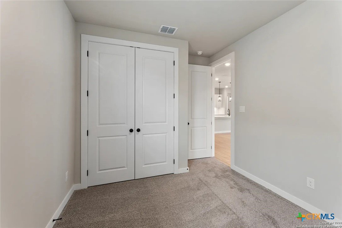 The Pecos Plan in Highland Ridge is built on a desirable home site with no rear neighbors, offering added privacy and welcome shade on the covered patio in the late afternoon and evening. The charming front elevation features board-and-batten styling with stone accents and an 8-ft front door set back from the front of the garage for added dimension. Inside, wood-look tile sprawls throughout the open-concept main living areas. The kitchen is bright and modern with white quartz countertops, white cabinets, a gleaming white hex tile backsplash, black pendant lights, and under-cabinet lighting. A sleek stainless steel and black glass-top electric range is paired with a built-in microwave above, while the large island features a single-bowl stainless steel sink. The walk-in pantry is accented by an 8-ft frosted glass door. The Great Room is open and inviting, anchored by a 10-ft high coffered ceiling. Throughout the home, 8-ft interior doors and black plumbing, lighting, and hardware details create a unified and contemporary aesthetic. The master bedroom suite includes a tray ceiling and a spacious en-suite bath with dual vanities, an oversized walk-in shower with drop-in tile floor and glass enclosure, a private water closet, and a walk-in closet. Two secondary bedrooms are located in a separate wing of the home and share a full bathroom. A third secondary bedroom is situated off the main living areas, closer to the master bedroom, making it an ideal space for a nursery or private guest room with its own full bath. For more information on this home, please visit our Hakes Brothers model home in Highland Ridge today!