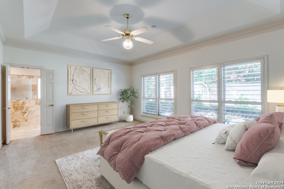 Hidden gem nestled in the sought-after Woods subdivision of Sonterra's gated community, this one-story features impressive floor-to-ceiling windows in the main living space, showcasing the inviting in-ground pool and waterfall, mature-live oaks, and a covered patio perfect for entertaining. The adjoining backyard oasis features lush landscaping and an outdoor grill, ideal for dining al fresco, or enjoying your morning coffee. Inside, the chef's kitchen is complete with stainless steel appliances, ample storage space, and generous counter space for island cooking. The large utility room adjacent to the kitchen also has a conveniently located half bathroom for guests and when entering from the garage. The primary bedroom is privately located in the back of the home and has a remodeled bathroom en suite, including an oversized zero-entry shower as well as dual walk-in closets and vanities. The house has two additional bedrooms off the main hallway: one with an en-suite bathroom and another with a hallway-bathroom entrance. A flexible, separate office space/fourth bedroom off the hallway provides both plenty of separate spaces while maintaining the cohesiveness of the single floor. Recessed lighting, cabinetry and plantation shutters are just a few custom details throughout the home, bolstered by ample natural light, vaulted ceilings, crown moulding, ceiling fans and a cozy double-sided wood burning fireplace connecting both living areas. The oversized attached 2-car garage is ideal for storage and refrigeration. Perhaps its best asset is the prime location: tucked away in a quiet corner of the neighborhood, this custom home can provide easy access to the club, golf, swimming pool, tennis courts, shopping and nearby restaurants via golf cart.