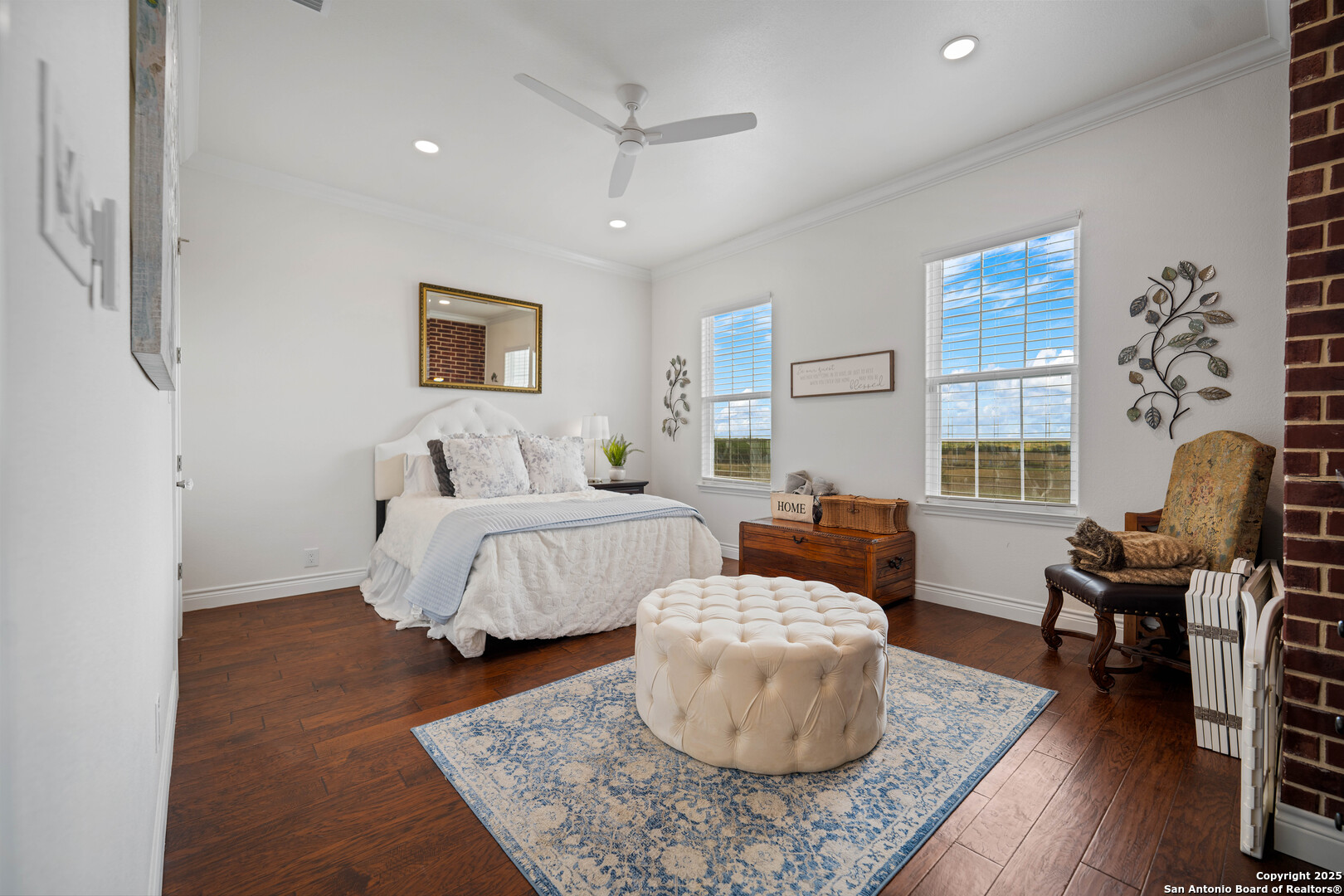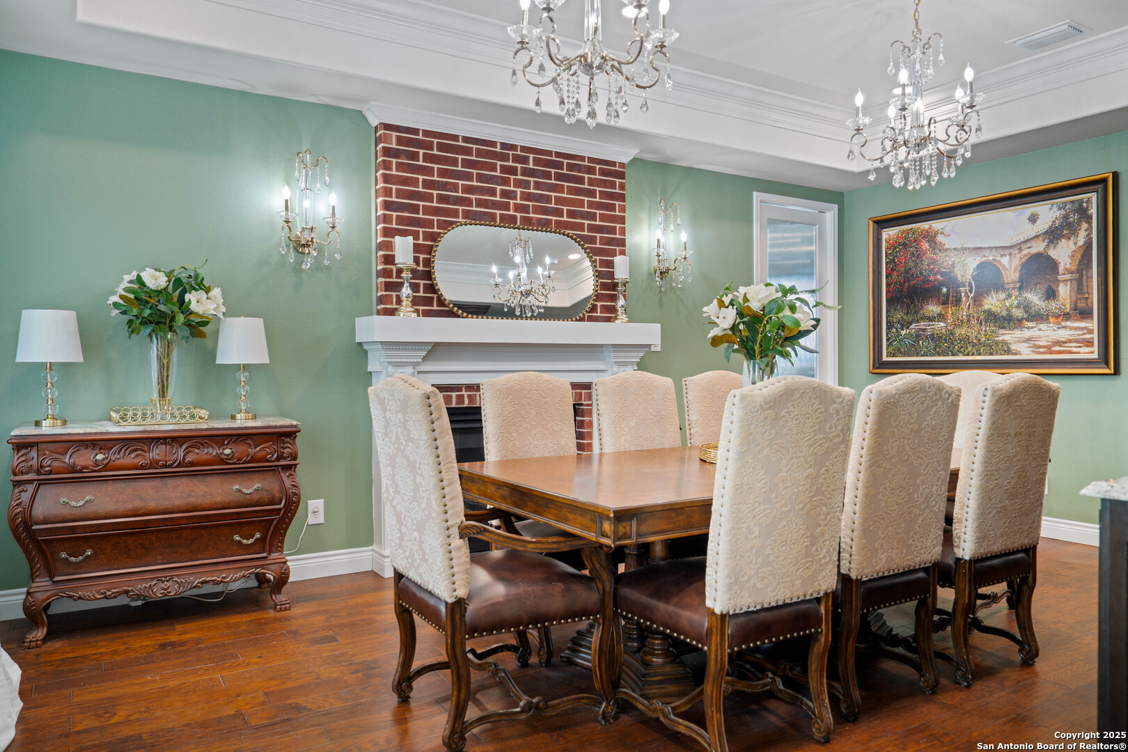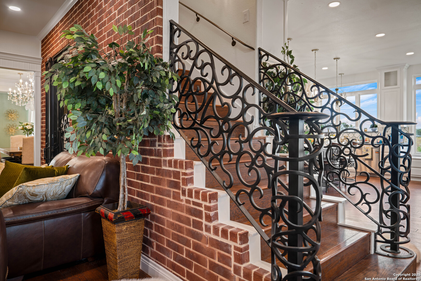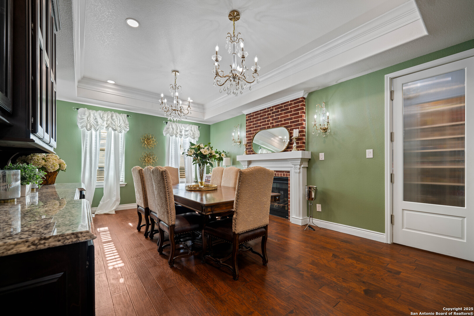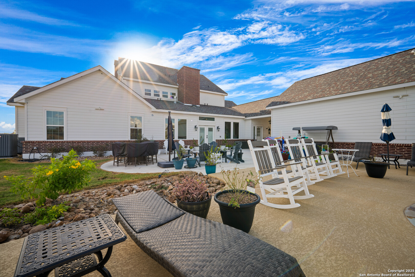 Experience timeless elegance in this stunning two-story Colonial estate, perfectly situated on 5 fully fenced acres. Offering up to 8 bedrooms and 5.5 bathrooms, this residence is ideal for multi-generational living, those who love to host in style, or possibly an event destination. Step into the grand foyer, where the formal dining room graces the left and the formal living room sits to the right-both featuring cozy fireplaces and custom built-ins. Beyond the main staircase, the Great Room beckons with its stately fireplace, built-in entertainment center, and a sophisticated wet bar. The chef's kitchen boasts high-end appliances, including a gas Thermador stove with pot-filler, double ovens, two dishwashers, a large island with prep sink, a farm sink, and a walk-in pantry. A beautiful Butler's Pantry connects to the dining room, while the adjoining keeping room offers a relaxed gathering space. Nearby, the mudroom-with built-in benches and storage, a powder room, and a dedicated dog-wash station-provides exceptional functionality. A spacious laundry room with abundant storage and a back staircase complete this wing of the home. The primary suite, located on the main floor, features a tray ceiling, crown molding, and two walk-in closets (one with a vanity). The spa-like primary bath includes separate sinks, a jetted soaking tub, walk-in shower with 3 digitally controlled shower heads, and water closet. A guest bedroom and full bath are also conveniently located on the first floor. Upstairs, you'll find two bedrooms with private en-suites, two bedrooms sharing a Jack & Jill bath, plus two additional rooms currently serving as a media room and craft room. A sunroom behind the Great Room offers sweeping views of the outdoor oasis, complete with a sparkling in-ground pool. A covered breezeway connects the home to the 3-car garage, which includes a fully floored attic for storage accessed by a permanent staircase. The 3rd floor attic of the house is also floored for more storage and accessed by a full staircase. Beyond the garage is a 320+/- sqft, air-conditioned storage building, livestock shed and pen. Additional features include high ceilings, wood floors, marble and granite countertops, chandeliers, ceiling fans, walk-in closets, 2 tankless water heaters, 3 HVAC units, water softener, and dual tank aerobic septic system. Outside, the homes elegance starts at the gated, brick front entrance with controlled access and continues up the concrete drive and large circular driveway. This exceptional property blends traditional charm, luxurious finishes, and thoughtful amenities-all within a serene, private setting.