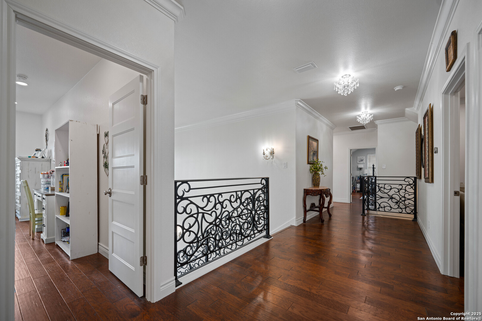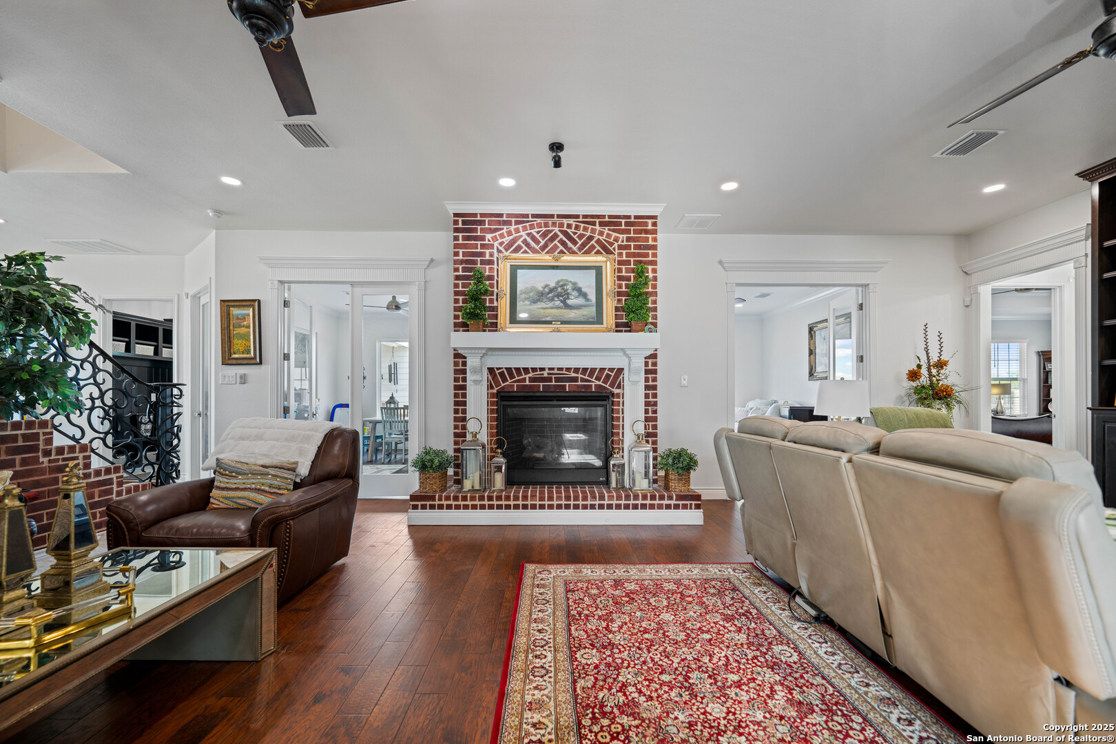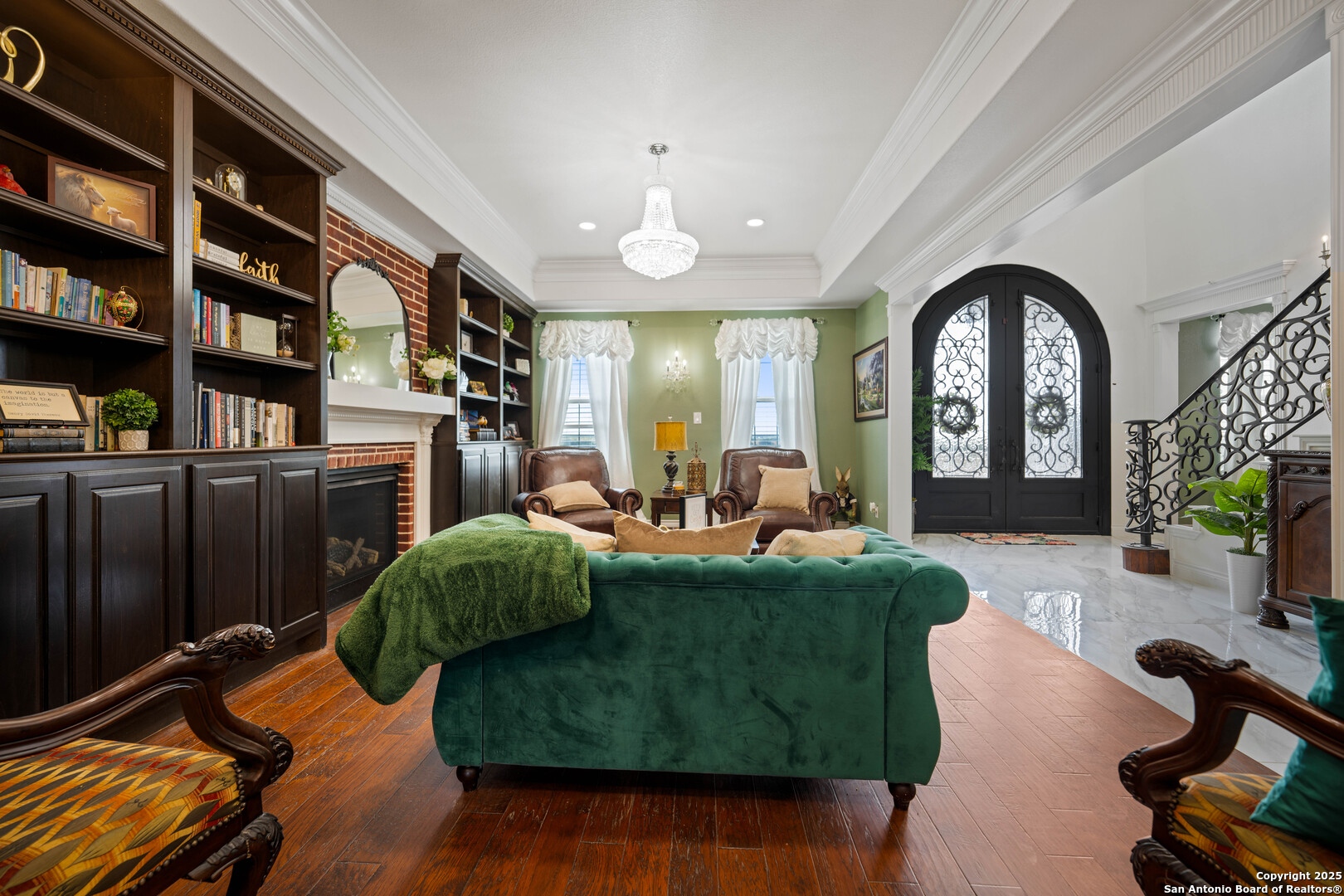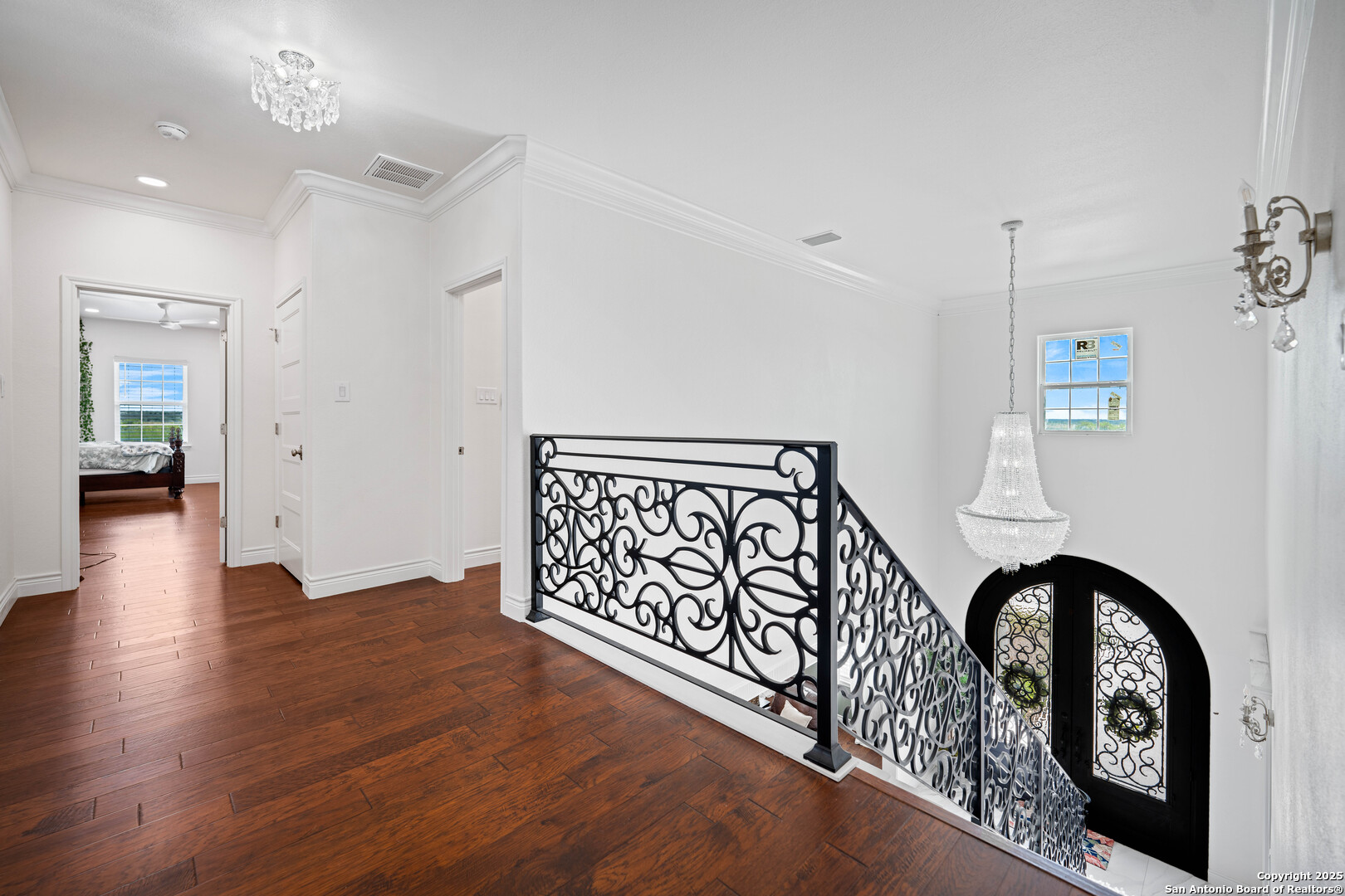 Experience timeless elegance in this stunning two-story Colonial estate, perfectly situated on 5 fully fenced acres. Offering up to 8 bedrooms and 5.5 bathrooms, this residence is ideal for multi-generational living, those who love to host in style, or possibly an event destination. Step into the grand foyer, where the formal dining room graces the left and the formal living room sits to the right-both featuring cozy fireplaces and custom built-ins. Beyond the main staircase, the Great Room beckons with its stately fireplace, built-in entertainment center, and a sophisticated wet bar. The chef's kitchen boasts high-end appliances, including a gas Thermador stove with pot-filler, double ovens, two dishwashers, a large island with prep sink, a farm sink, and a walk-in pantry. A beautiful Butler's Pantry connects to the dining room, while the adjoining keeping room offers a relaxed gathering space. Nearby, the mudroom-with built-in benches and storage, a powder room, and a dedicated dog-wash station-provides exceptional functionality. A spacious laundry room with abundant storage and a back staircase complete this wing of the home. The primary suite, located on the main floor, features a tray ceiling, crown molding, and two walk-in closets (one with a vanity). The spa-like primary bath includes separate sinks, a jetted soaking tub, walk-in shower with 3 digitally controlled shower heads, and water closet. A guest bedroom and full bath are also conveniently located on the first floor. Upstairs, you'll find two bedrooms with private en-suites, two bedrooms sharing a Jack & Jill bath, plus two additional rooms currently serving as a media room and craft room. A sunroom behind the Great Room offers sweeping views of the outdoor oasis, complete with a sparkling in-ground pool. A covered breezeway connects the home to the 3-car garage, which includes a fully floored attic for storage accessed by a permanent staircase. The 3rd floor attic of the house is also floored for more storage and accessed by a full staircase. Beyond the garage is a 320+/- sqft, air-conditioned storage building, livestock shed and pen. Additional features include high ceilings, wood floors, marble and granite countertops, chandeliers, ceiling fans, walk-in closets, 2 tankless water heaters, 3 HVAC units, water softener, and dual tank aerobic septic system. Outside, the homes elegance starts at the gated, brick front entrance with controlled access and continues up the concrete drive and large circular driveway. This exceptional property blends traditional charm, luxurious finishes, and thoughtful amenities-all within a serene, private setting.