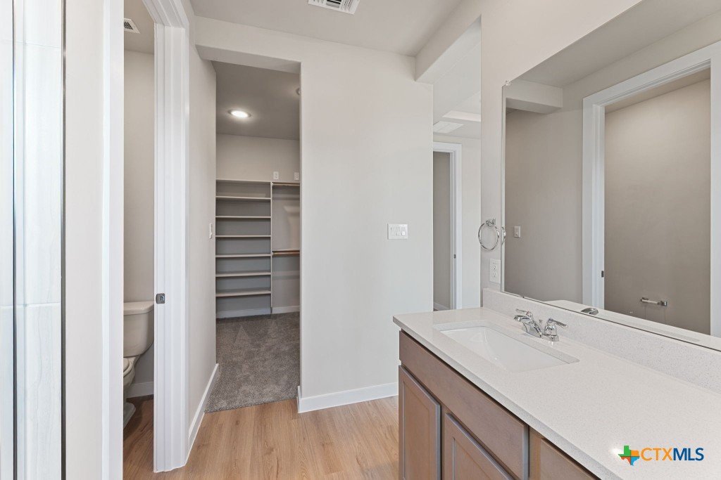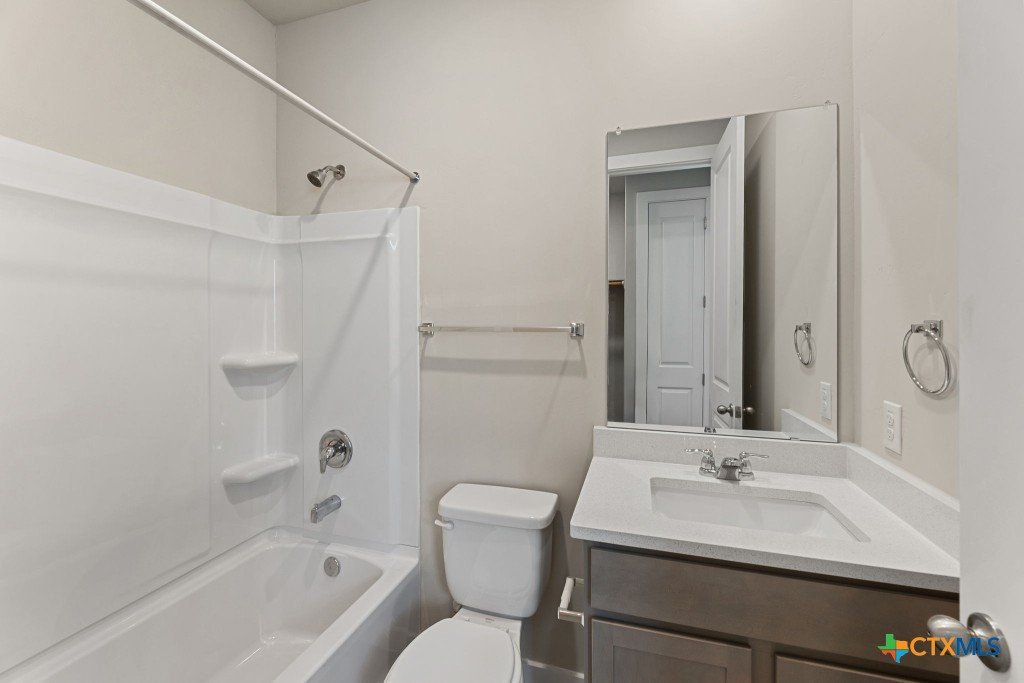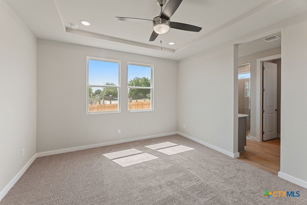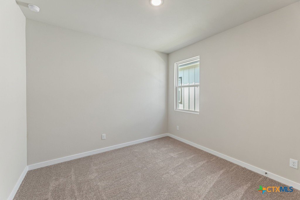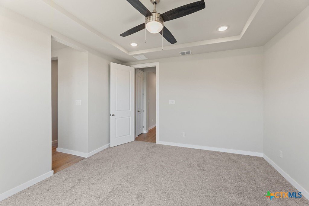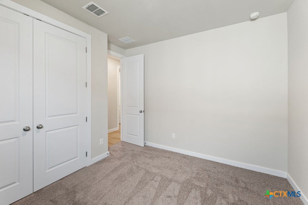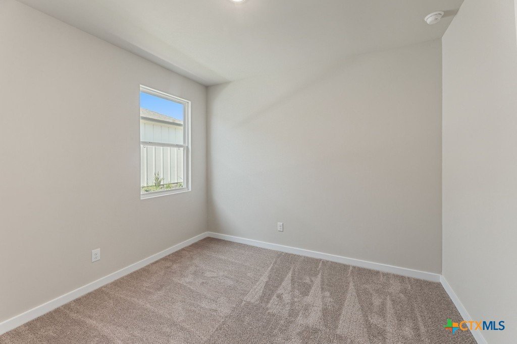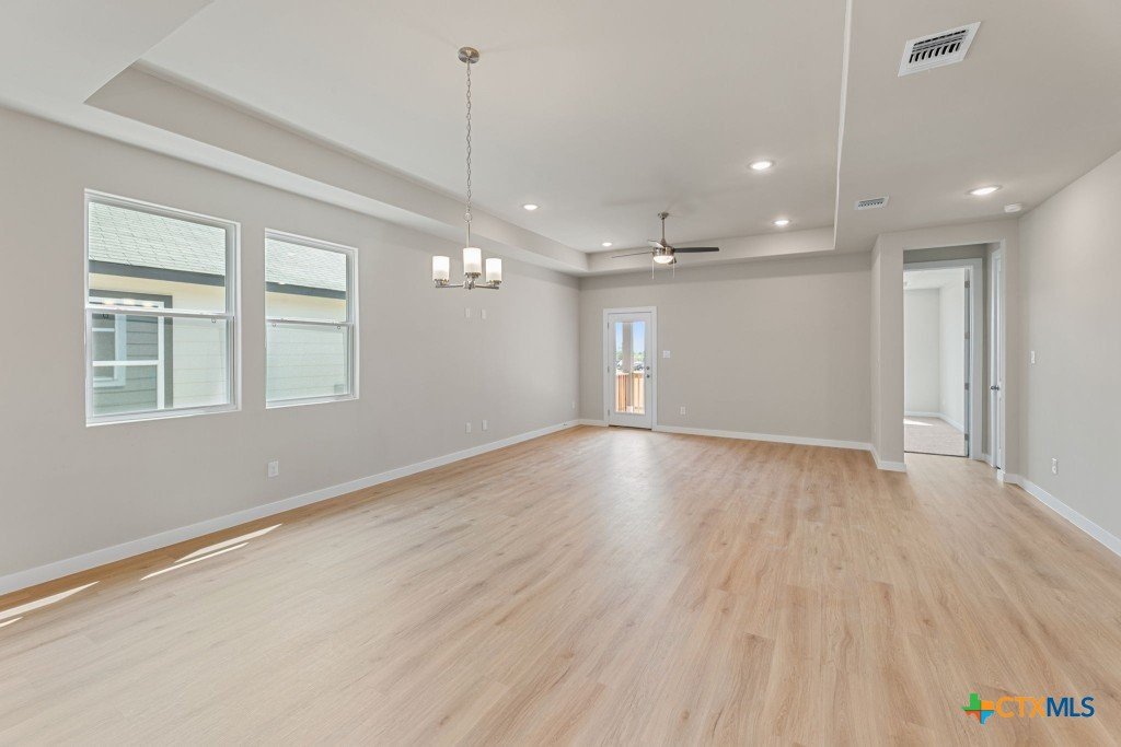 The Pecos Plan in Highland Ridge is built on a desirable home site with no rear neighbors, offering added privacy and welcome shade on the covered patio in the late afternoon and evening. The charming front elevation features board-and-batten styling with brick accents and an 8-ft front door set back from the front of the garage for added dimension. Inside, luxury vinyl plank (LVP) flooring sprawls throughout the open-concept main living areas. The kitchen is bright and modern with white quartz countertops, grey stained cabinets, a gleaming white herringbone-patterned backsplash, satin nickel pendant lights, and under-cabinet lighting. A sleek stainless steel and black glass-top electric range is paired with a built-in microwave above, while the large island features a single-bowl stainless steel sink. The Great Room is open and inviting, anchored by a 10-ft high coffered ceiling. Throughout the home, 8-ft interior doors create an upscale look. The master bedroom suite includes a tray ceiling and a spacious en-suite bath with dual vanities, an oversized walk-in shower with tile floor and glass enclosure, a private commode, and a walk-in closet. Two secondary bedrooms are located in a separate wing of the home and share a full bathroom. A third secondary bedroom is situated off the main living areas, closer to the master bedroom, making it an ideal space for a nursery or private guest room with its own full bath. Make an appointment to meet with a New Home Advisor at our Hakes Brothers model home in Highland Ridge to view this beautiful home for yourself!