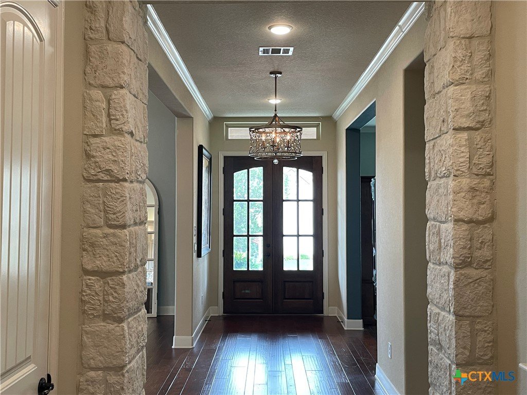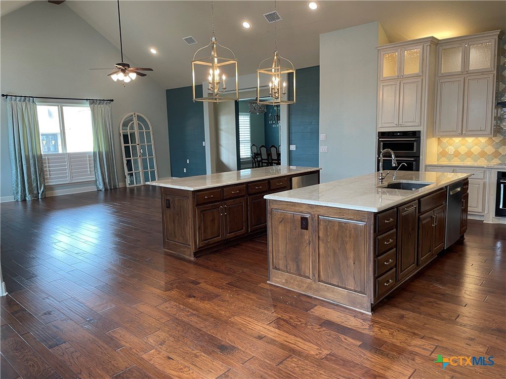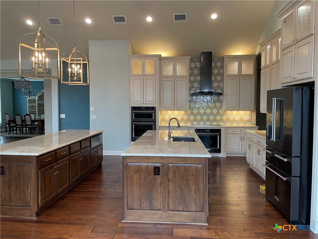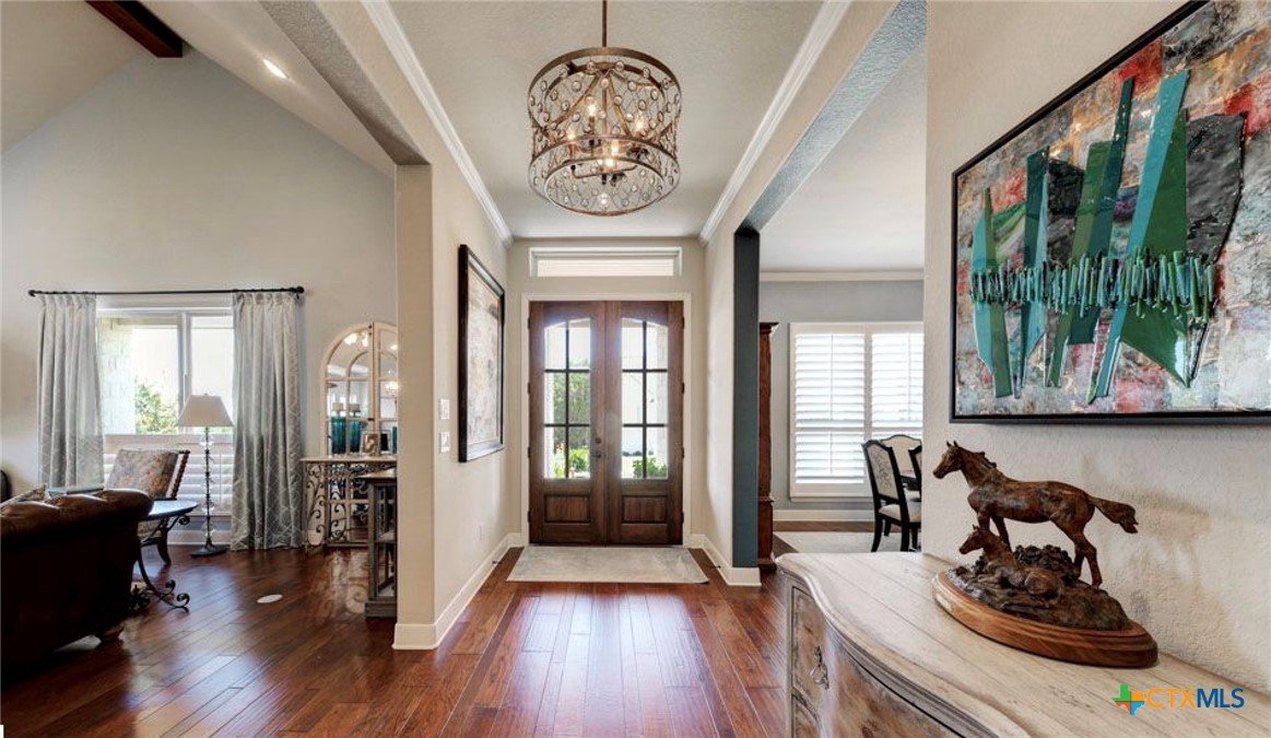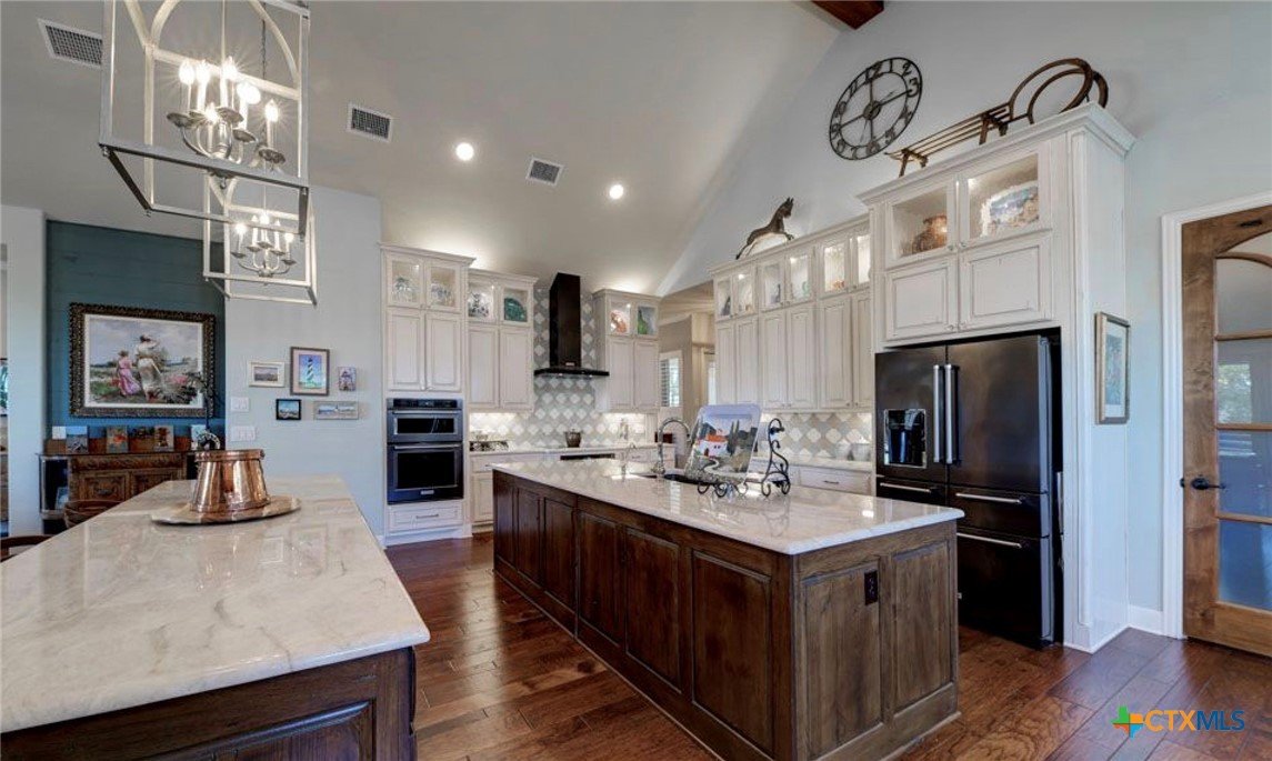Great location in the heart of New Braunfels, convenient to all parts of the city. Fabulous view from this custom built, spacious, comfortable home. This home was built as a forever home for the owners, with lots of extras. Large front porch with a beautiful city and country view. As you enter the home, you have a large entryway with opening into the dining room and family room, beautiful fireplace, gorgeous wood flooring throughout the home. Carpeting is in the secondary bedrooms. Master and two bedrooms downstairs, one of the secondary rooms has its own bath. The kitchen is a dream with two large islands. The cooktop is a heat induction and is instant heat and instant off, it doesn’t let off a lot of heat like a gas cooktop. It has two ovens with a built-in microwave, beautiful backsplash and vent hood high in KitchenAid appliances and refrigerator stays large pantry with custom door. There is another living area upstairs with a game room, bedroom, bath and walk-in storage. The backyard has tiered landscaping with a large swim spa. There is storage galore in this home. Come view this home and make it yours. Gated subdivision provides extra security. The home is just a couple of houses up from a cul-de-sac so there is no through street providing privacy.,