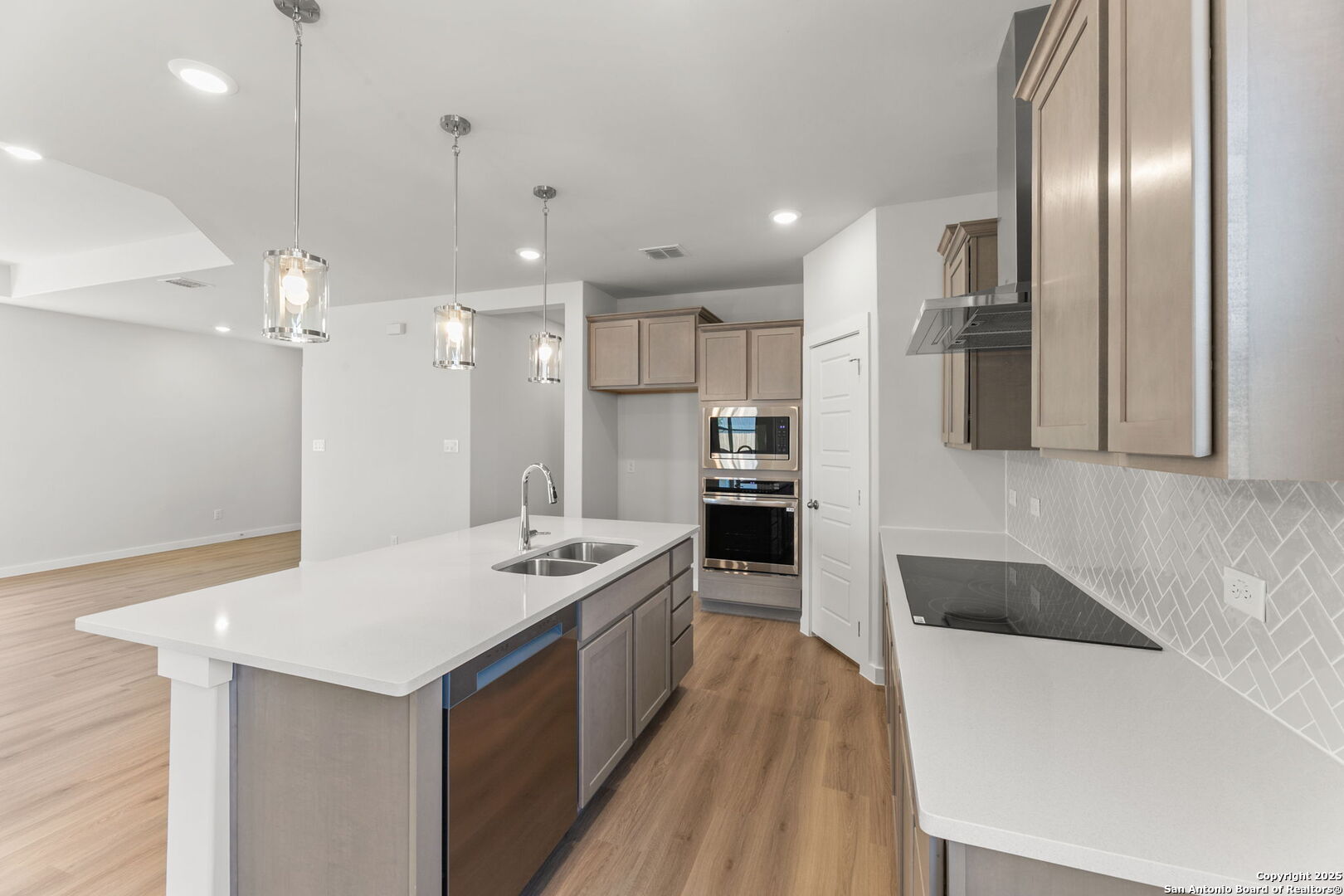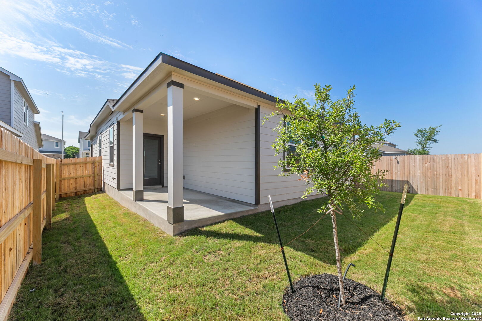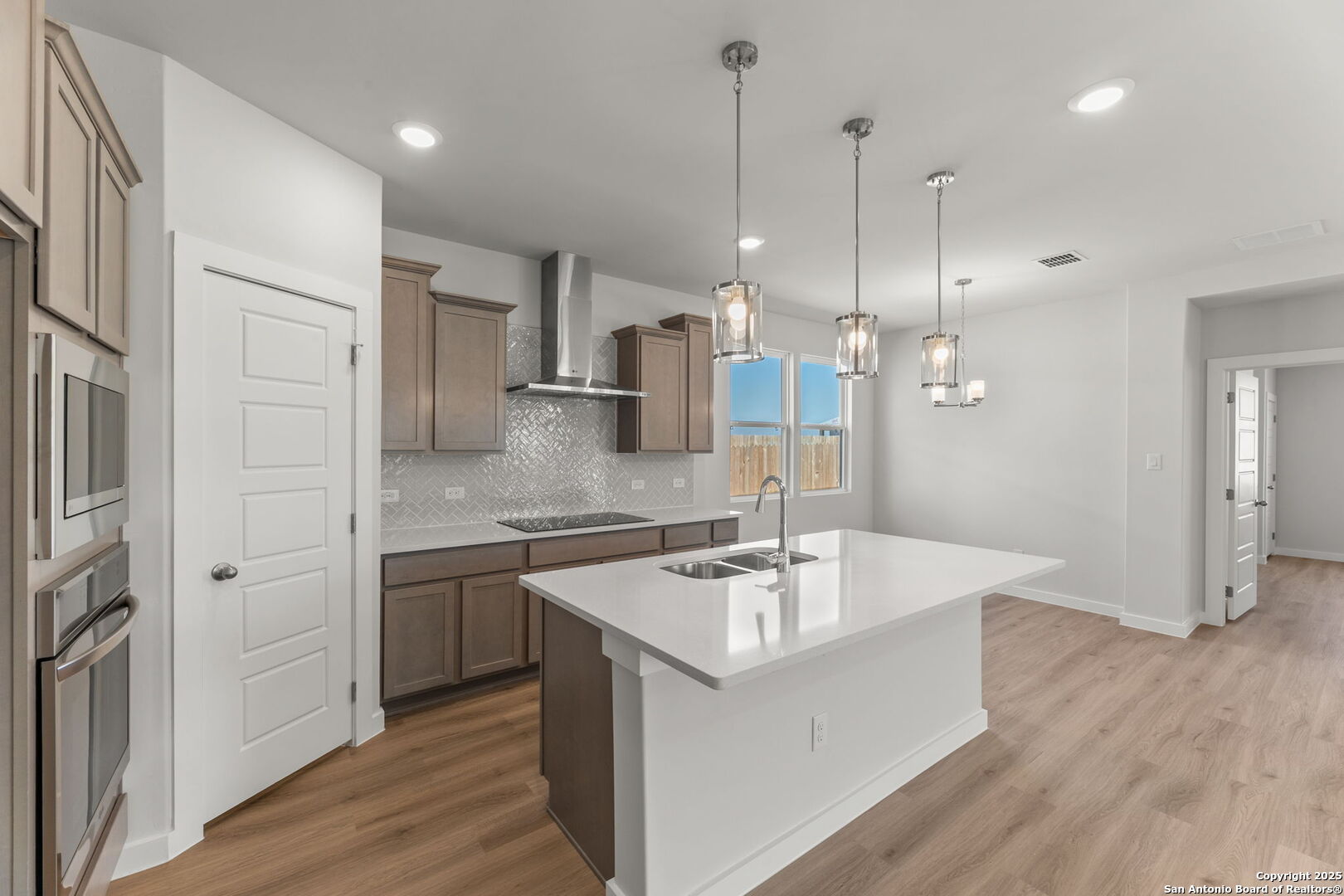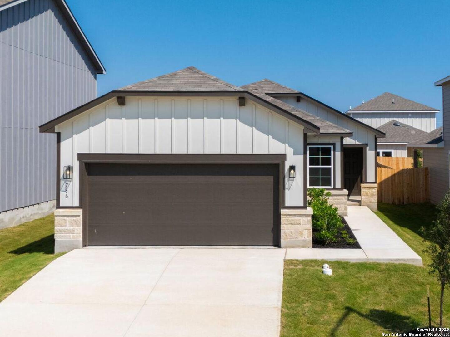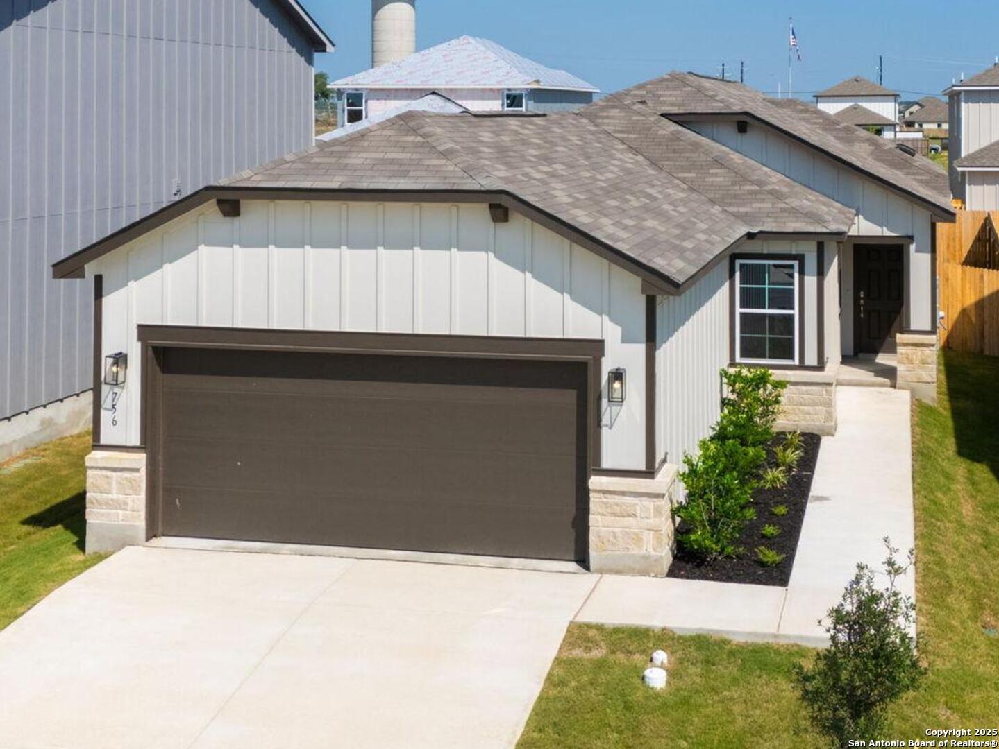 This beautifully designed single-story home in Highland Ridge blends timeless charm with modern convenience, featuring a welcoming front elevation with stone accents and classic board-and-batten detailing. Thoughtfully crafted architectural details, soaring ceilings, and abundant natural light create a bright and inviting atmosphere from the moment you step inside. With light streaming in from all directions and a layout that maximizes every square foot, this home feels even more spacious than its number suggests. Designed for both connection and privacy, the central main living areas bring the family together while a split-bedroom layout ensures that everyone has their own retreat. Whether it's hosting family dinners, unwinding after a long day, or creating new memories, the kitchen, dining, and Great Room flow effortlessly, making entertaining and daily living seamless. The kitchen is truly the heart of the home, where the stainless steel appliances, white quartz countertops, and spacious island make meal prep both stylish and efficient. The stained gray shaker-style cabinets with staggered heights add depth and character, while the gleaming chevron-patterned backsplash and satin nickel pendant lighting create a warm, polished aesthetic. The family chef will appreciate the gourmet kitchen, which includes a cooktop with stainless steel canopy venthood and separate built-in microwave and oven. The Owner's Suite is a private sanctuary designed for relaxation, offering a spa-like en-suite bathroom where you can start and end your day in comfort. The oversized walk-in shower with a built-in bench seat, recessed tile flooring, and large-format tile walls provides a sense of luxury, while the double vanity, linen closet, and walk-in closet ensure there's plenty of space for everything. The split-bedroom layout provides a peaceful retreat for secondary bedrooms, ideal for children, guests, or multi-generational living. A study with double doors near the front entrance offers the perfect space for working from home, completing homework, or managing household tasks, all while staying organized with its dedicated storage closet. The ten-foot tray ceiling in the Great Room enhances the home's open and airy feel, adding a touch of elegance. A covered patio off the main living areas provides a cozy outdoor space to step outside and enjoy the fresh air. Every detail has been thoughtfully designed to create a home where comfort, style, and functionality come together effortlessly. Imagine the possibilities-visit Hakes Brothers at Highland Ridge today and tour this exceptional home for yourself!
