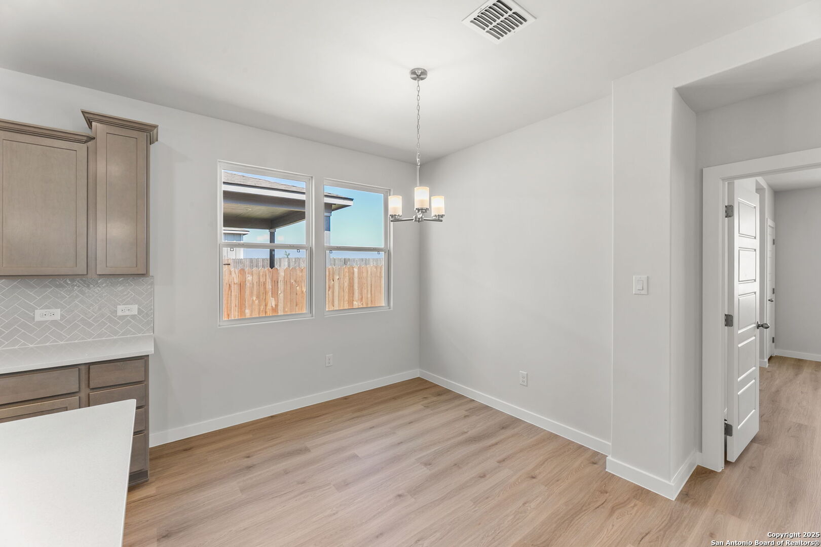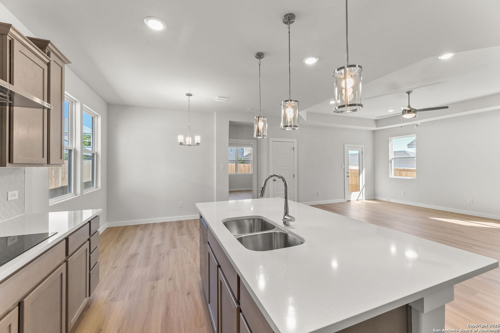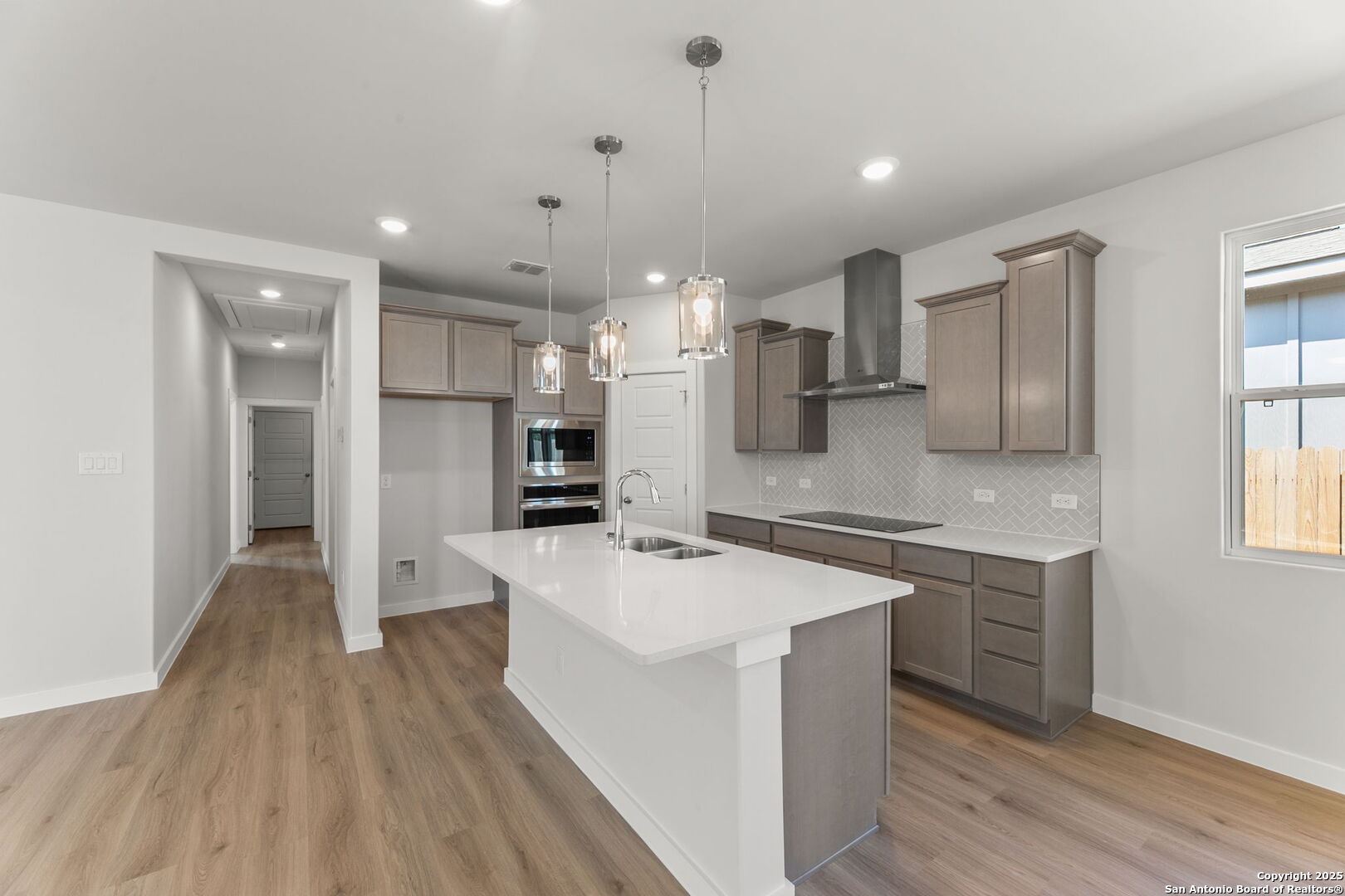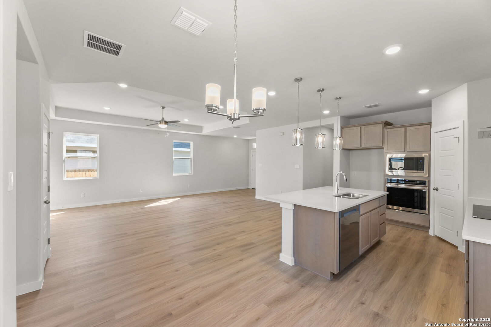 This beautifully designed single-story home in Highland Ridge blends timeless charm with modern convenience, featuring a welcoming front elevation with stone accents and classic board-and-batten detailing. Thoughtfully crafted architectural details, soaring ceilings, and abundant natural light create a bright and inviting atmosphere from the moment you step inside. With light streaming in from all directions and a layout that maximizes every square foot, this home feels even more spacious than its number suggests. Designed for both connection and privacy, the central main living areas bring the family together while a split-bedroom layout ensures that everyone has their own retreat. Whether it's hosting family dinners, unwinding after a long day, or creating new memories, the kitchen, dining, and Great Room flow effortlessly, making entertaining and daily living seamless. The kitchen is truly the heart of the home, where the stainless steel appliances, white quartz countertops, and spacious island make meal prep both stylish and efficient. The stained gray shaker-style cabinets with staggered heights add depth and character, while the gleaming chevron-patterned backsplash and satin nickel pendant lighting create a warm, polished aesthetic. The family chef will appreciate the gourmet kitchen, which includes a cooktop with stainless steel canopy venthood and separate built-in microwave and oven. The Owner's Suite is a private sanctuary designed for relaxation, offering a spa-like en-suite bathroom where you can start and end your day in comfort. The oversized walk-in shower with a built-in bench seat, recessed tile flooring, and large-format tile walls provides a sense of luxury, while the double vanity, linen closet, and walk-in closet ensure there's plenty of space for everything. The split-bedroom layout provides a peaceful retreat for secondary bedrooms, ideal for children, guests, or multi-generational living. A study with double doors near the front entrance offers the perfect space for working from home, completing homework, or managing household tasks, all while staying organized with its dedicated storage closet. The ten-foot tray ceiling in the Great Room enhances the home's open and airy feel, adding a touch of elegance. A covered patio off the main living areas provides a cozy outdoor space to step outside and enjoy the fresh air. Every detail has been thoughtfully designed to create a home where comfort, style, and functionality come together effortlessly. Imagine the possibilities-visit Hakes Brothers at Highland Ridge today and tour this exceptional home for yourself!