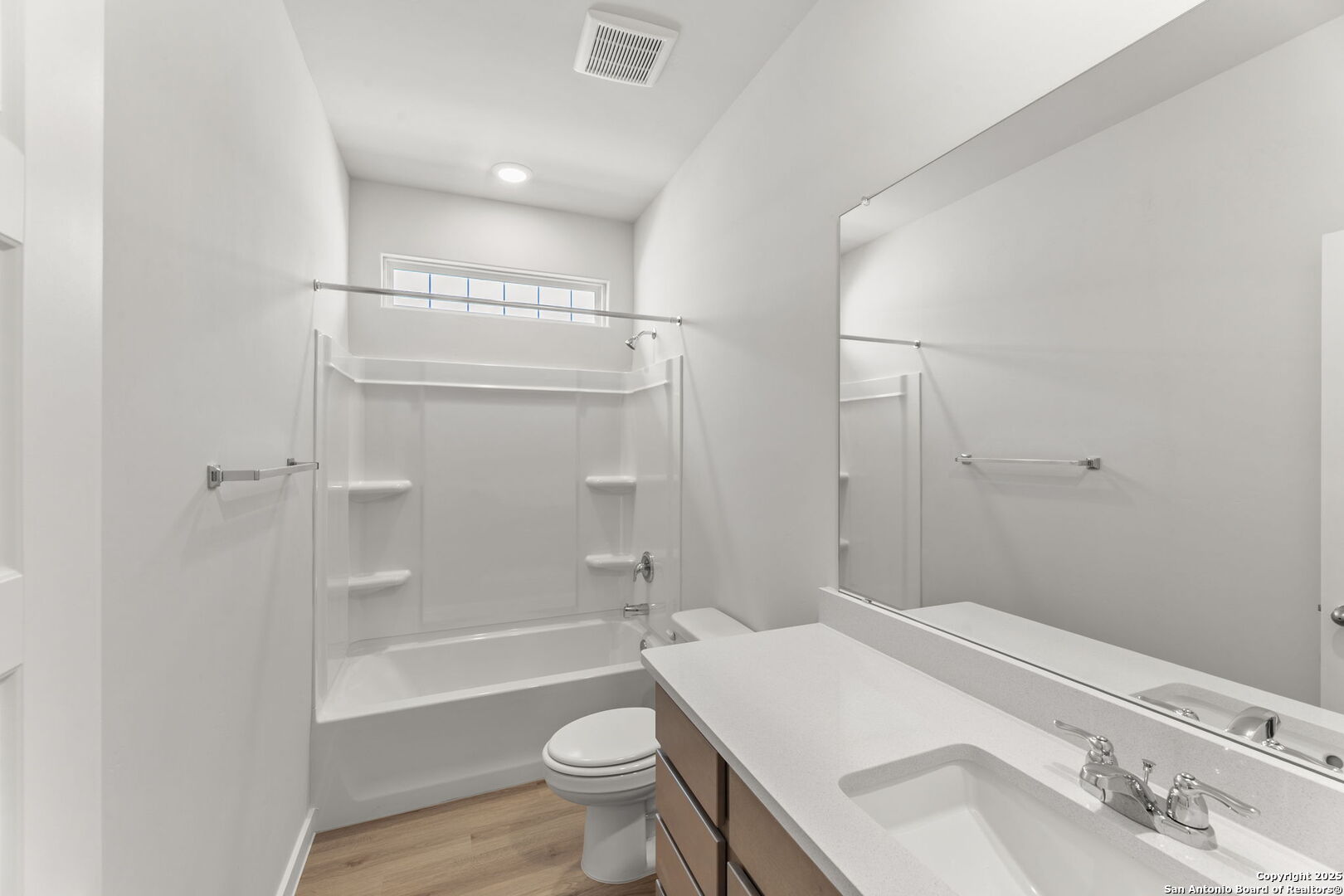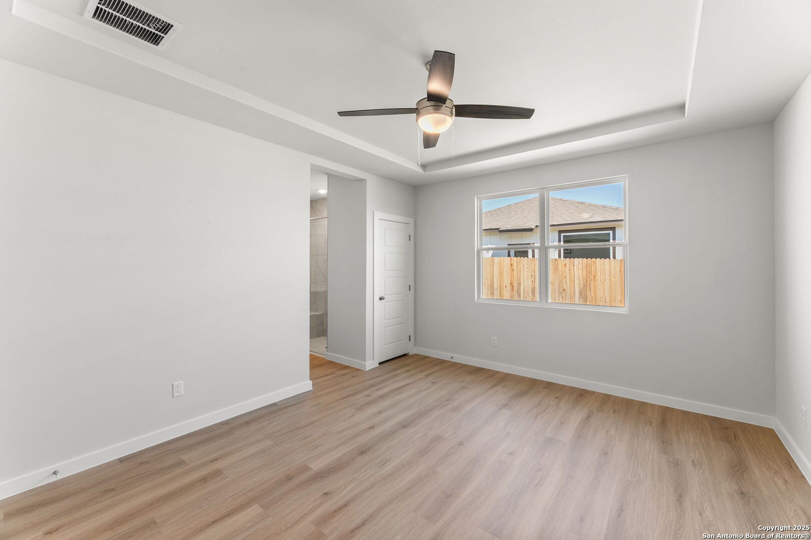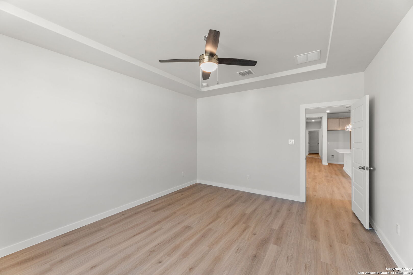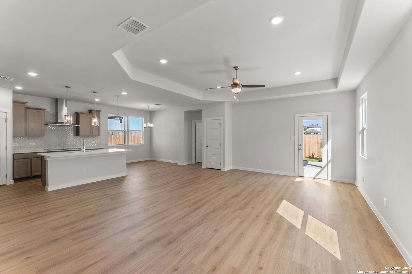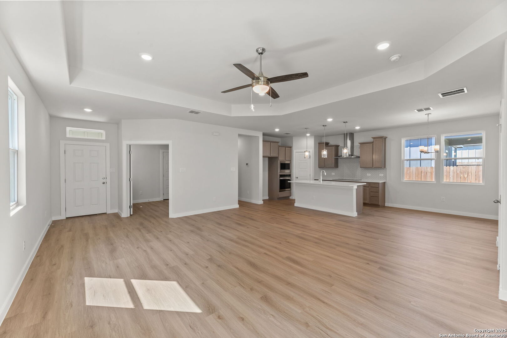 This beautifully designed single-story home in Highland Ridge blends timeless charm with modern convenience, featuring a welcoming front elevation with stone accents and classic board-and-batten detailing. Thoughtfully crafted architectural details, soaring ceilings, and abundant natural light create a bright and inviting atmosphere from the moment you step inside. With light streaming in from all directions and a layout that maximizes every square foot, this home feels even more spacious than its number suggests. Designed for both connection and privacy, the central main living areas bring the family together while a split-bedroom layout ensures that everyone has their own retreat. Whether it's hosting family dinners, unwinding after a long day, or creating new memories, the kitchen, dining, and Great Room flow effortlessly, making entertaining and daily living seamless. The kitchen is truly the heart of the home, where the stainless steel appliances, white quartz countertops, and spacious island make meal prep both stylish and efficient. The stained gray shaker-style cabinets with staggered heights add depth and character, while the gleaming chevron-patterned backsplash and satin nickel pendant lighting create a warm, polished aesthetic. The family chef will appreciate the gourmet kitchen, which includes a cooktop with stainless steel canopy venthood and separate built-in microwave and oven. The Owner's Suite is a private sanctuary designed for relaxation, offering a spa-like en-suite bathroom where you can start and end your day in comfort. The oversized walk-in shower with a built-in bench seat, recessed tile flooring, and large-format tile walls provides a sense of luxury, while the double vanity, linen closet, and walk-in closet ensure there's plenty of space for everything. The split-bedroom layout provides a peaceful retreat for secondary bedrooms, ideal for children, guests, or multi-generational living. A study with double doors near the front entrance offers the perfect space for working from home, completing homework, or managing household tasks, all while staying organized with its dedicated storage closet. The ten-foot tray ceiling in the Great Room enhances the home's open and airy feel, adding a touch of elegance. A covered patio off the main living areas provides a cozy outdoor space to step outside and enjoy the fresh air. Every detail has been thoughtfully designed to create a home where comfort, style, and functionality come together effortlessly. Imagine the possibilities-visit Hakes Brothers at Highland Ridge today and tour this exceptional home for yourself!