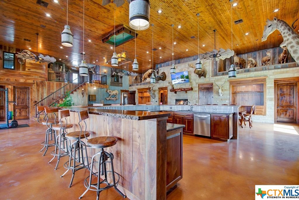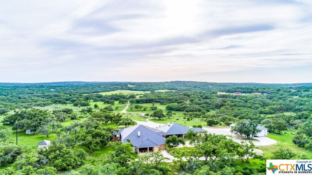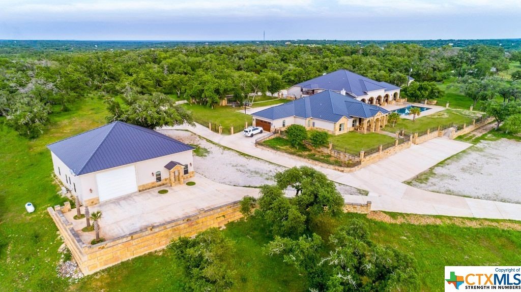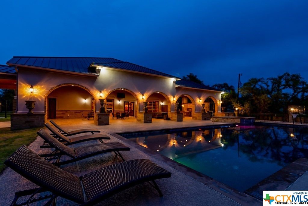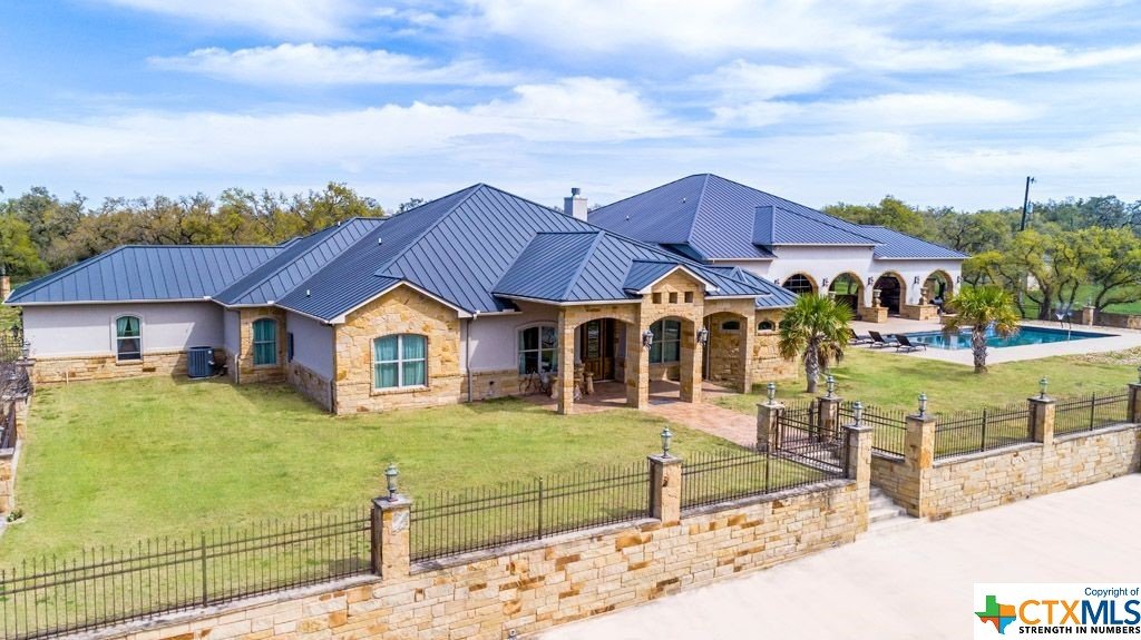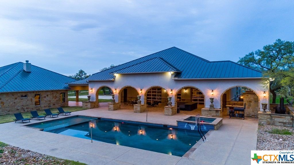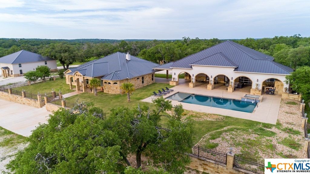 Large estate on 38.9 acres. Completely fenced with a 12-foot game fence and grand rock entrance. Live the life of luxury in this almost 9,000 sqft of living space with 8 bedrooms 8 full baths and 3 half baths. Custom built in every nook and cranny with Texas stone, hardwood, and granite cabinetry. Two large fireplaces, swimming pool, outdoor basketball court, indoor RV parking garage, indoor and an outdoor bar with complete catering setup, or just relax in your own private movie theatre. Other outdoor amenities include dog kennels, livestock pens, barns, and sheds. Large backyard area - fully fenced with wrought iron fencing. Gorgeous Views and beautiful sunsets right from your oversized covered porch. Super unique feature - your own private natural cave that you can explore! Centrally located in the heart of Texas Hill Country right next to the Wimberley Junction on R12 and FM 32. Estate is at the end of the gated subdivision of Trails End Ranch. Less than 30 minutes to Canyon Lake, Wimberley, San Marcos, or New Braunfels. Looking for country living near the big cities? You are less than an hour away from Austin or San Antonio! This is the Texas Hill Country Ranchette you have been waiting for!