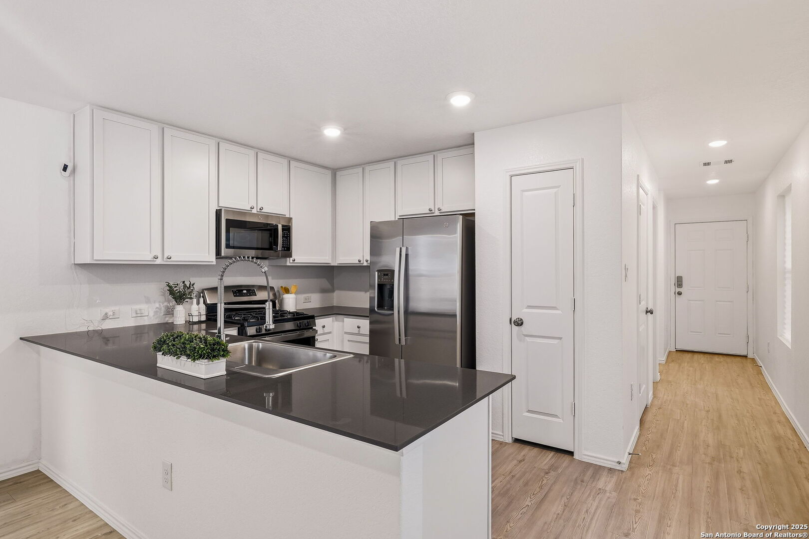 Welcome to this almost new and thoughtfully designed, this 3 bedroom 2 bath home that delivers a clean modern feel from the moment you walk in. The bright open living and dining space offers plenty of natural light and easy everyday flow. The kitchen features granite counter tops, white cabinetry, stainless steel appliances, gas cooking, ample cabinet space, and generous counter areas for meal prep and casual entertaining. The private primary suite includes a walk-in closet and a well-appointed bath with an extended vanity. Secondary bedrooms are comfortable and versatile, perfect for family, guests, or a home office. A half bath downstairs adds extra convenience. Step outside to a fully fenced backyard with room for relaxing, pets, or small gatherings. Stackable washer and dryer plus refrigerator are included! Located in a prime area with quick access to Loop 1604, Alamo Ranch shopping and dining, Lackland AFB, schools, and more. Move-in ready and an excellent opportunity as a first home or an investment property. Schedule your showing today!