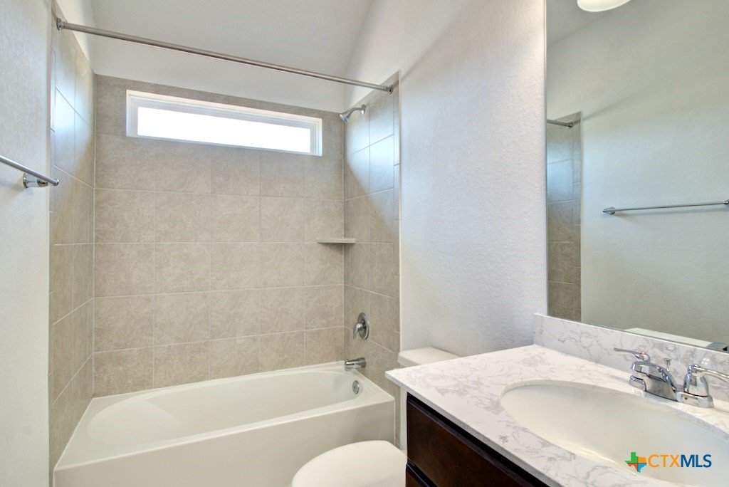 Welcome home to the beautiful Rosewood floor plan, a spacious and inviting residence that offers comfort, convenience, and thoughtful design throughout. This impressive home features 4 bedrooms and 3 and a half bathrooms, including an additional full bathroom located at the secondary bedroom on the second level, providing added privacy and flexibility for guests or family members. The exterior presents wonderful curb appeal with brick masonry and attractive design accents on the front of the home. A two car garage and a covered back patio create both practicality and outdoor living space. Inside, the upgraded kitchen layout is a true highlight, featuring a dedicated cooktop in place of a traditional range, Omegastone countertops, stainless steel appliances, and gas cooking. A dedicated office space adds an ideal setting for remote work, study, or daily organization. The owners suite offers a relaxing retreat with a spacious shower, a garden tub, a private water closet, and plenty of room to unwind after a long day. Located in the sought after Veramendi master planned community, residents enjoy a resort style pool, splashpad, pavilion, playground, parks, and scenic paths. This ideal location in New Braunfels provides convenient access to nearby shopping and dining, making daily living both easy and enjoyable.