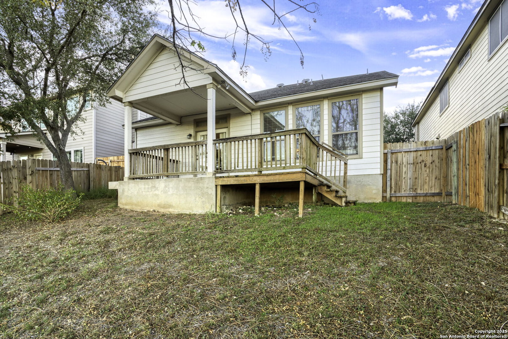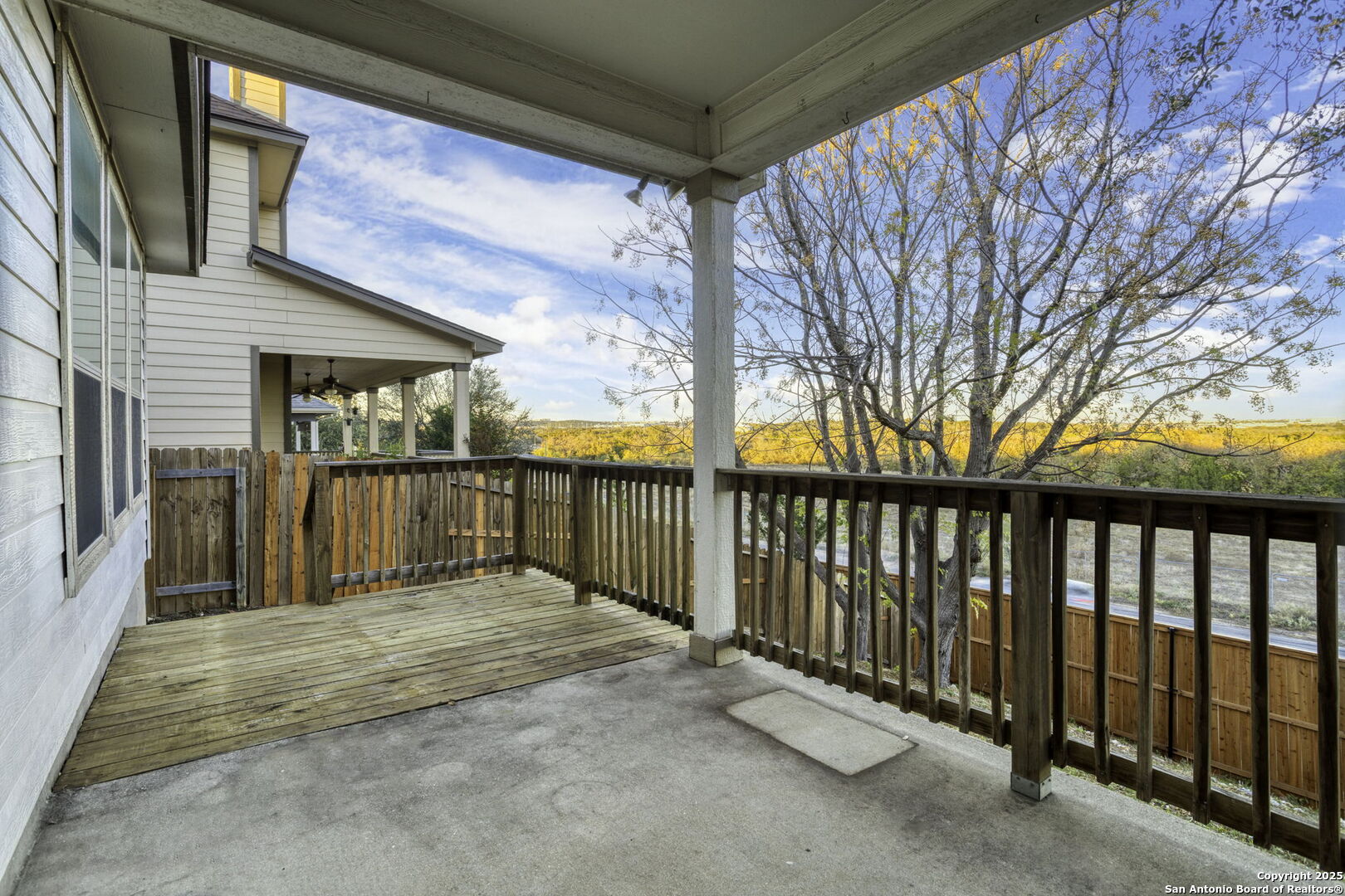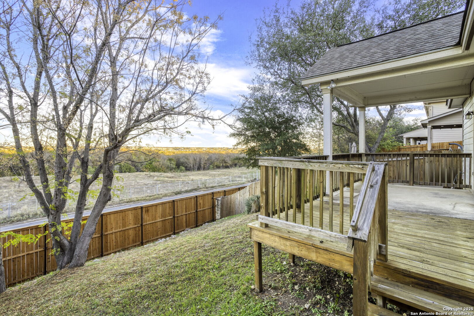Welcome Home to this beautiful 3 bedroom 2 1/2 bathroom 2 story home. Enjoy an open living area with a built-in desk with a downstairs master with separate shower & relaxing jetted garden tub. Kitchen features granite countertops with large island and upgraded 42 maple cabinetry. Big covered patio & wood deck with spectacular views!Plus a water softener in your 2 car garage. Located just minutes from IH-10/1604, UTSA, La Cantera, The Rim, Valero, FBI, and the Medical Center, with endless shopping and dining options. NISD schools! Come see it today!