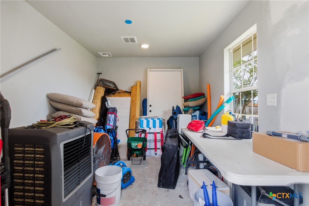 This recently upgraded three-bedroom, two-bathroom home offers a harmonious blend of comfort, functionality, and features specifically designed for coastal living. The property features a double covered area situated on a concrete pad with a rock driveway and gated access—perfectly suited as an inviting outdoor entertainment space with festive lighting and coastal ambiance. It also serves as an ideal location for storing boats, RVs, or additional vehicles. Inside, the spacious primary suite provides a serene retreat, complete with an ensuite bathroom featuring a garden-style whirlpool tub and a discreetly positioned toilet area behind swinging doors. Adjacent to the primary suite is a workspace with a desk and chair, providing a convenient space for remote work or planning future fishing excursions. The open-concept kitchen and living area create a welcoming and cozy gathering space immediately upon entering the home, perfect for entertaining guests or engaging in everyday activities. Two additional bedrooms are serviced by a well-appointed hall bathroom with a bathtub. A thoughtfully designed utility room offers dual access points for convenience and functionality, equipped with washer and dryer hookups, space for a refrigerator, and direct access to the backyard and patio. This versatile space also serves as a “rod room,” complete with rod holders—an ideal solution for anglers seeking to organize and store their fishing gear efficiently.