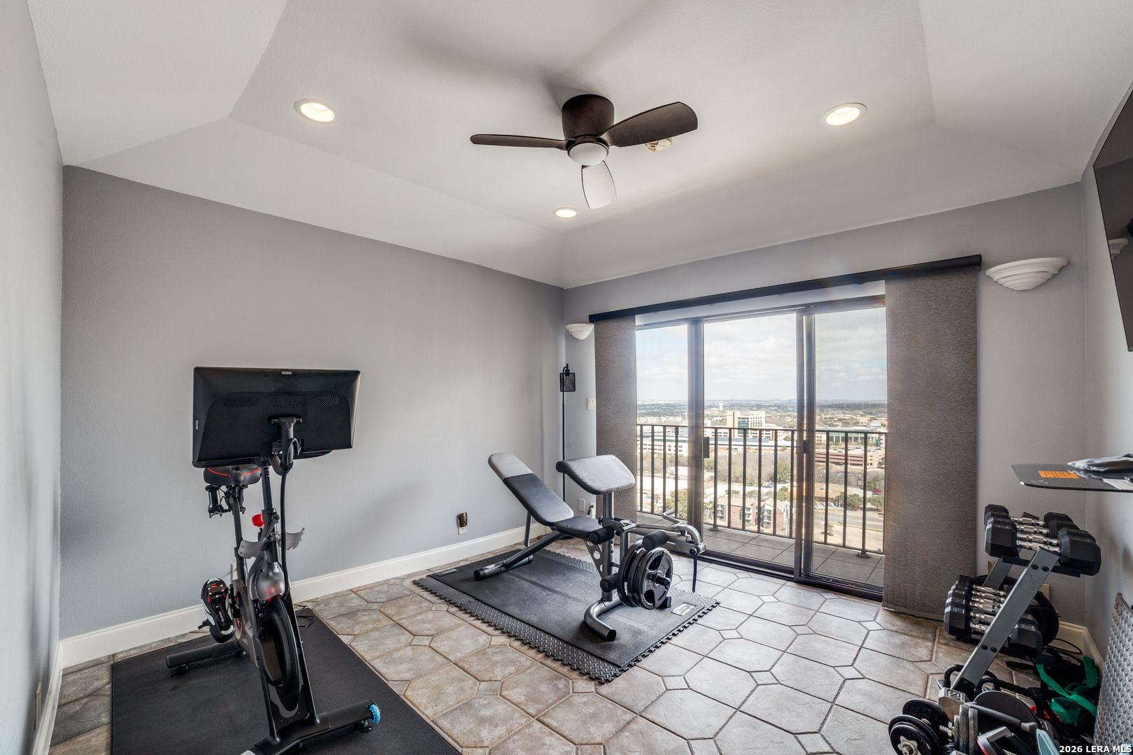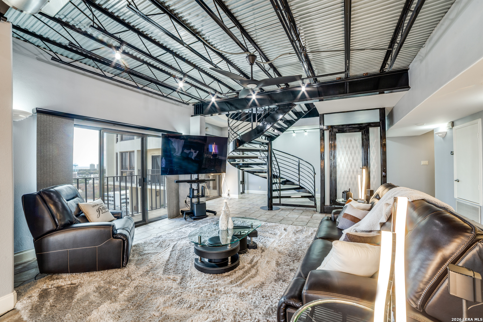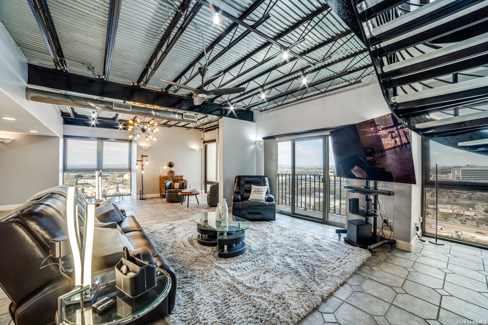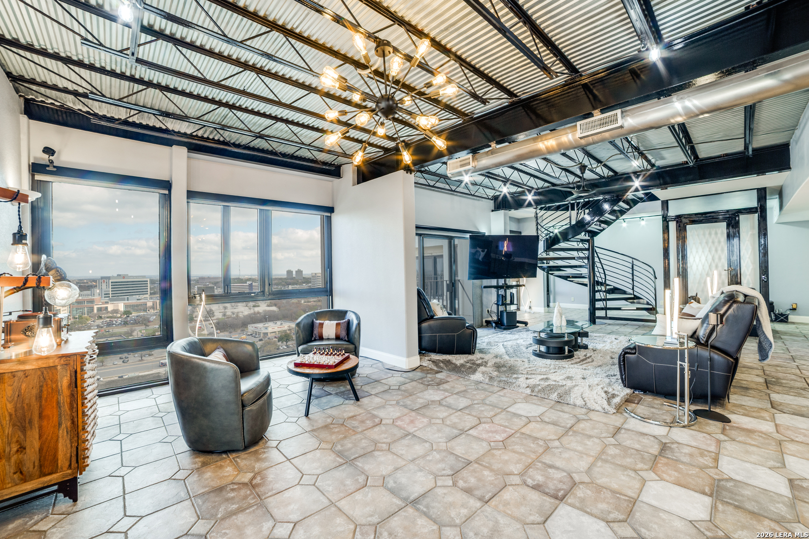 Perched high above the city, this one-of-a-kind industrial penthouse isn't just a residence...it's an experience. From the moment you step inside, the vibe is undeniable. Cool-toned custom cabinetry, stainless steel appliances, a welded metal backsplash, and an expansive island kitchen create a bold yet refined aesthetic that feels straight out of a design magazine. The open floor plan flows effortlessly, surrounded by walls of windows that frame breathtaking city views and unforgettable sunsets. (Some say you even breathe better air higher up.) This is the only unit in the building with its own private elevator. A rare level of exclusivity that sets it apart immediately. Just off the entry, a dramatic spiral staircase accented with metal ceiling detail adds architectural interest and character that perfectly complements the industrial styling. Electric remote-controlled blinds allow you to shift the mood at the touch of a button. Step onto the private balcony and take in panoramic skyline views. Morning coffee hits differently up here, and evenings are pure magic as the sun sets over the city. Upstairs, two stunning suites overlook the skyline, along with a versatile flex space ideal for an office, art studio, fitness room, or additional bedroom. The primary suite is a true retreat, featuring built-in shelving, abundant natural light, and a spa-inspired en suite bath complete with a soaking tub, steam shower, sauna with warm wood detailing, and elevated finishes throughout. Who doesn't love their own private spa experience at home? As a penthouse residence, this unit includes two dedicated HVAC systems, a feature exclusive to the penthouse level offering enhanced comfort and efficiency, and these are not just any systems.. they are Reme Halo systems . Additional thoughtful upgrades include a steam shower, central vacuum system and convenient sweep suction in both the kitchen and primary suite for effortless living. Located within The Towers, residents enjoy posh amenities including a fitness center, outdoor pool, guarded access, and the security and convenience of luxury high-rise living. Please ask for full amenities & lifestyle lists! This is penthouse living at its finest! Elevated, exclusive, and effortlessly cool.