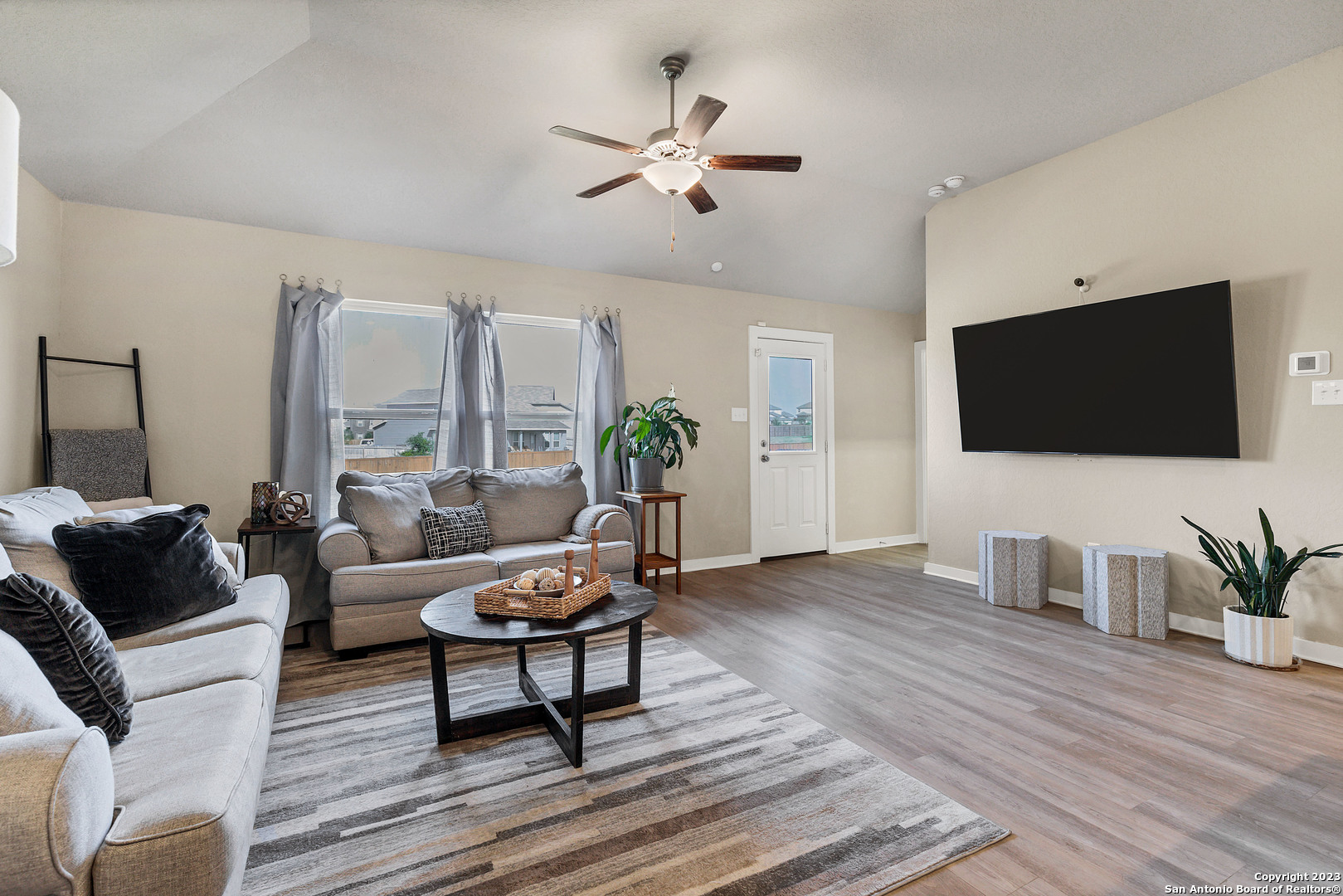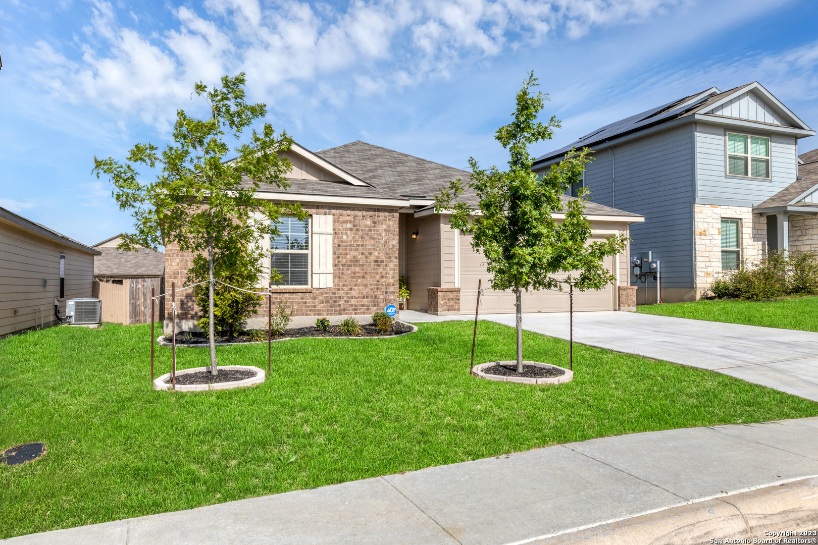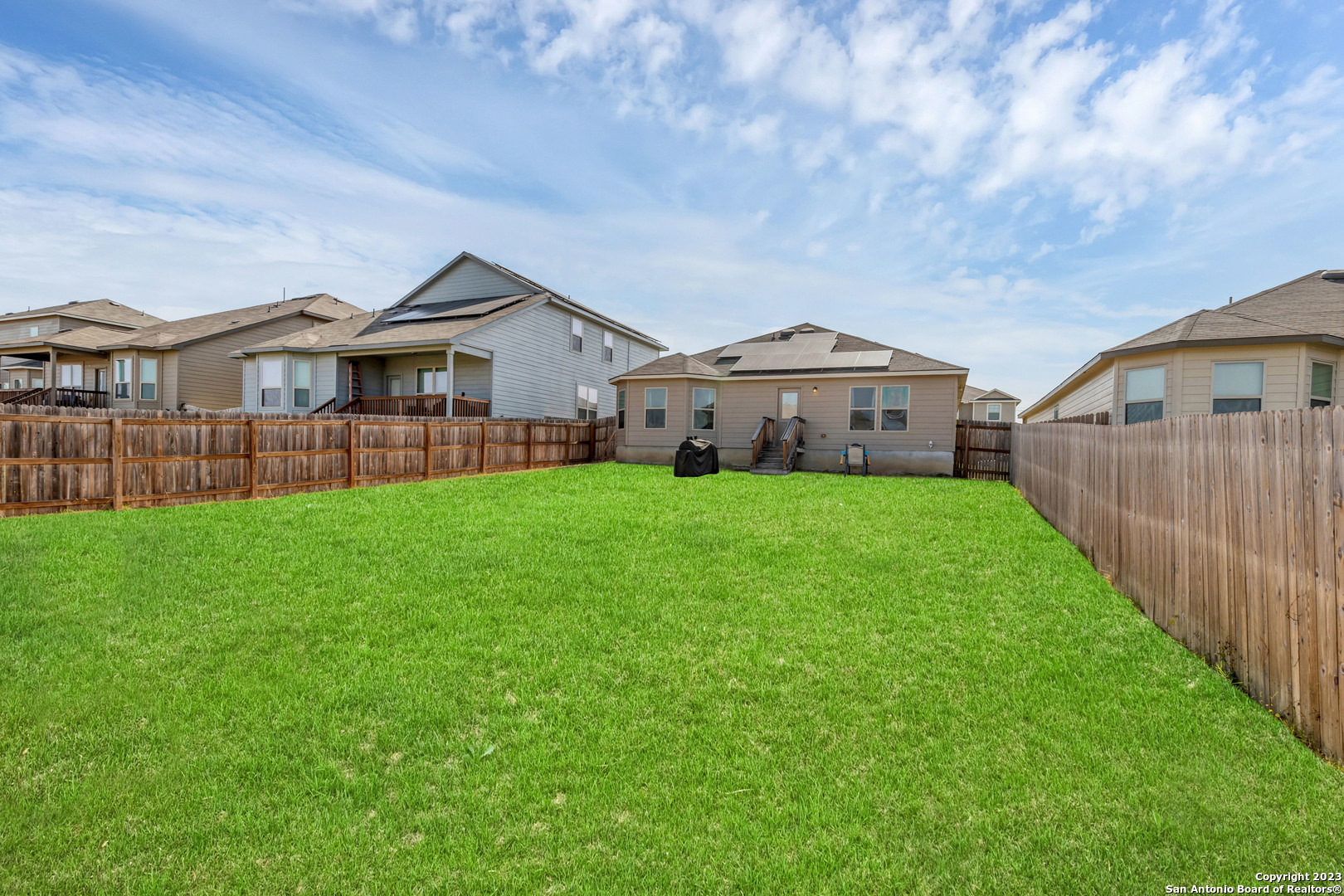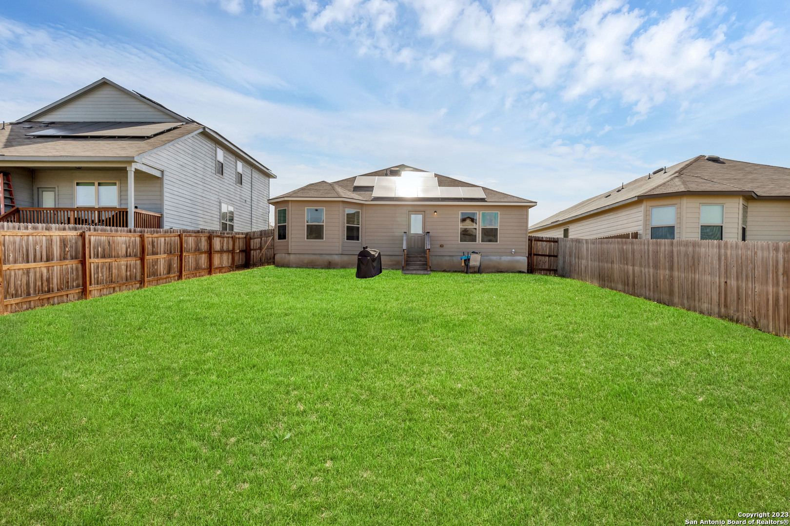 Located just off Loop 1604 and Highway 90, commuting to Randolph Air Force Base or Downtown San Antonio is an absolute breeze! Step inside to find a beautifully upgraded interior, with vinyl plank flooring gracing the common areas, and elegant tray ceilings adding a touch of dramatic flair, perfect for hosting gatherings and creating lasting memories with loved ones. The kitchen is a chef's dream, boasting custom white cabinets, abundant storage space, and gorgeous granite countertops, making meal preparation an absolute joy! Retreat to the serene owner's suite, featuring a spacious walk-in shower and a roomy walk-in closet, providing you with your own private oasis. Outside, the large backyard offers ample space for children and furry friends to frolic and play, ensuring unforgettable moments and endless fun in the sun. With the added advantage of solar panels, enjoy the perks of significantly reduced utility bills, especially during those scorching summer months!