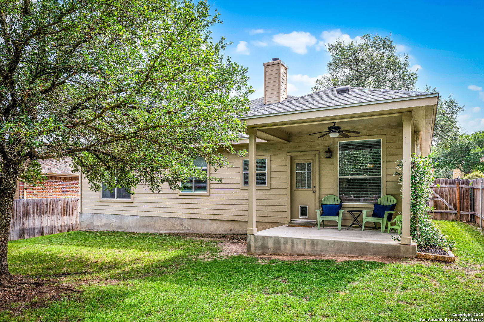 Charming 3-Bedroom Home in Mission Hills Ranch! Welcome to this well-maintained 3-bedroom, 2-bath home in the desirable Mission Hills Ranch community. The open-concept layout features an island kitchen ideal for entertaining, a cozy corner rock fireplace in the living room, and ceiling fans throughout. The spacious primary suite includes a walk-in closet and a dual vanity bathroom. Step outside to a covered patio shaded by mature oak trees-perfect for enjoying the outdoors. A full sprinkler system helps keep the lawn lush all summer long. Filled with natural light and move-in ready, this home is ready to welcome you!