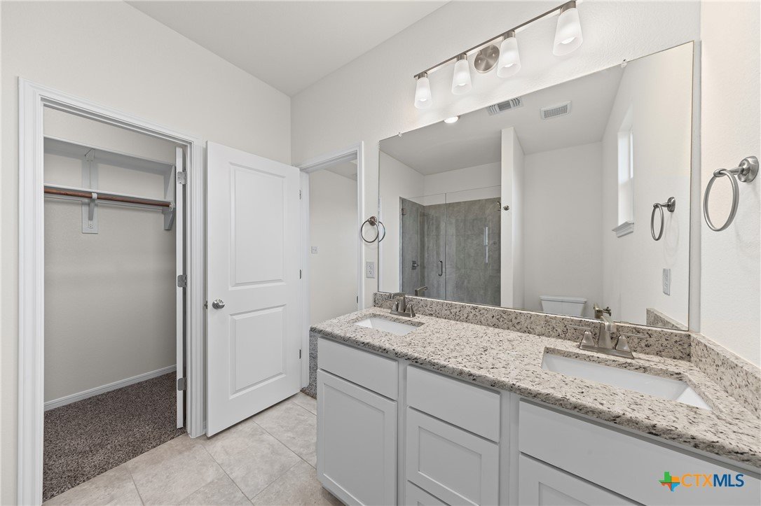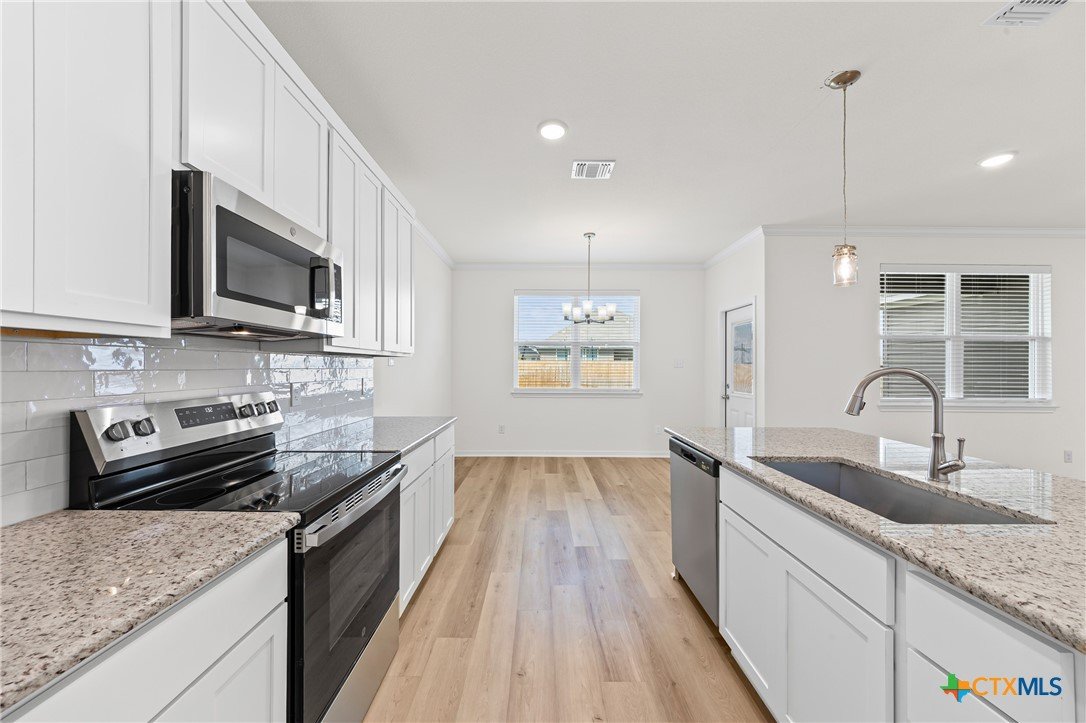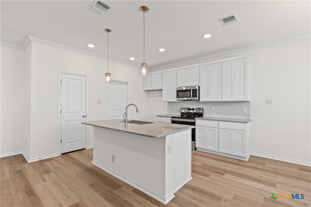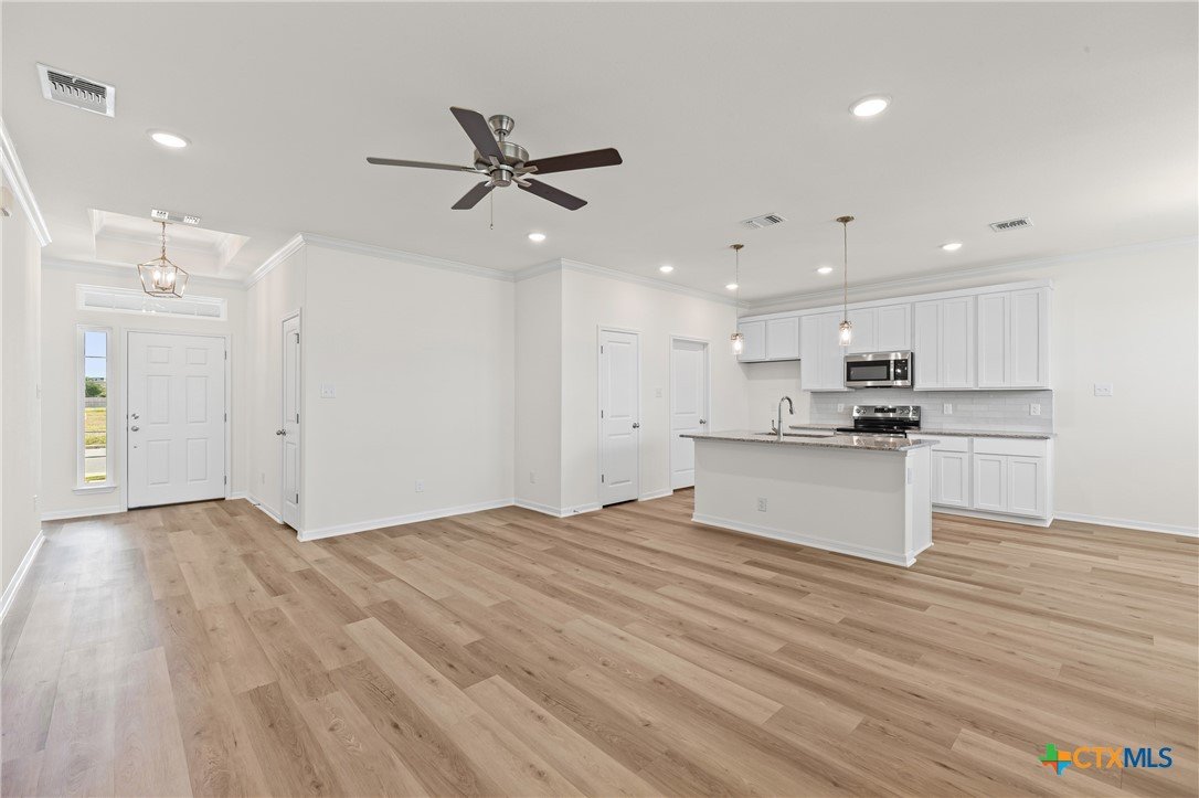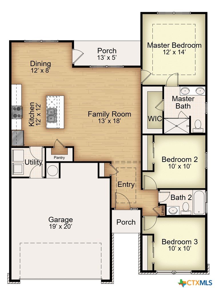 The Longhorn floor plan is one of our most popular. This plan features a three-bedroom, two-bath layout across 1,320 square feet with an open-concept family room, dining area, and kitchen. The kitchen includes stainless steel appliances, a large island, and a pantry, while the primary bath has dual vanity sinks and a spacious closet.