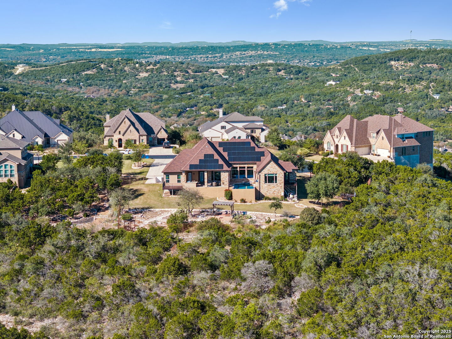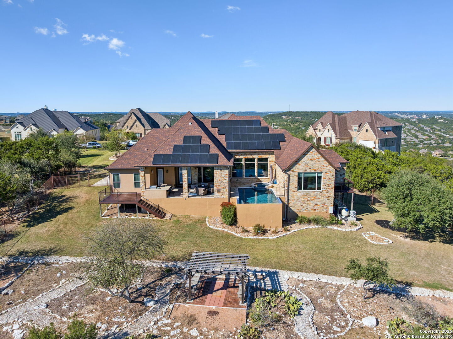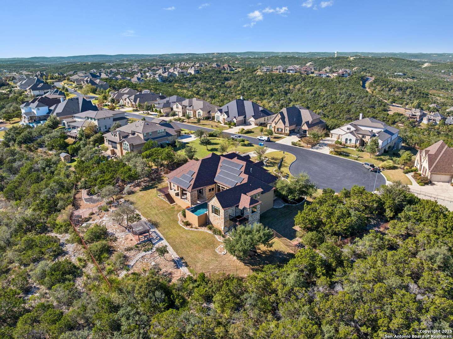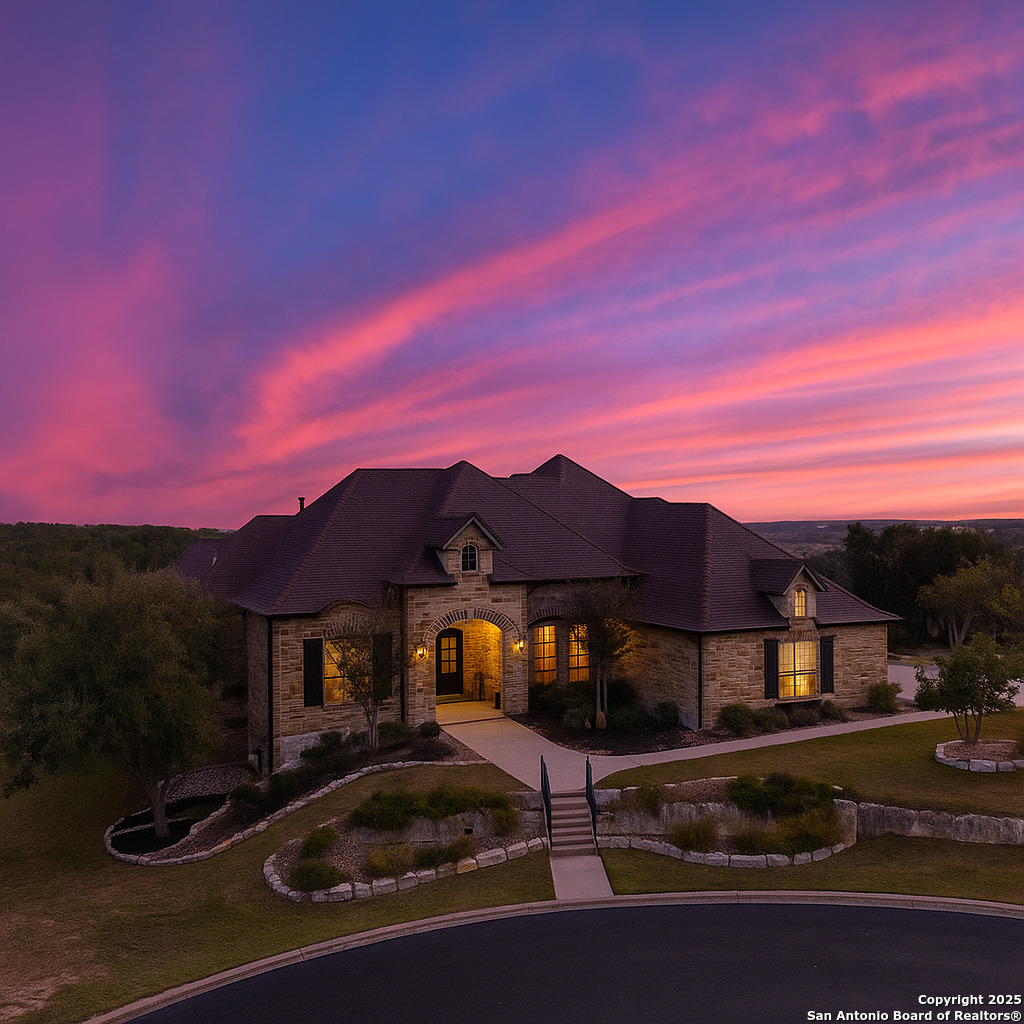 This home is a Rare find one-story hilltop estate with some of the best views in the city! Tucked away on a quiet cul-de-sac in the highly desirable gated Overlook at Stonewall Estates, this stunning single-story home offers unmatched privacy, sweeping Hill Country views, and true resort-style living. Step inside and immediately feel the openness created by large picture windows framing the zero-scape pool, spa, and panoramic greenbelt views, a peaceful, natural backdrop that is incredibly hard to find. To the right of the entry, you'll find a flexible formal space that can serve as a dining room or formal living area, complete with a wet bar and wine refrigerator-perfect for entertaining. The luxurious primary retreat features wood flooring and breathtaking views. The spa-inspired primary bath offers a walk-in shower, garden tub, and two separate closets with built-ins. Just off the primary suite is a versatile bonus room ideal for an exercise room, nursery, TV room, or private home office-also showcasing beautiful views. This thoughtfully designed home offers three spacious bedrooms, each with its own private bath, providing comfort and privacy for family and guests. Step outside to your own resort-style oasis, featuring a sparkling zero-scape heated pool and spa, and an outdoor kitchen equipped with a BBQ pit, refrigerator, and generous counter space-perfect for outdoor dining and entertaining. Enjoy evenings gathered around the outdoor fireplace while taking in the spectacular Hill Country views that stretch for miles. This beautiful home also features solar panels, providing very low - cost utility bills. This home will NOT last long!