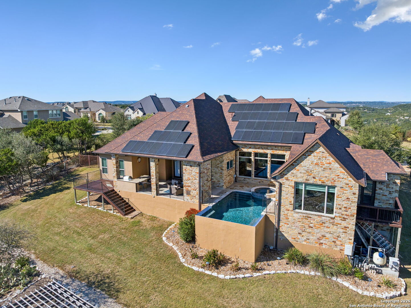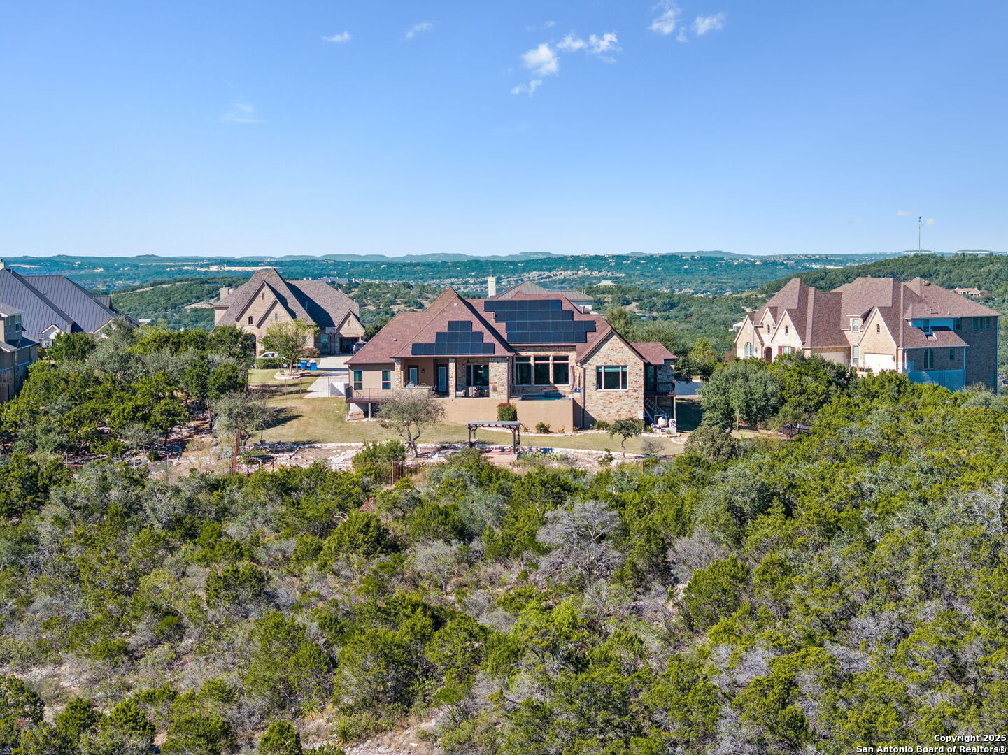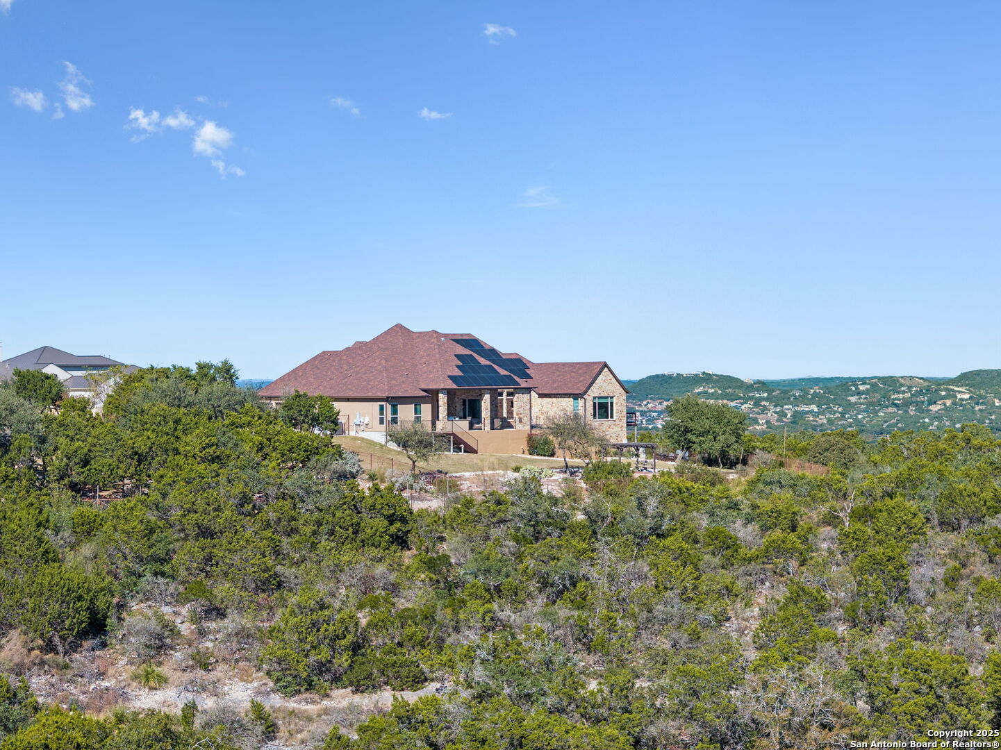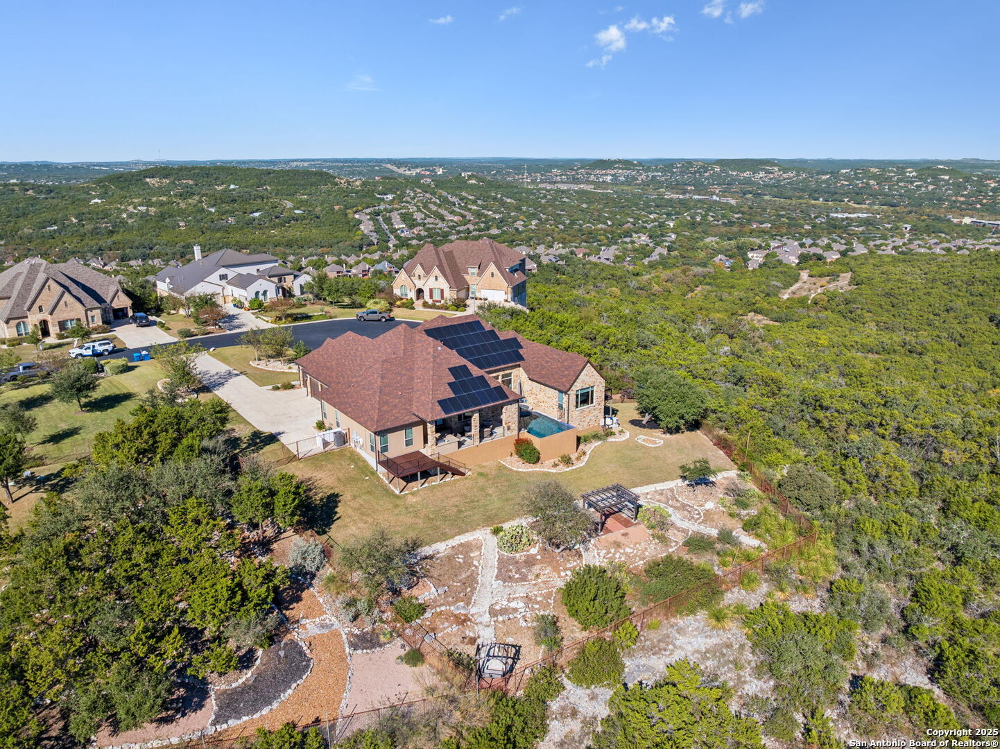 This home is a Rare find one-story hilltop estate with some of the best views in the city! Tucked away on a quiet cul-de-sac in the highly desirable gated Overlook at Stonewall Estates, this stunning single-story home offers unmatched privacy, sweeping Hill Country views, and true resort-style living. Step inside and immediately feel the openness created by large picture windows framing the zero-scape pool, spa, and panoramic greenbelt views, a peaceful, natural backdrop that is incredibly hard to find. To the right of the entry, you'll find a flexible formal space that can serve as a dining room or formal living area, complete with a wet bar and wine refrigerator-perfect for entertaining. The luxurious primary retreat features wood flooring and breathtaking views. The spa-inspired primary bath offers a walk-in shower, garden tub, and two separate closets with built-ins. Just off the primary suite is a versatile bonus room ideal for an exercise room, nursery, TV room, or private home office-also showcasing beautiful views. This thoughtfully designed home offers three spacious bedrooms, each with its own private bath, providing comfort and privacy for family and guests. Step outside to your own resort-style oasis, featuring a sparkling zero-scape heated pool and spa, and an outdoor kitchen equipped with a BBQ pit, refrigerator, and generous counter space-perfect for outdoor dining and entertaining. Enjoy evenings gathered around the outdoor fireplace while taking in the spectacular Hill Country views that stretch for miles. This beautiful home also features solar panels, providing very low - cost utility bills. This home will NOT last long!