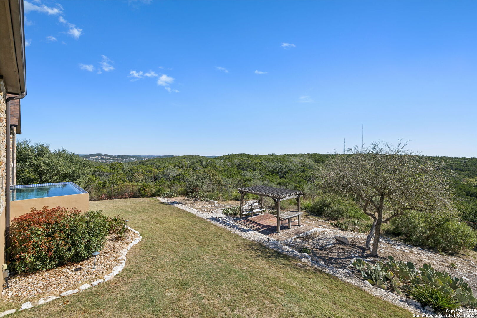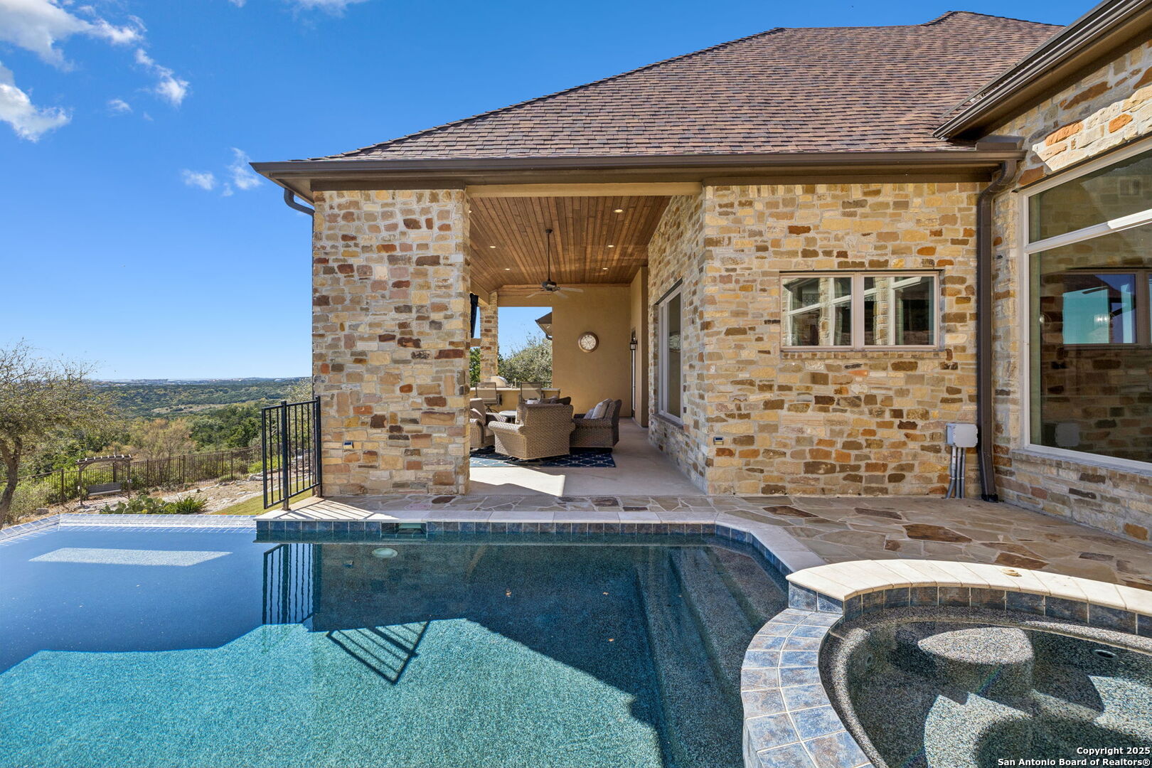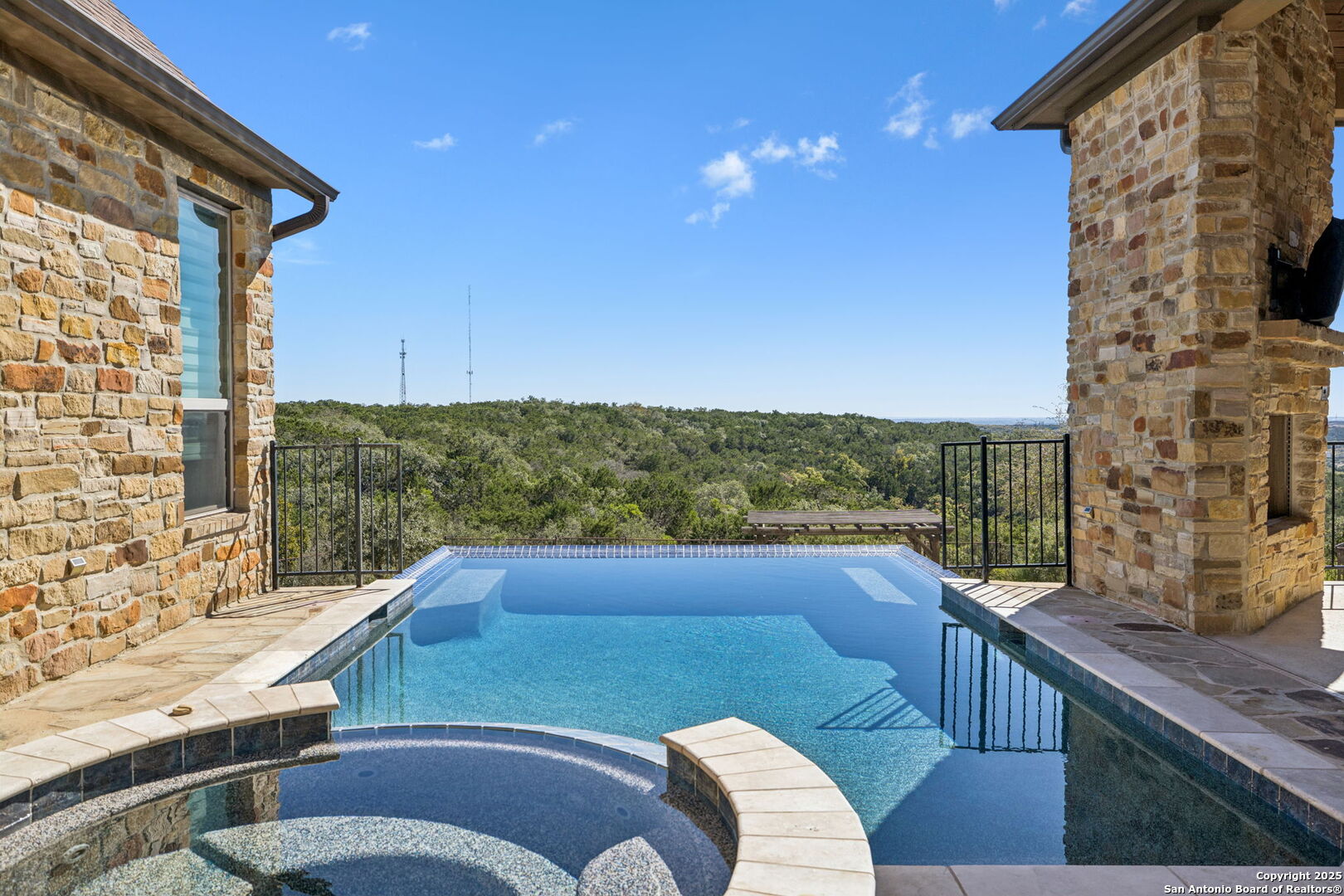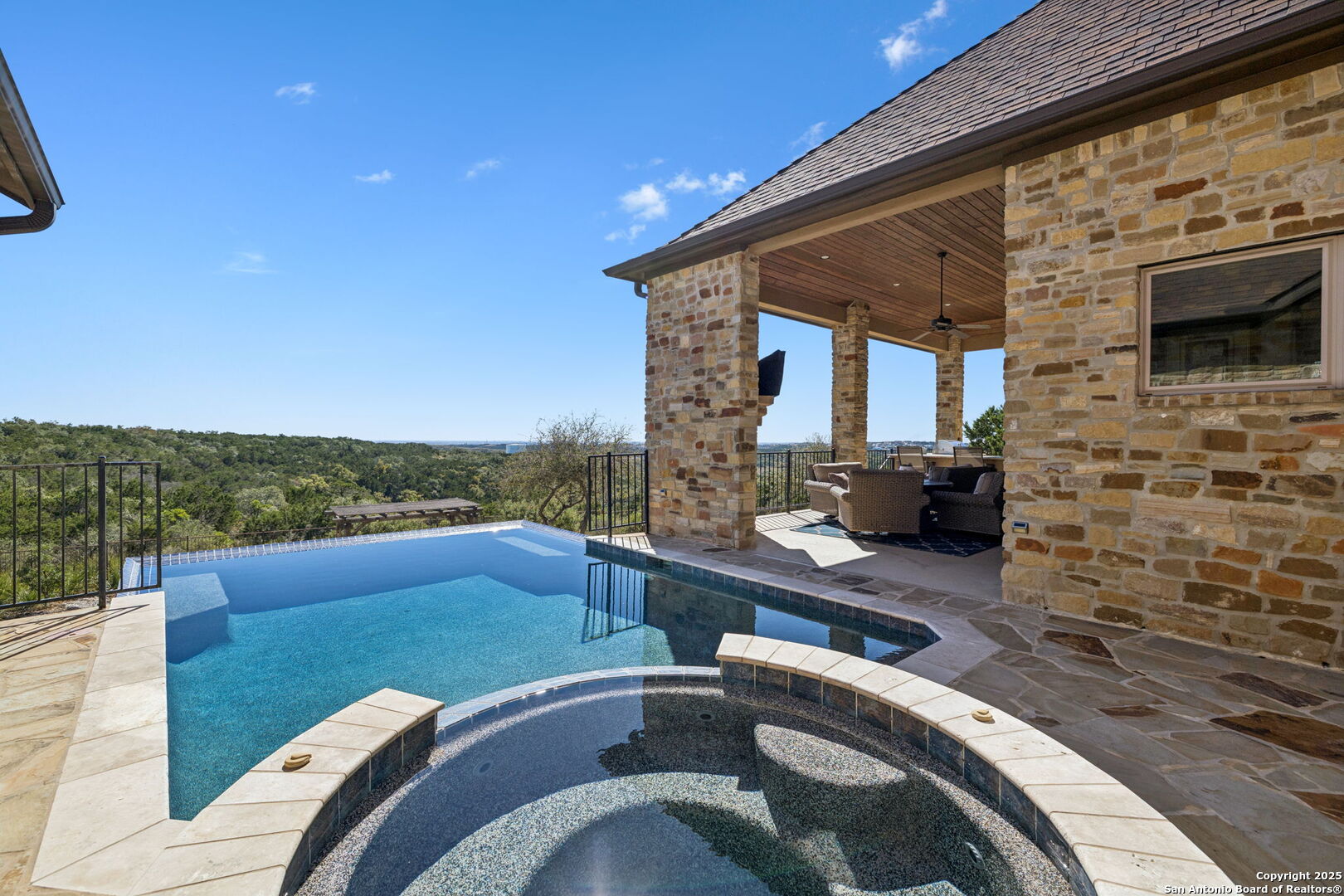 This home is a Rare find one-story hilltop estate with some of the best views in the city! Tucked away on a quiet cul-de-sac in the highly desirable gated Overlook at Stonewall Estates, this stunning single-story home offers unmatched privacy, sweeping Hill Country views, and true resort-style living. Step inside and immediately feel the openness created by large picture windows framing the zero-scape pool, spa, and panoramic greenbelt views, a peaceful, natural backdrop that is incredibly hard to find. To the right of the entry, you'll find a flexible formal space that can serve as a dining room or formal living area, complete with a wet bar and wine refrigerator-perfect for entertaining. The luxurious primary retreat features wood flooring and breathtaking views. The spa-inspired primary bath offers a walk-in shower, garden tub, and two separate closets with built-ins. Just off the primary suite is a versatile bonus room ideal for an exercise room, nursery, TV room, or private home office-also showcasing beautiful views. This thoughtfully designed home offers three spacious bedrooms, each with its own private bath, providing comfort and privacy for family and guests. Step outside to your own resort-style oasis, featuring a sparkling zero-scape heated pool and spa, and an outdoor kitchen equipped with a BBQ pit, refrigerator, and generous counter space-perfect for outdoor dining and entertaining. Enjoy evenings gathered around the outdoor fireplace while taking in the spectacular Hill Country views that stretch for miles. This beautiful home also features solar panels, providing very low - cost utility bills. This home will NOT last long!
