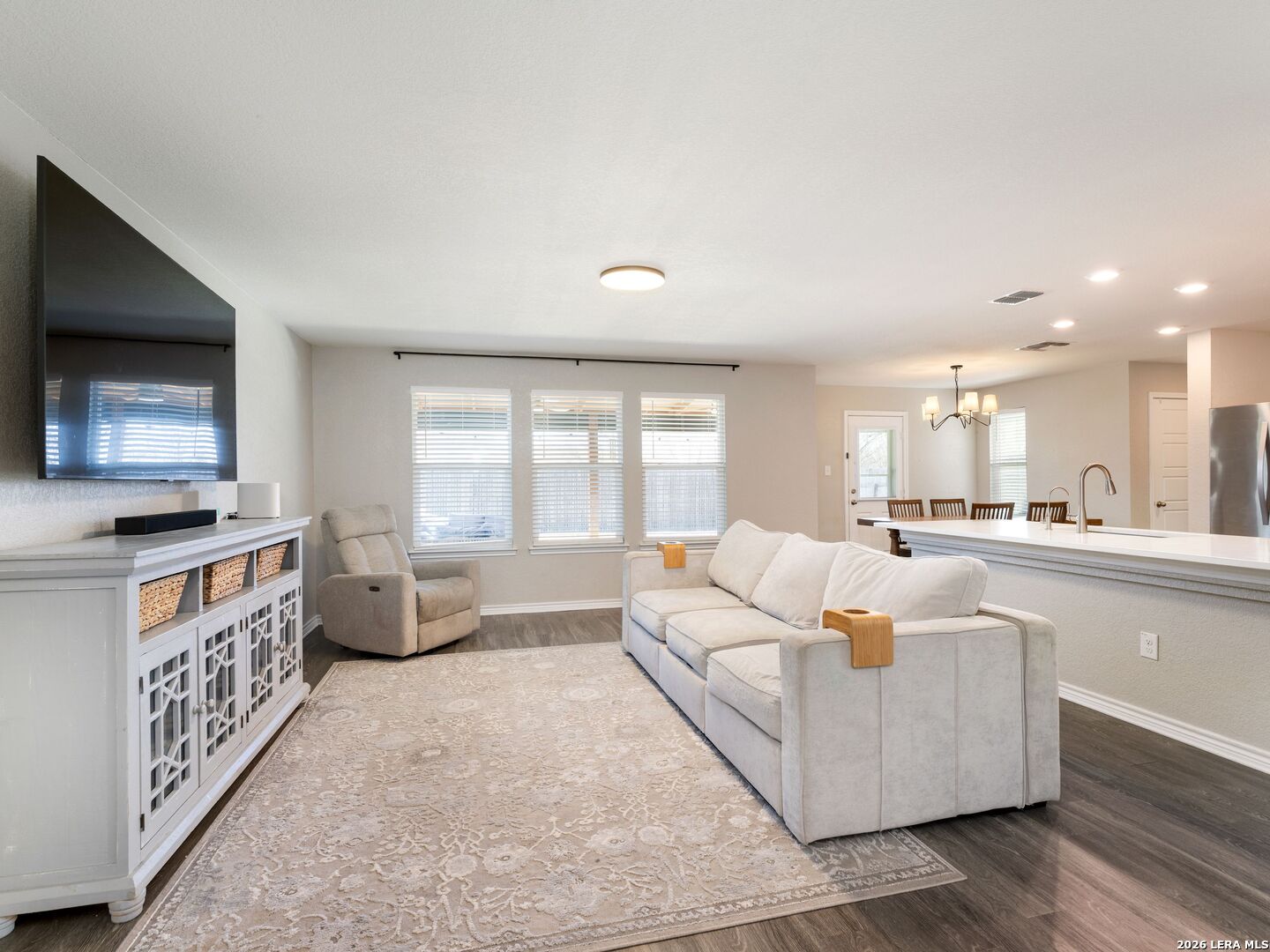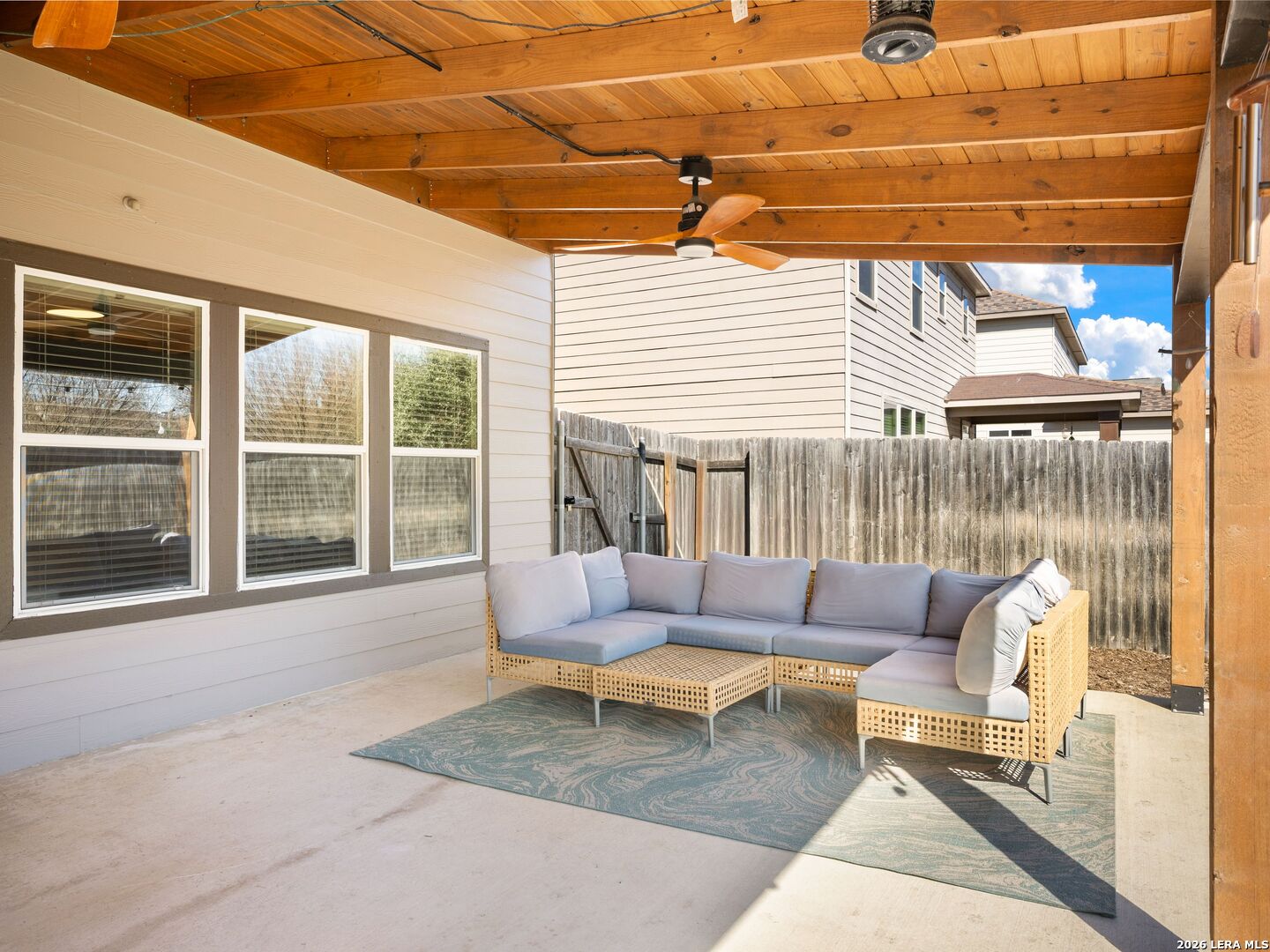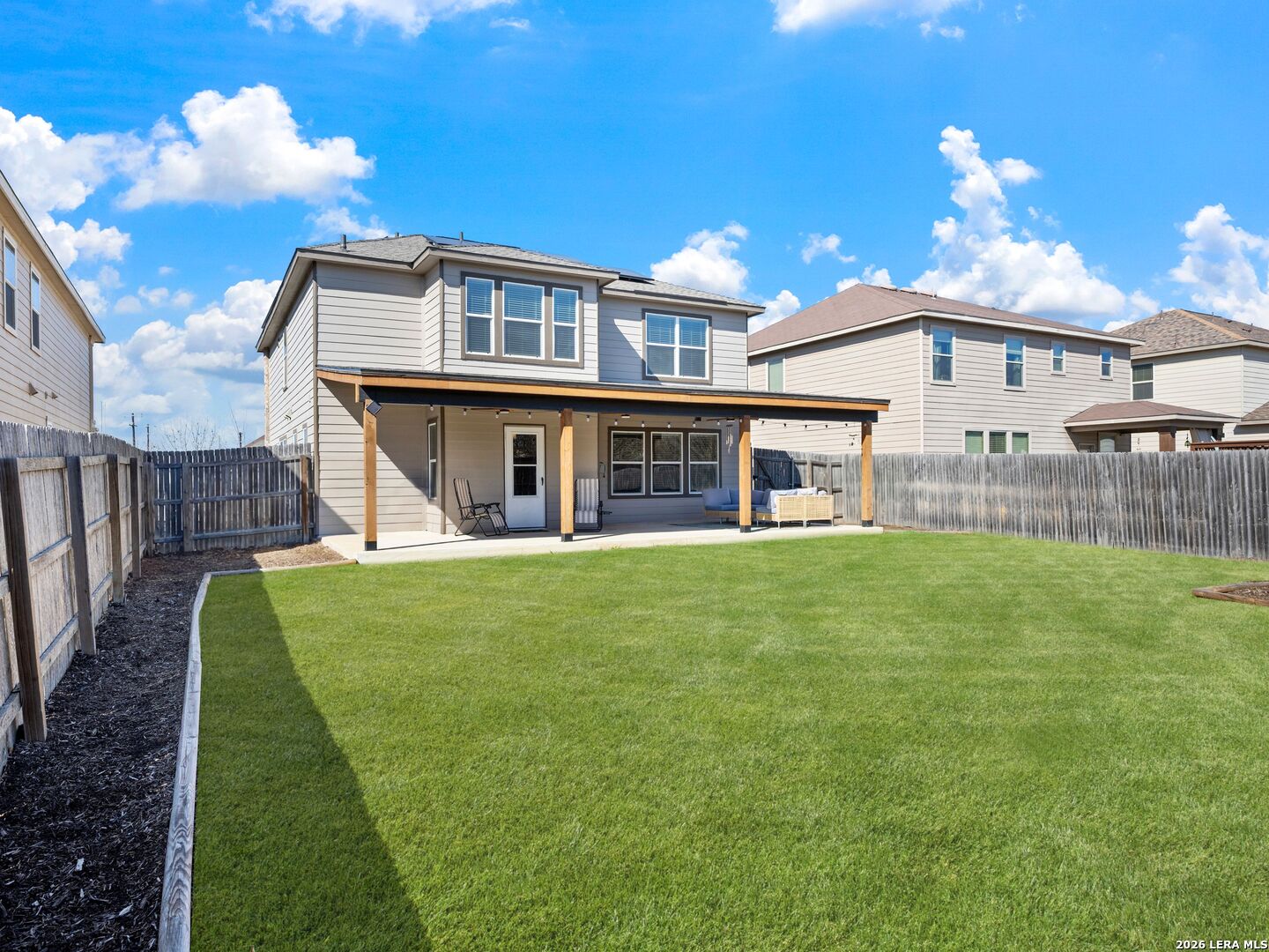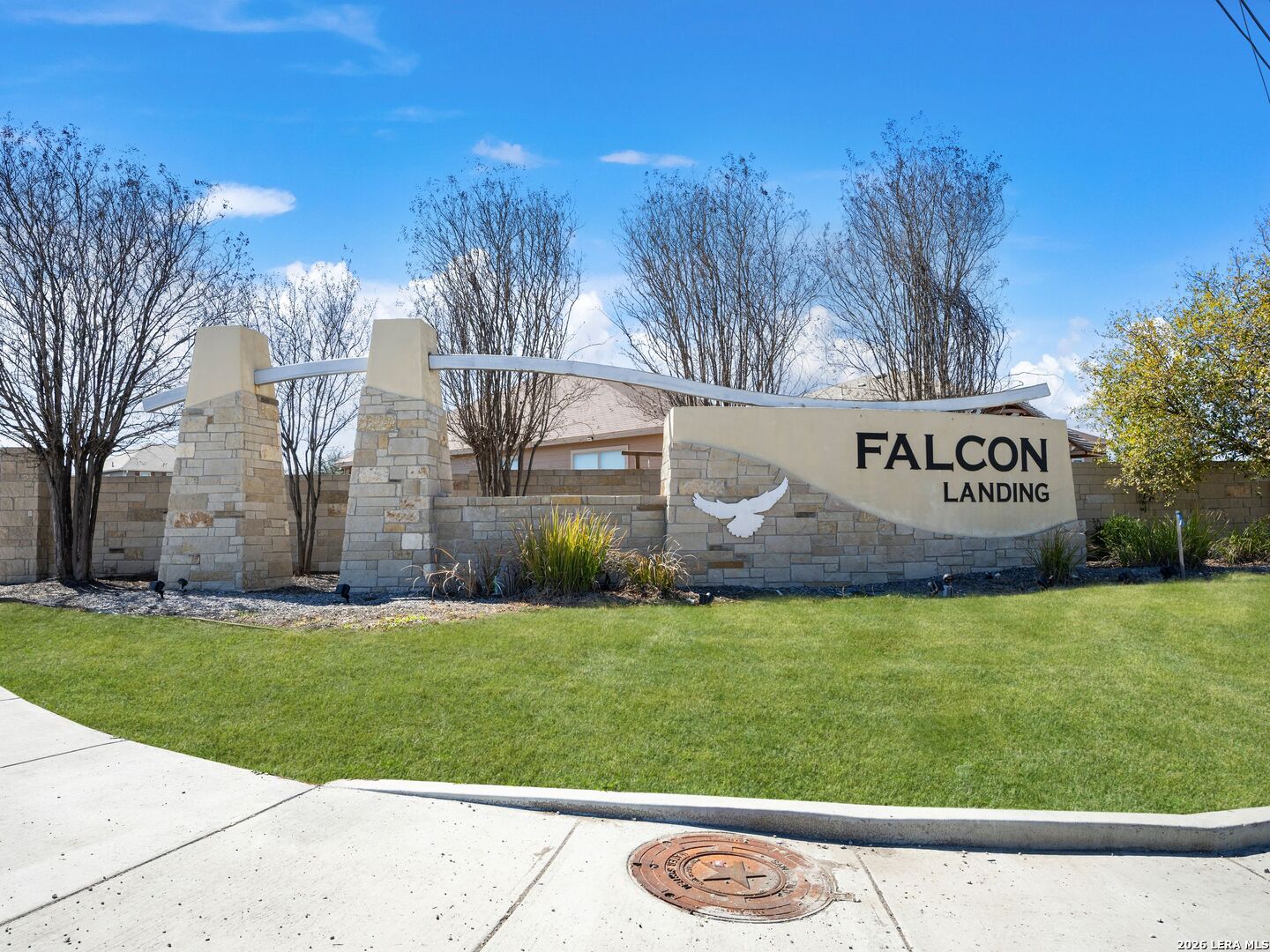 Located in the highly sought-after Falcon Landing community, this beautifully maintained home offers comfort, functionality, and smart upgrades throughout. Major improvements include a new roof (July 2025), paid-off solar panels, and a recently upgraded kitchen featuring quartz countertops, designer backsplash, new sink and faucet, and updated cabinet hardware. Inside, you'll find NO CARPET, a dedicated office, formal dining, breakfast area, and an open-concept kitchen and living space that serves as the heart of the home. Upstairs features a spacious second living area ideal for a game room, media room, or flex space. Step outside to the full-length custom upgraded covered patio with three ceiling fans, overlooking a large fenced yard with no backyard neighbors-perfect for relaxing or entertaining. Additional upgrades include a water softener and REME HALO-LED whole-home air purification system. Washer, dryer, and kitchen refrigerator convey. Conveniently located near Lackland AFB, SeaWorld, shopping, parks, and major thoroughfares.
