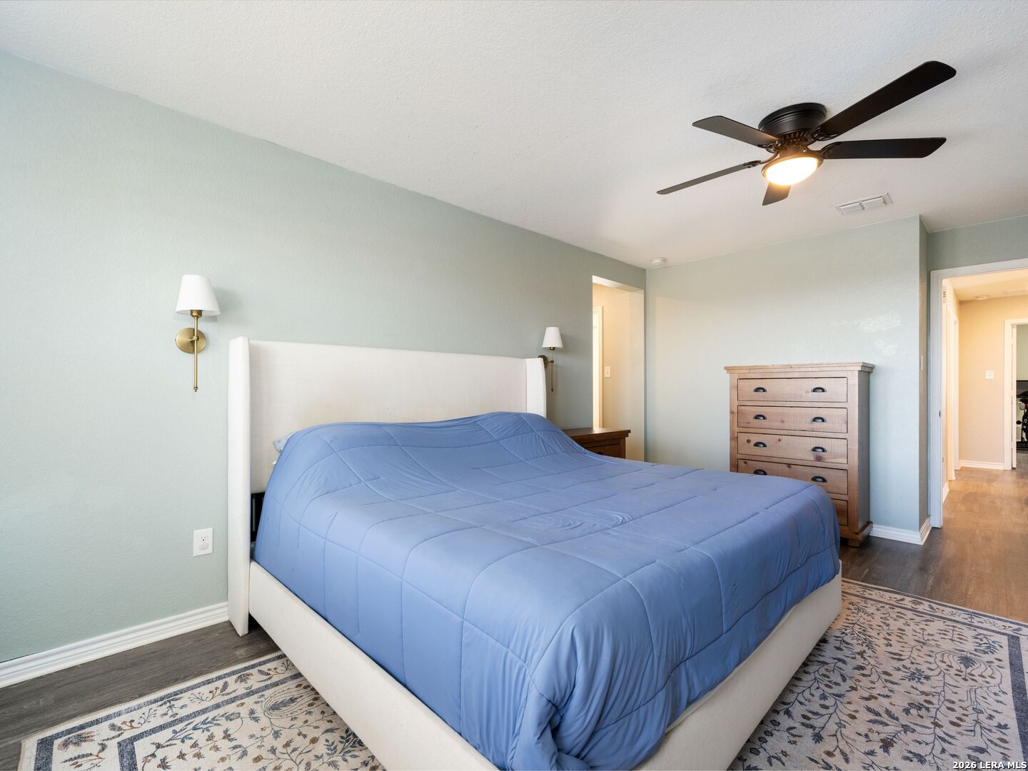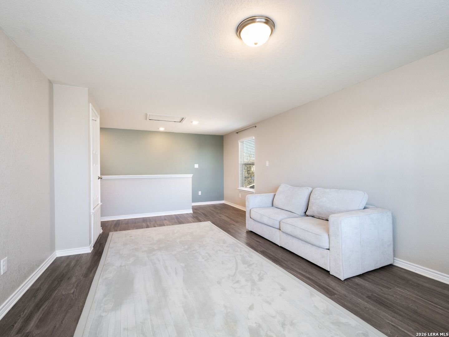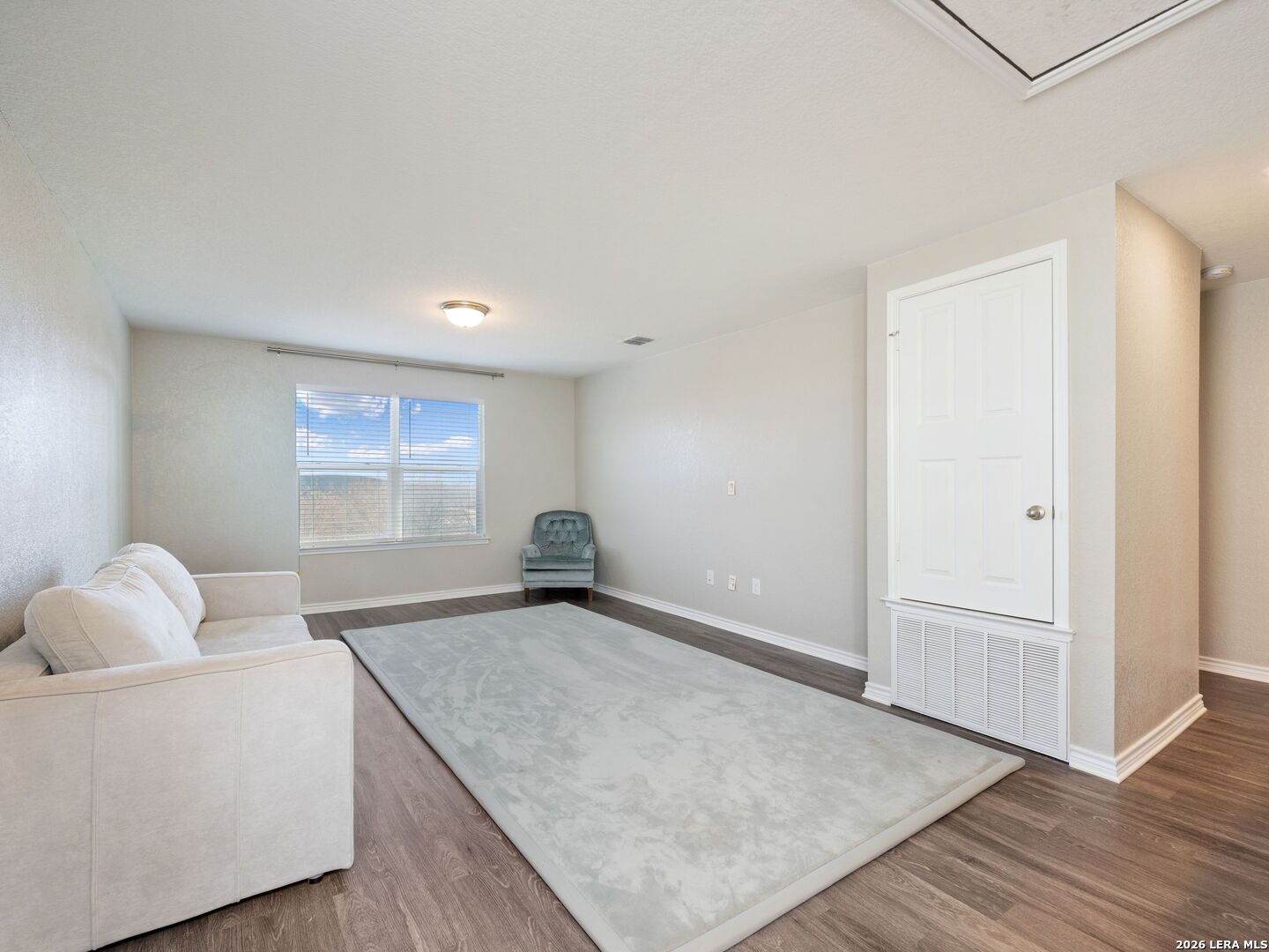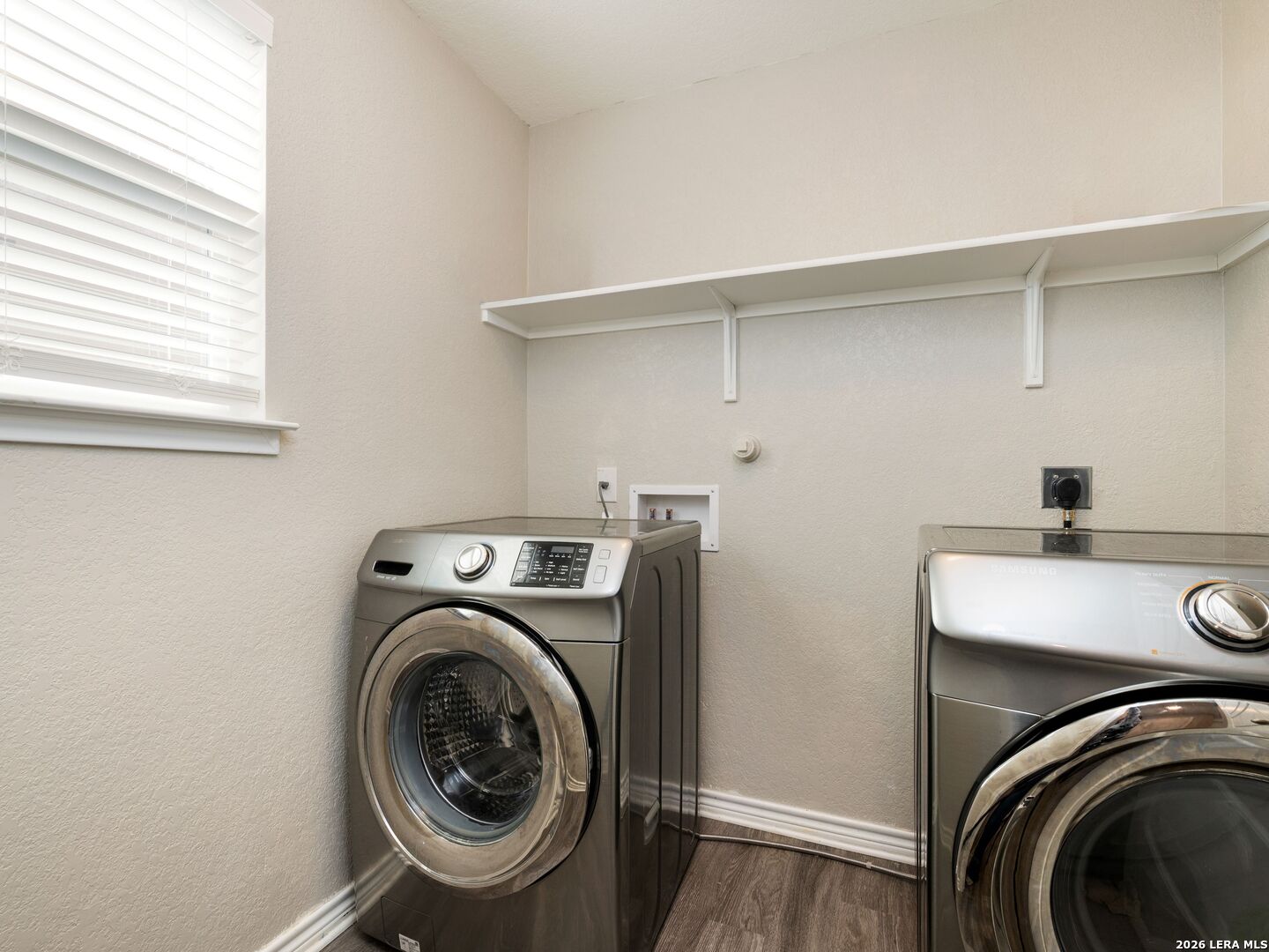 Located in the highly sought-after Falcon Landing community, this beautifully maintained home offers comfort, functionality, and smart upgrades throughout. Major improvements include a new roof (July 2025), paid-off solar panels, and a recently upgraded kitchen featuring quartz countertops, designer backsplash, new sink and faucet, and updated cabinet hardware. Inside, you'll find NO CARPET, a dedicated office, formal dining, breakfast area, and an open-concept kitchen and living space that serves as the heart of the home. Upstairs features a spacious second living area ideal for a game room, media room, or flex space. Step outside to the full-length custom upgraded covered patio with three ceiling fans, overlooking a large fenced yard with no backyard neighbors-perfect for relaxing or entertaining. Additional upgrades include a water softener and REME HALO-LED whole-home air purification system. Washer, dryer, and kitchen refrigerator convey. Conveniently located near Lackland AFB, SeaWorld, shopping, parks, and major thoroughfares.