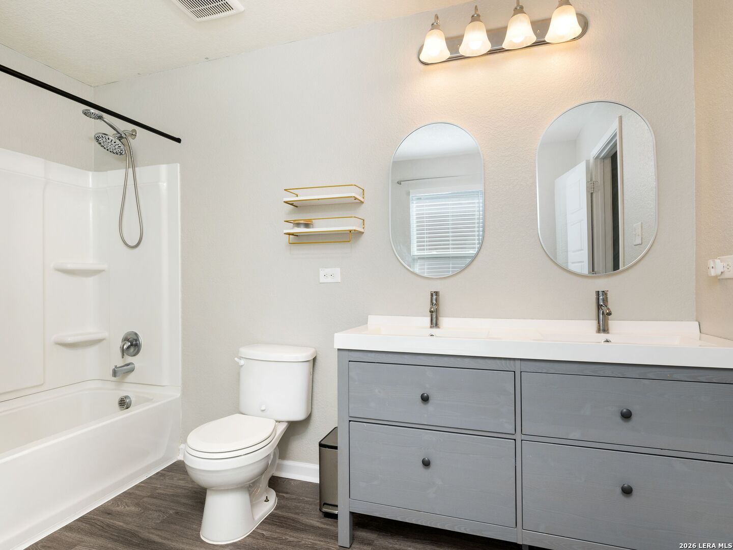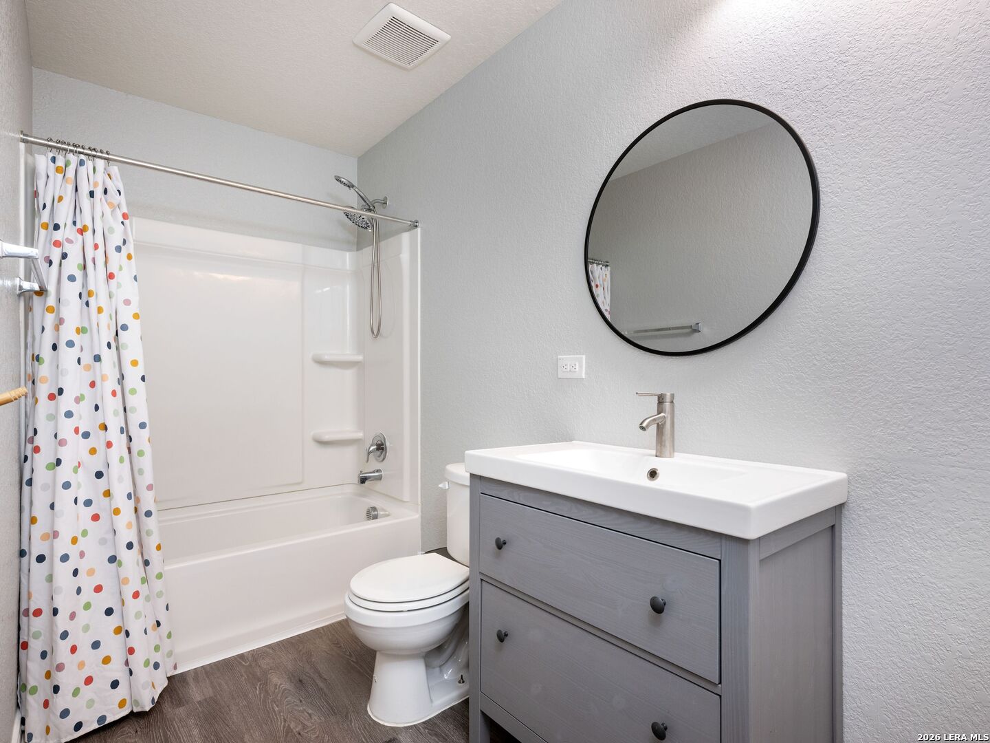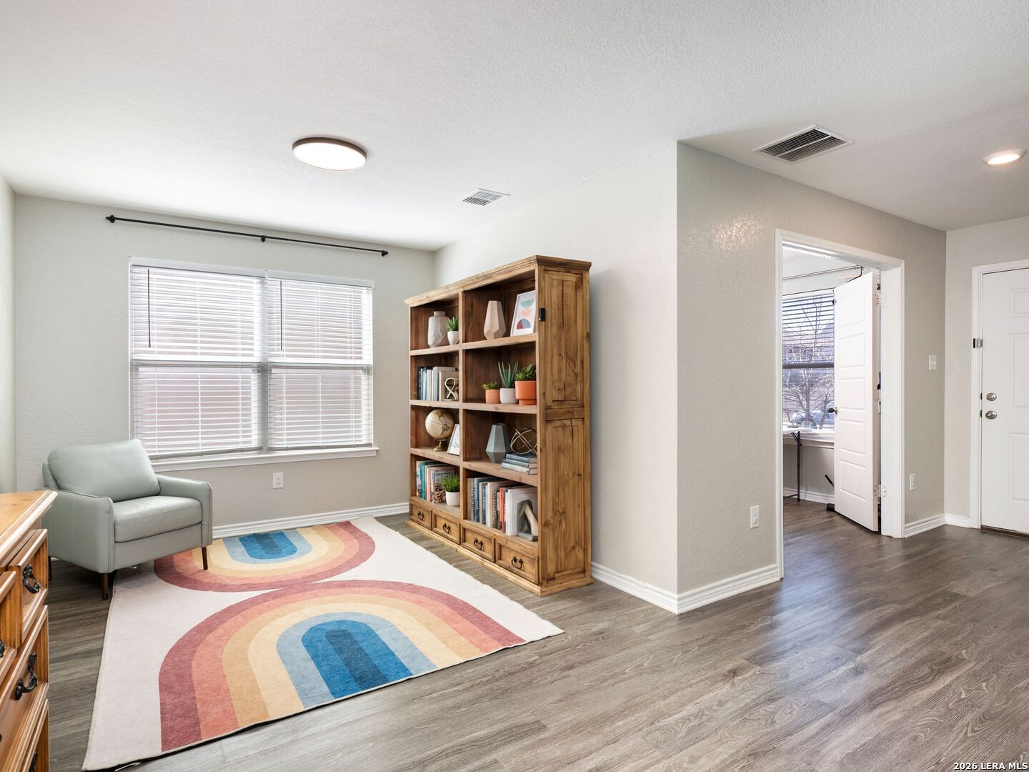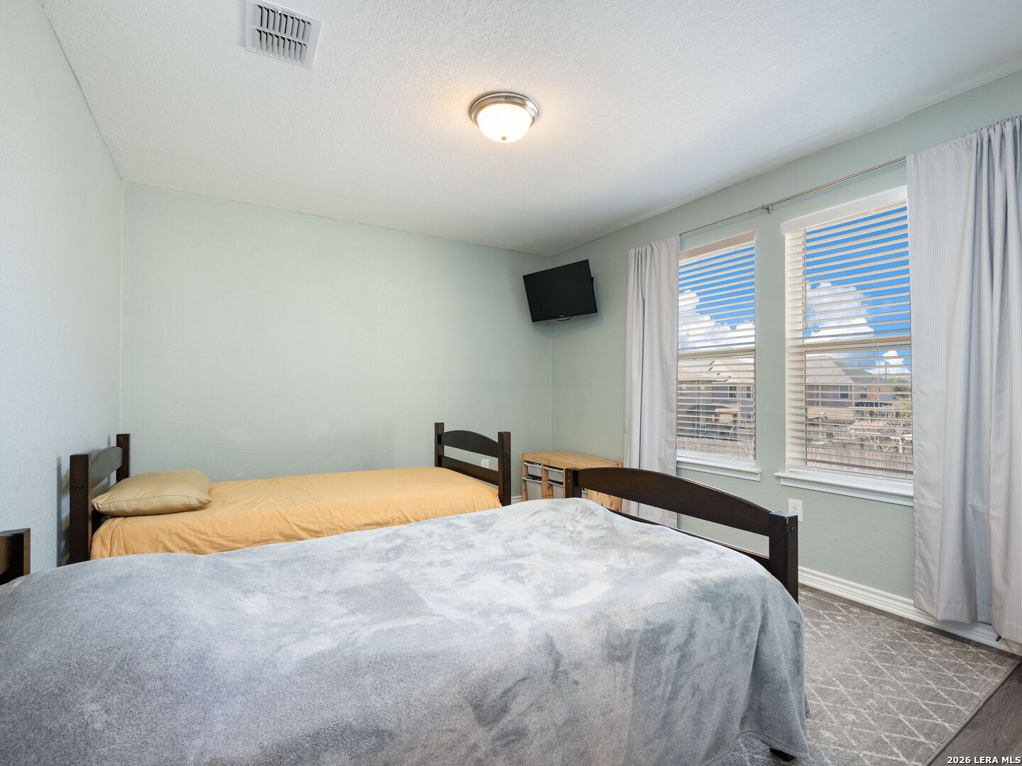 Located in the highly sought-after Falcon Landing community, this beautifully maintained home offers comfort, functionality, and smart upgrades throughout. Major improvements include a new roof (July 2025), paid-off solar panels, and a recently upgraded kitchen featuring quartz countertops, designer backsplash, new sink and faucet, and updated cabinet hardware. Inside, you'll find NO CARPET, a dedicated office, formal dining, breakfast area, and an open-concept kitchen and living space that serves as the heart of the home. Upstairs features a spacious second living area ideal for a game room, media room, or flex space. Step outside to the full-length custom upgraded covered patio with three ceiling fans, overlooking a large fenced yard with no backyard neighbors-perfect for relaxing or entertaining. Additional upgrades include a water softener and REME HALO-LED whole-home air purification system. Washer, dryer, and kitchen refrigerator convey. Conveniently located near Lackland AFB, SeaWorld, shopping, parks, and major thoroughfares.