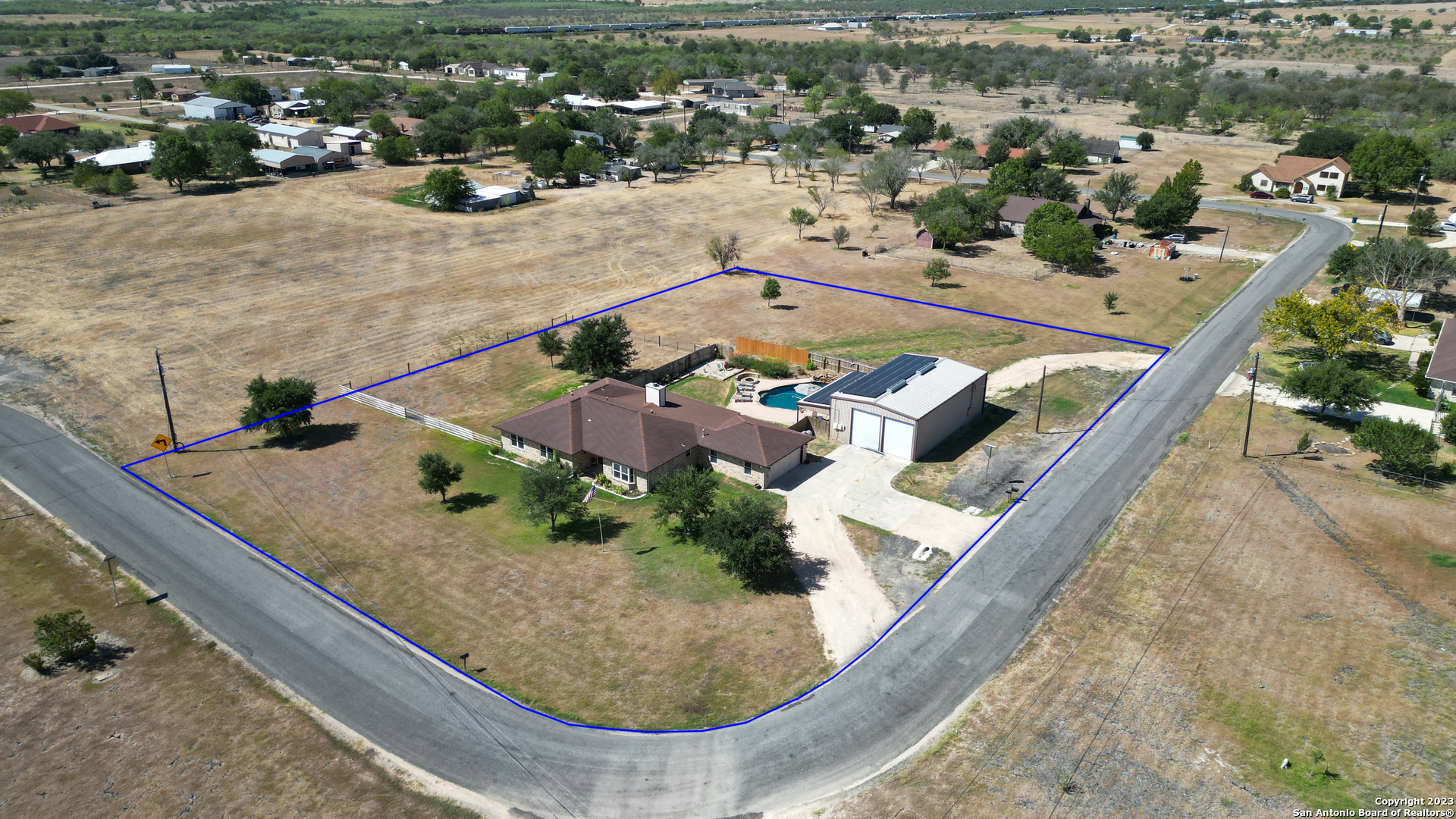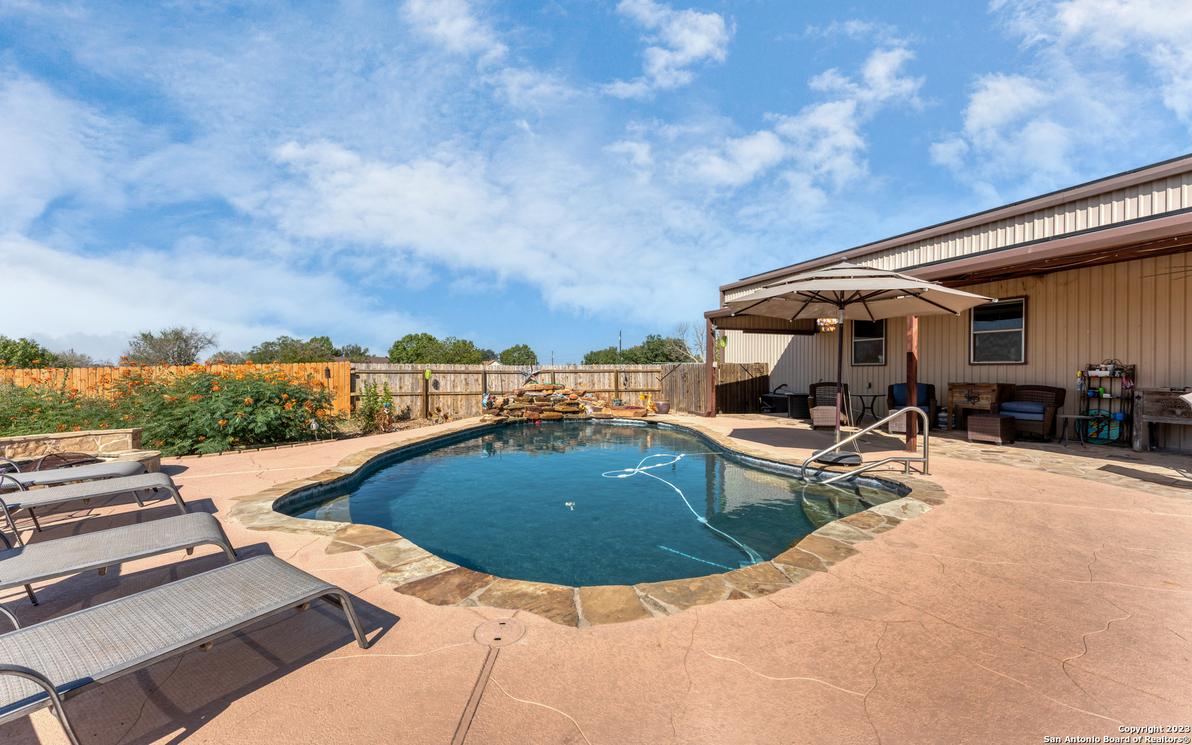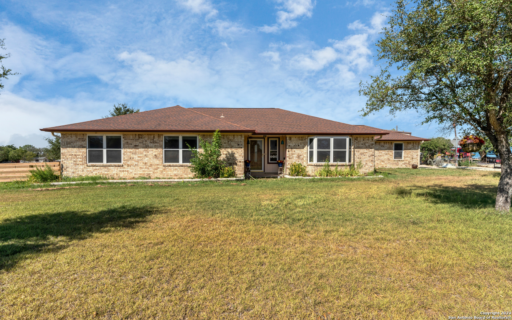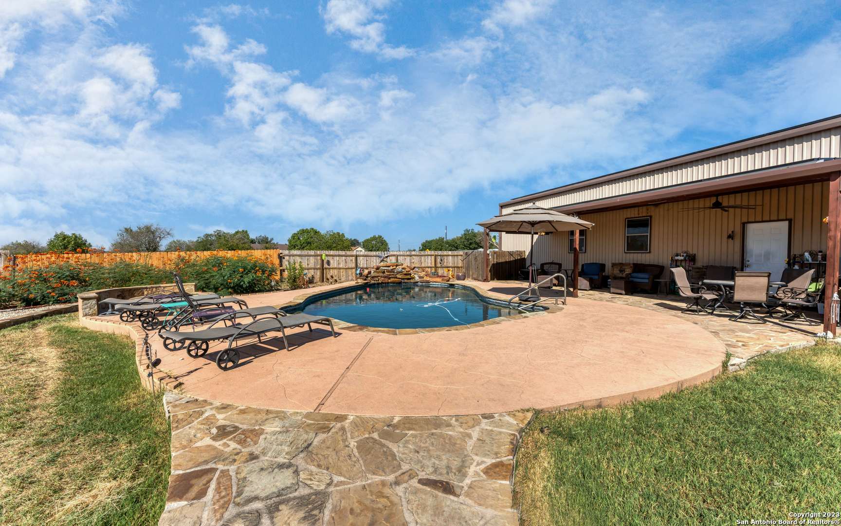 One story, ranch style home on a corner lot with custom pool, spa, waterfall and bonus workshop. Conveniently positioned on Santa Clara Loop with easy access to local amenities. Beautiful, all side brick home with recently installed HVAC, carpet, double pane windows & neutral interior paint. Enter the foyer which opens to the living room. Private formal dining room and breakfast nook located in the eat in kitchen. Kitchen equipped with pantry, breakfast bar and gas stove and range. Split 3 bedrooms, 2.5 baths with walk in closets. Spacious master suite with double vanity, sitting nook, spa garden tub, walk-in shower & large closets. Masonry, wood burning fireplace in family room. 2 car attached garage. Laundry/mudroom, linen closets and solar panels. 50x30 Metal shop with bonus workshop, on slab with electric and roll up doors. Privacy fencing for animals & flagpole in the front yard.