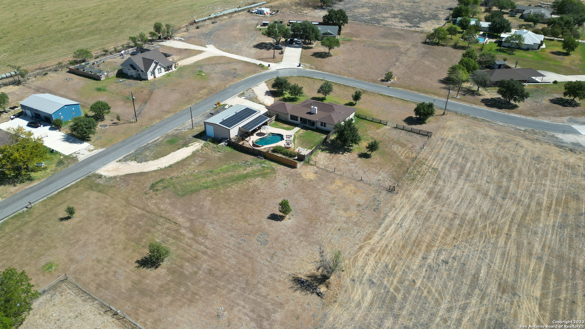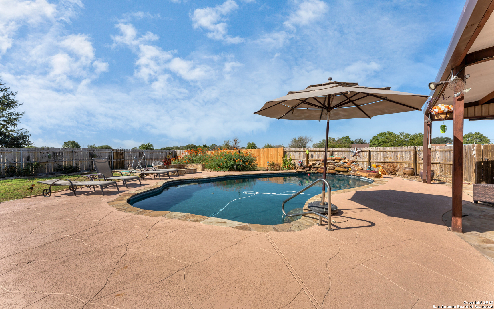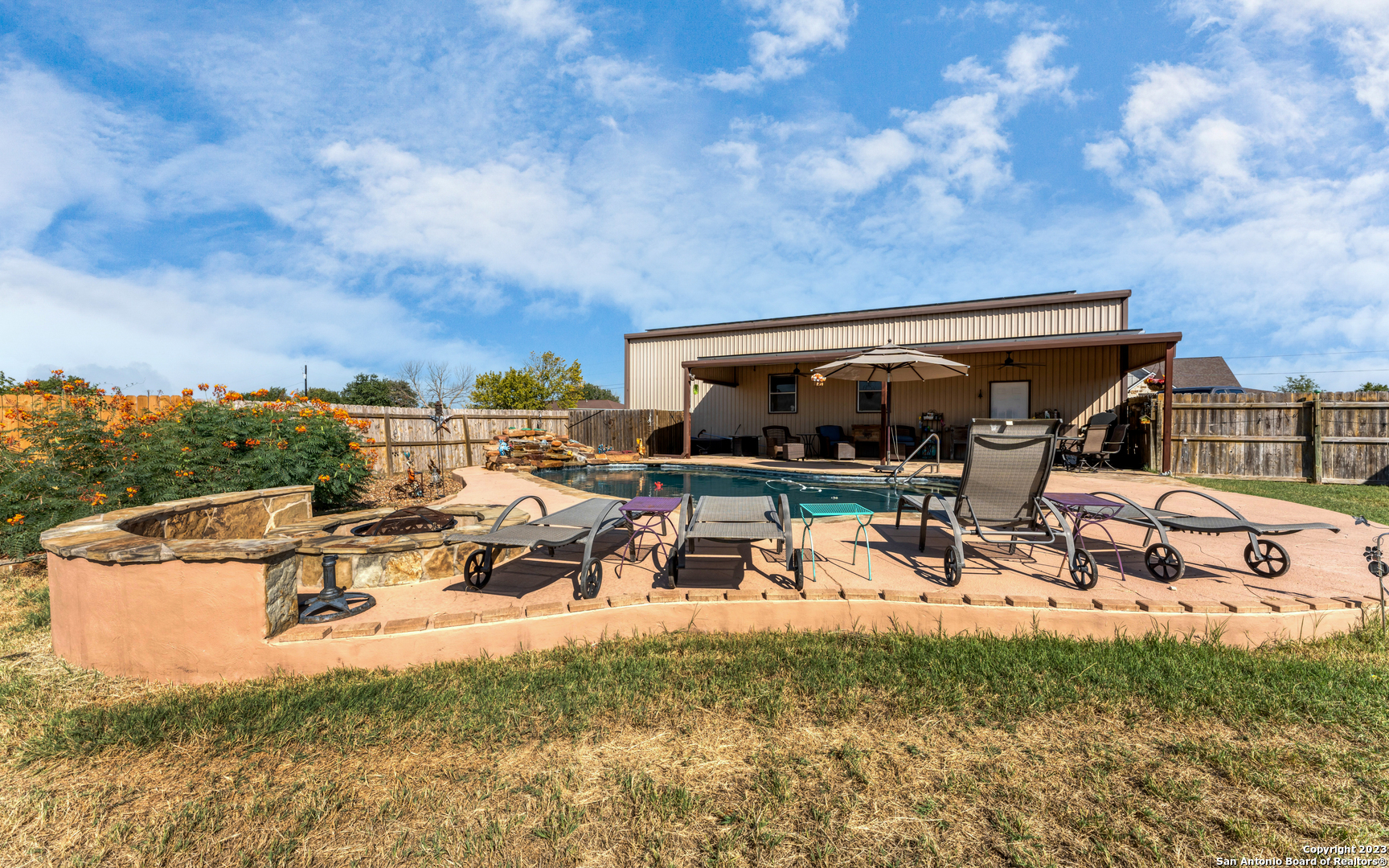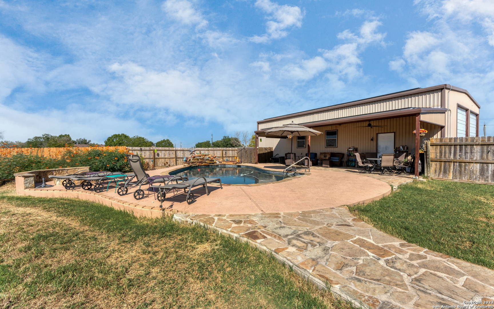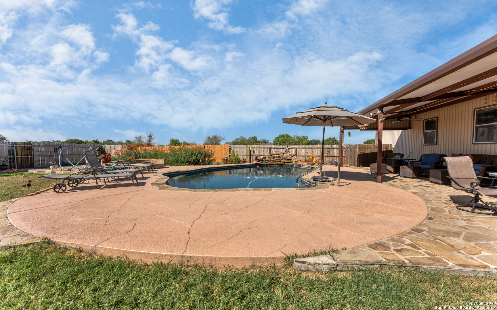 One story, ranch style home on a corner lot with custom pool, spa, waterfall and bonus workshop. Conveniently positioned on Santa Clara Loop with easy access to local amenities. Beautiful, all side brick home with recently installed HVAC, carpet, double pane windows & neutral interior paint. Enter the foyer which opens to the living room. Private formal dining room and breakfast nook located in the eat in kitchen. Kitchen equipped with pantry, breakfast bar and gas stove and range. Split 3 bedrooms, 2.5 baths with walk in closets. Spacious master suite with double vanity, sitting nook, spa garden tub, walk-in shower & large closets. Masonry, wood burning fireplace in family room. 2 car attached garage. Laundry/mudroom, linen closets and solar panels. 50x30 Metal shop with bonus workshop, on slab with electric and roll up doors. Privacy fencing for animals & flagpole in the front yard.
