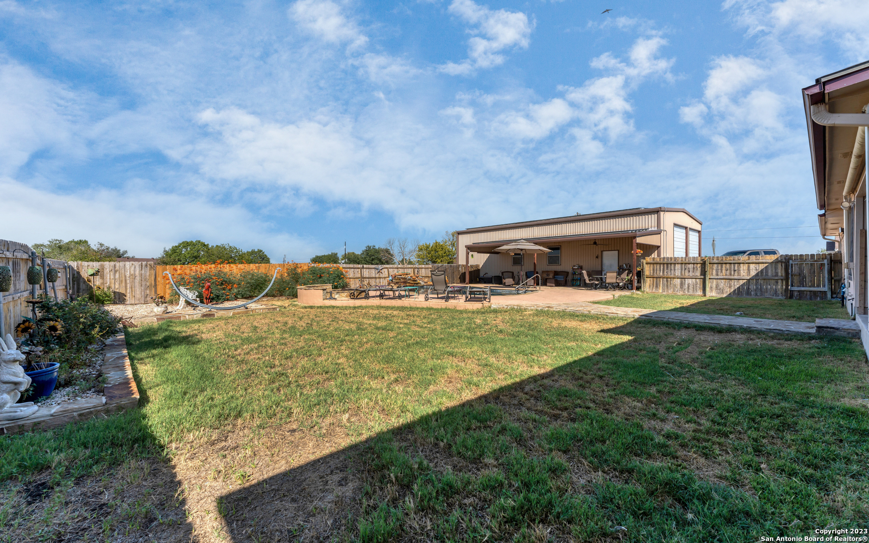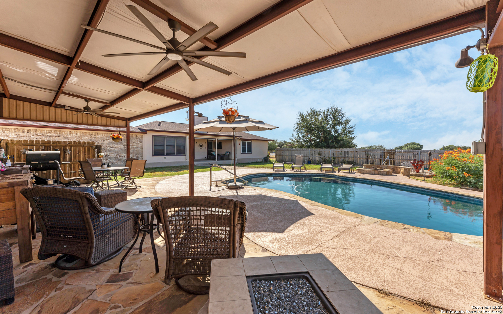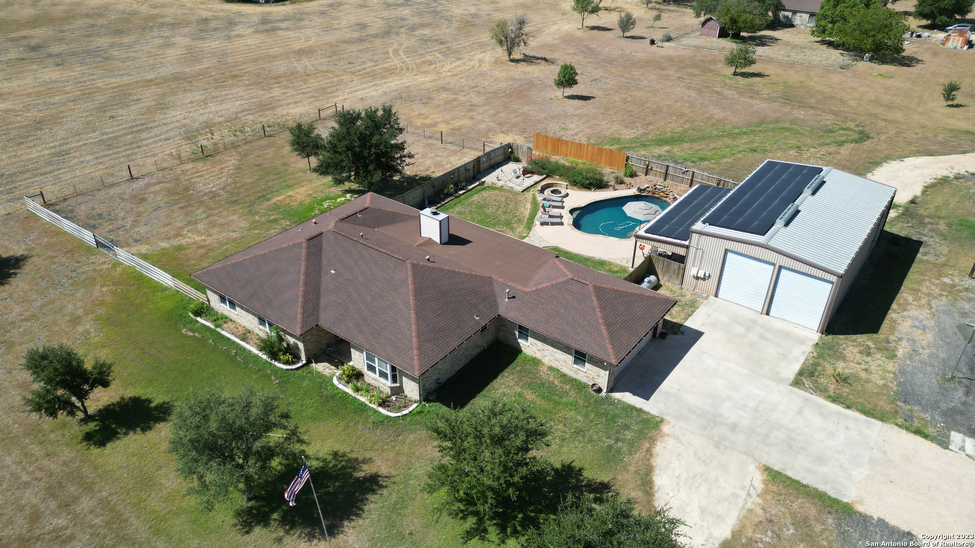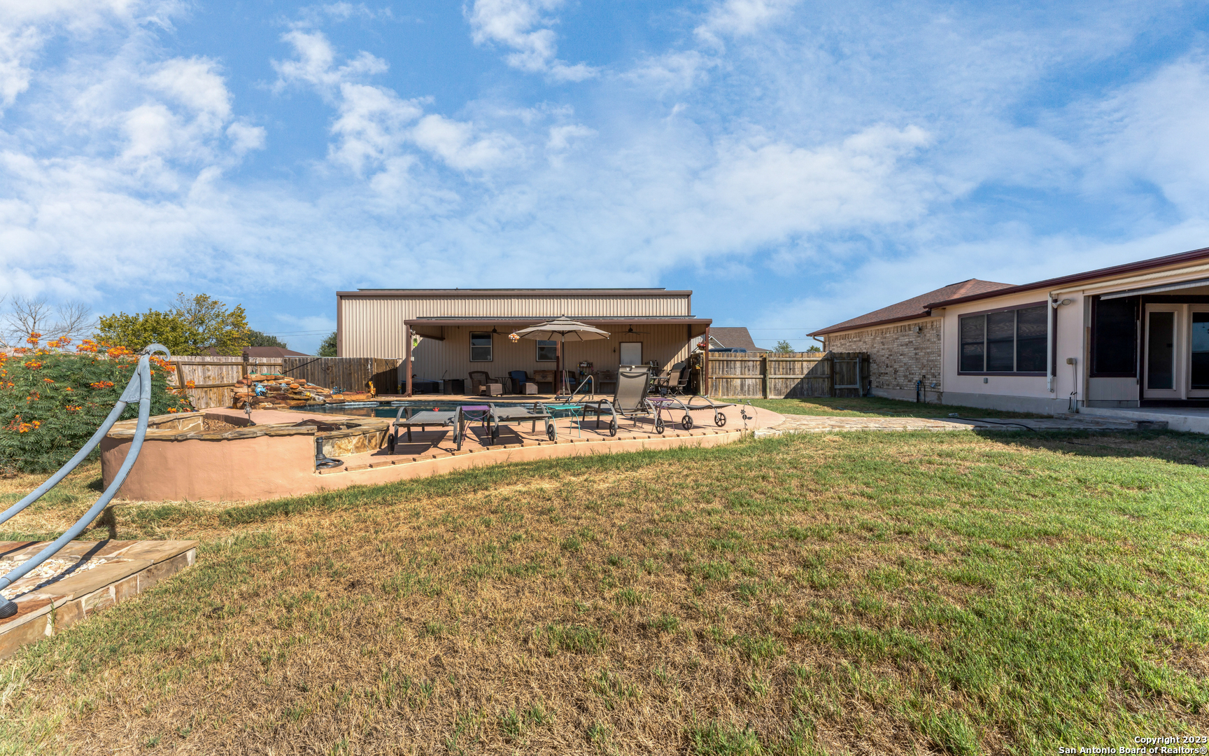 One story, ranch style home on a corner lot with custom pool, spa, waterfall and bonus workshop. Conveniently positioned on Santa Clara Loop with easy access to local amenities. Beautiful, all side brick home with recently installed HVAC, carpet, double pane windows & neutral interior paint. Enter the foyer which opens to the living room. Private formal dining room and breakfast nook located in the eat in kitchen. Kitchen equipped with pantry, breakfast bar and gas stove and range. Split 3 bedrooms, 2.5 baths with walk in closets. Spacious master suite with double vanity, sitting nook, spa garden tub, walk-in shower & large closets. Masonry, wood burning fireplace in family room. 2 car attached garage. Laundry/mudroom, linen closets and solar panels. 50x30 Metal shop with bonus workshop, on slab with electric and roll up doors. Privacy fencing for animals & flagpole in the front yard.
