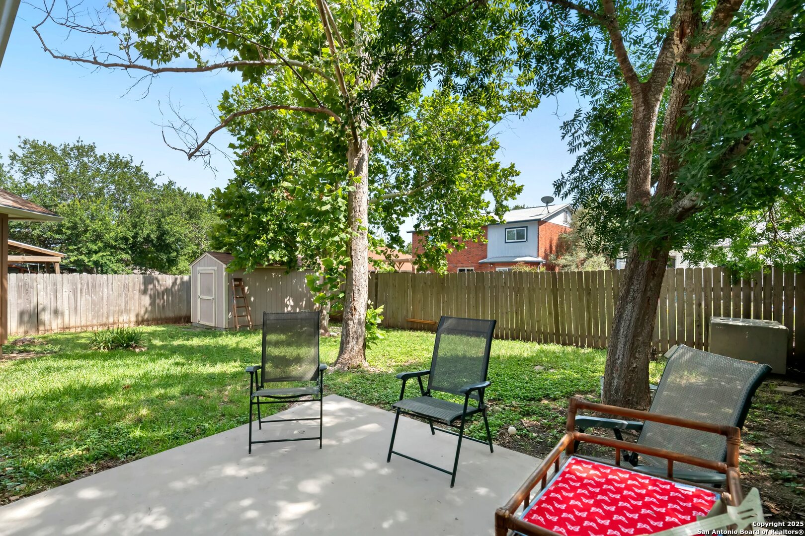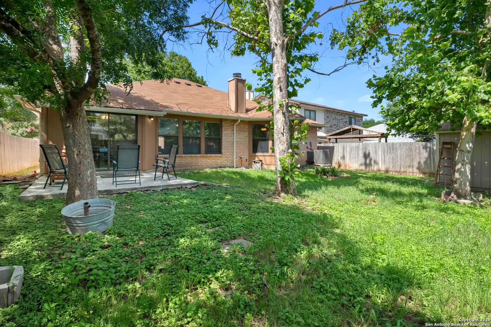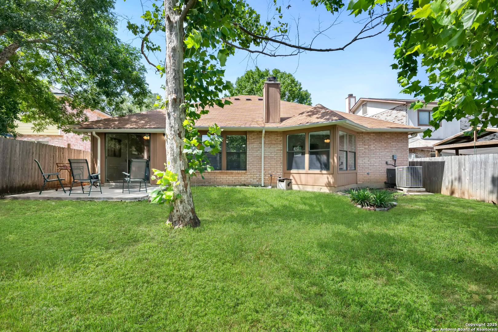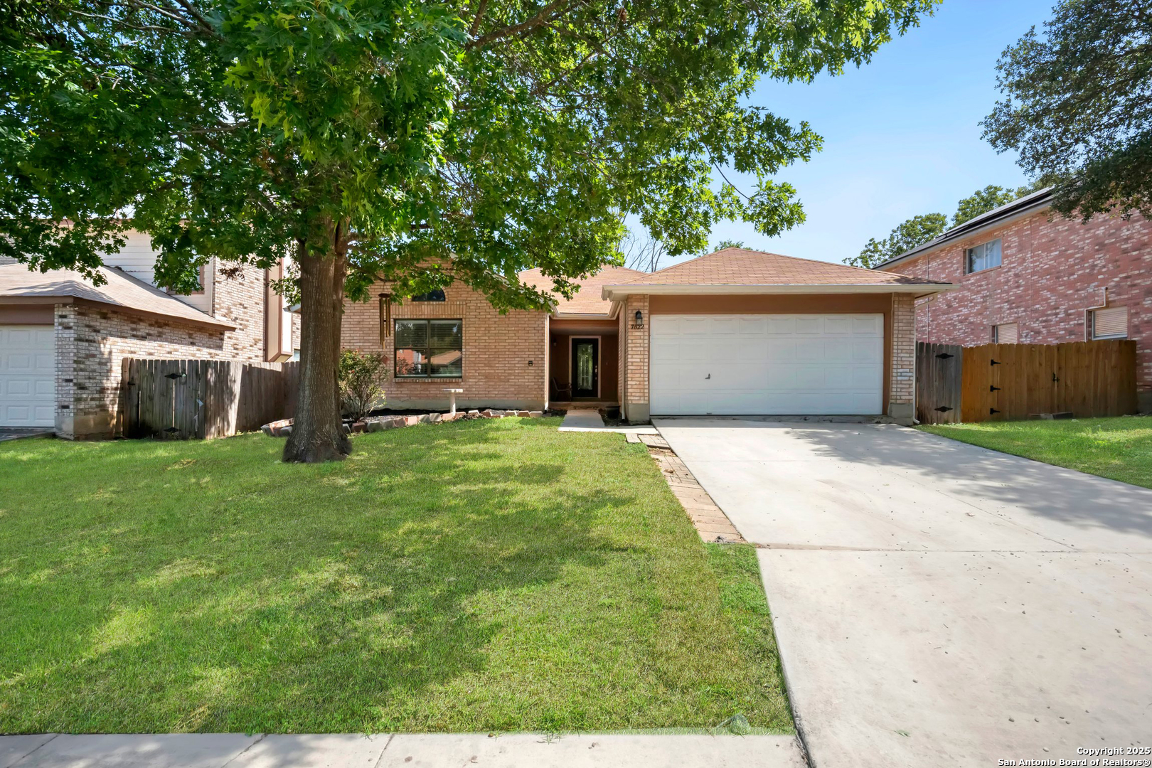 This charming single-story home in Parkwood offers a comfortable and updated layout, perfect for everyday living. Featuring 3 bedrooms and 2 bathrooms, the home has a bright and open floor plan with abundant natural light. The spacious living area includes a wood-burning fireplace flanked by built-in bookcases, creating a warm and inviting space. A formal dining area with a pass-through to the kitchen provides a functional flow for both casual meals and entertaining. The kitchen includes a walk-in pantry, breakfast bar, and plenty of cabinet and counter space. The split primary bedroom features a sitting area and peaceful views of the backyard. Outdoors, you'll find a patio, mature shade trees, a privacy fence, and a lawn area ideal for relaxing or play. Recent updates include a new water heater in 2023, and fresh interior paint completed in June 2025. Located in a desirable school district just two blocks from the elementary school, this home is also close to Bamberger Nature Park, community amenities, Loop 1604, and Bandera Road. Schedule your showing today!