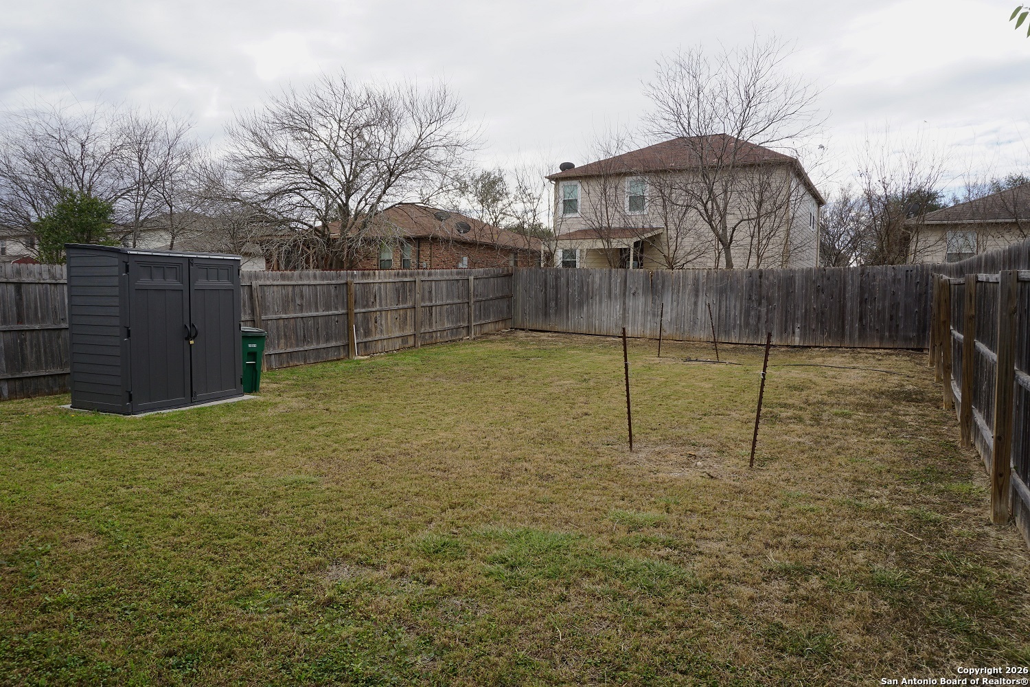 One-story 2 bedroom, 1 bathroom home featuring an open floor plan and built-in entertainment center in the living area. The kitchen offers plenty of counter space, gas cooking, and includes a refrigerator, microwave, dishwasher, and garbage disposal. Stacked washer and dryer are conveniently located in the hallway closet. The bathroom features a single vanity and shower/tub combo. Enjoy a spacious backyard with privacy fencing - perfect for relaxing or entertaining. Located in San Antonio with easy access to local conveniences and commuter routes.