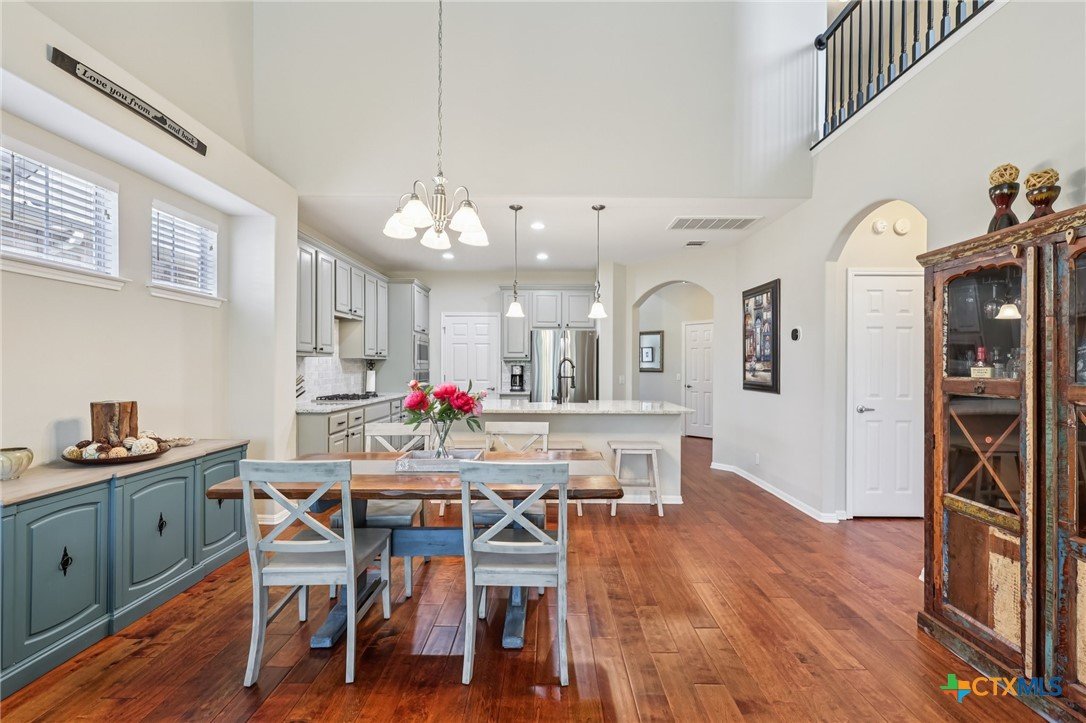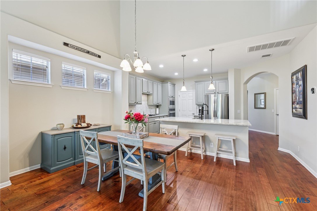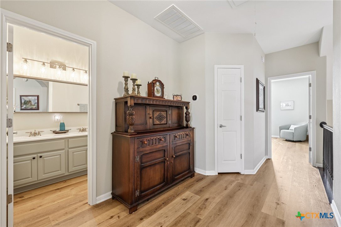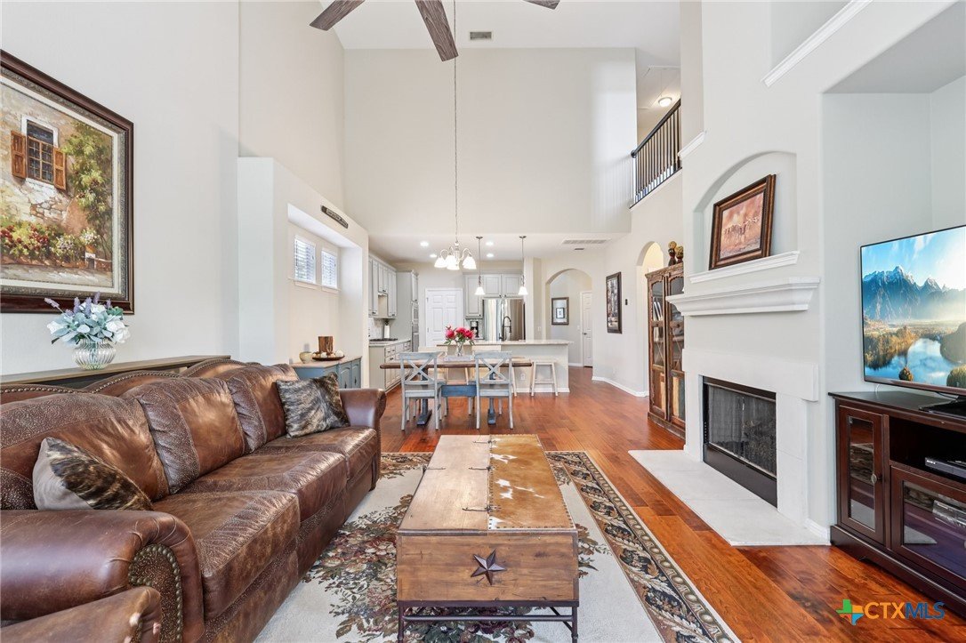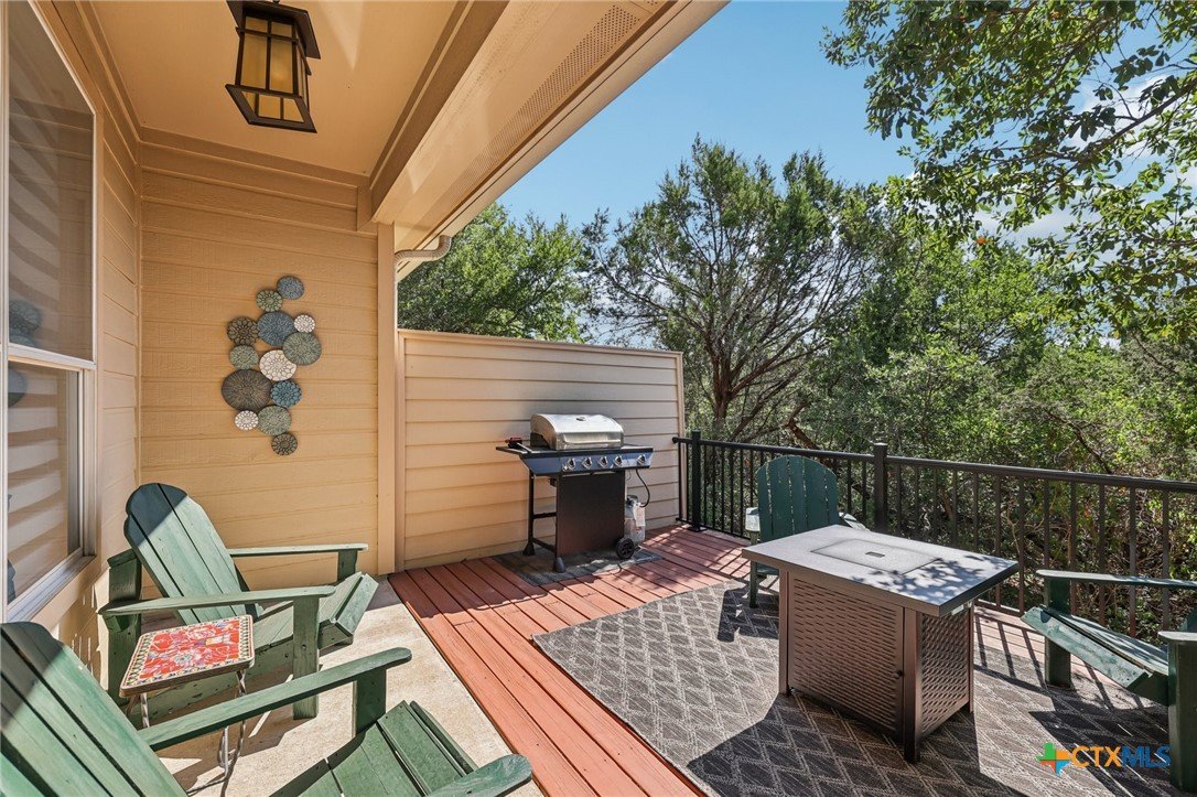 Elegant condo in the gated Sierra Vista community with soaring ceilings, abundant natural light, and beautiful wood and tile floors—no carpet. The open living and dining area features a cozy fireplace and graceful archways, while the updated kitchen offers newly installed quartz countertops, tile backsplash, and a farmhouse sink, like-new LG stainless steel appliances, and fresh finishes that give it a modern, polished look. The main-level primary suite boasts a spa-like bath with dual vanities, soaking tub, walk-in shower with privacy glass, and a custom walk-in closet. Upstairs includes two spacious bedrooms with walk-in closets, a flex room, an office, or even your own exercise room! Enjoy a private terraced porch overlooking a peaceful wooded greenbelt—perfect for relaxing or entertaining. Only one mile to Lantana Place with a movie theatre, restaurants, coffee, and more, and just 15 minutes to downtown Austin!
