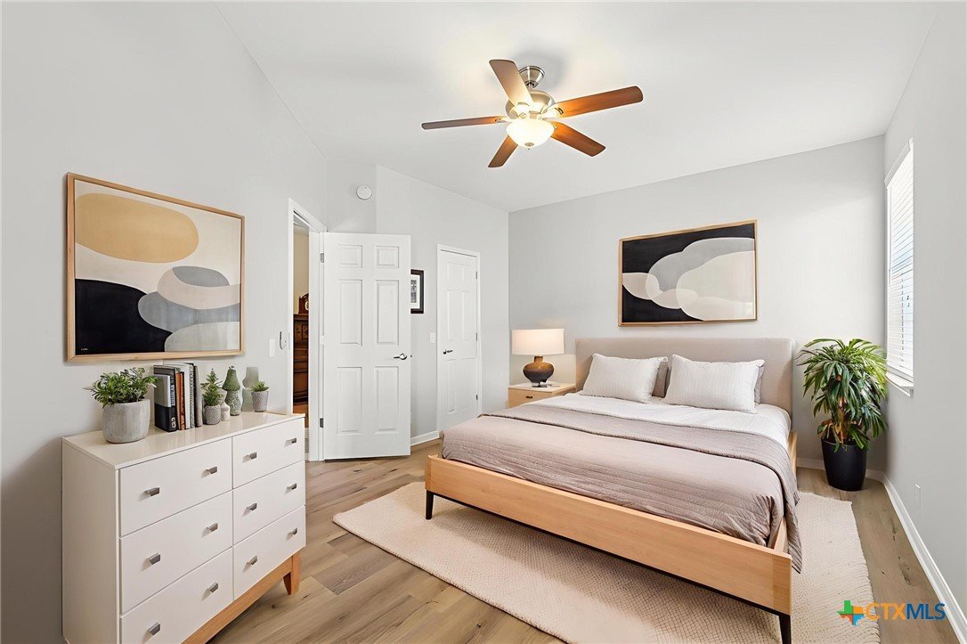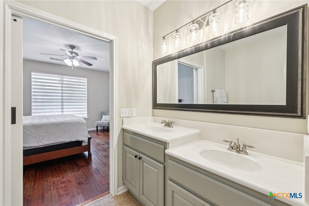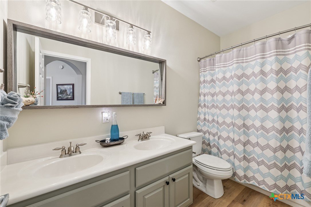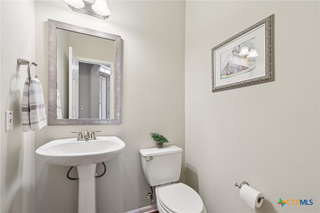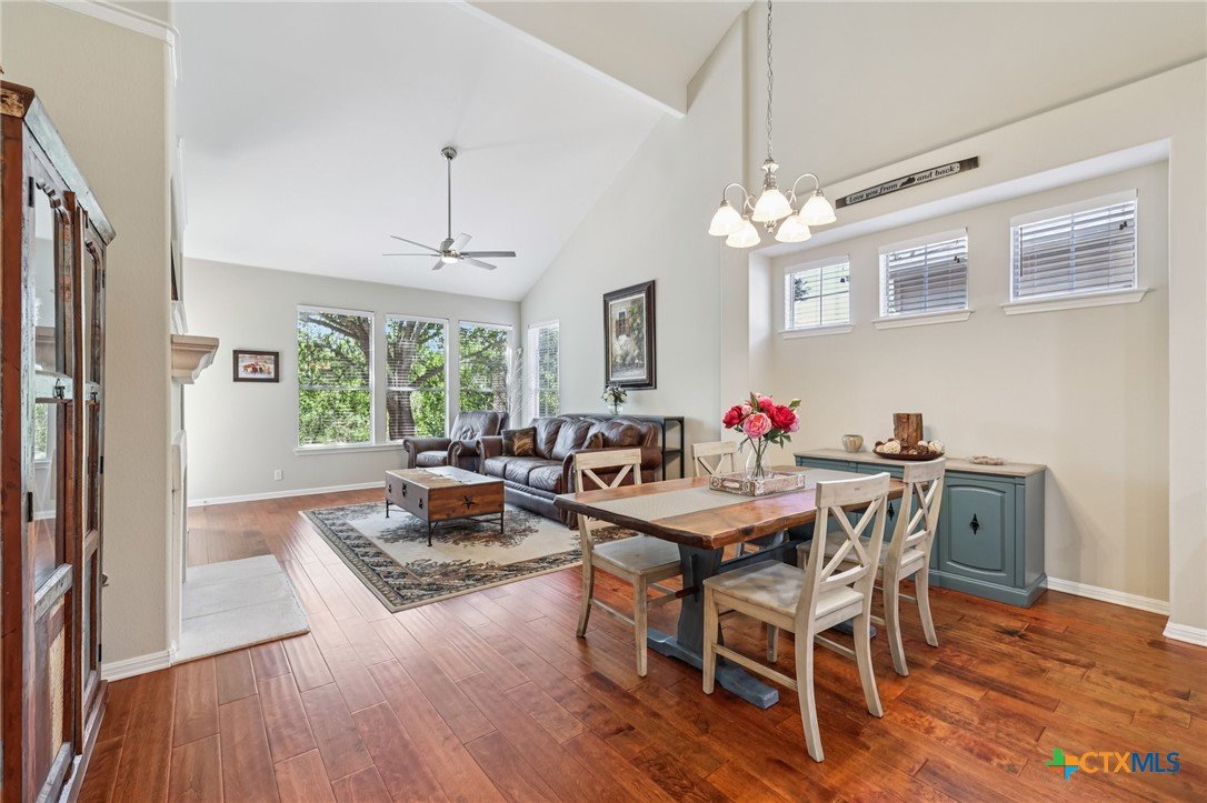 Elegant condo in the gated Sierra Vista community with soaring ceilings, abundant natural light, and beautiful wood and tile floors—no carpet. The open living and dining area features a cozy fireplace and graceful archways, while the updated kitchen offers newly installed quartz countertops, tile backsplash, and a farmhouse sink, like-new LG stainless steel appliances, and fresh finishes that give it a modern, polished look. The main-level primary suite boasts a spa-like bath with dual vanities, soaking tub, walk-in shower with privacy glass, and a custom walk-in closet. Upstairs includes two spacious bedrooms with walk-in closets, a flex room, an office, or even your own exercise room! Enjoy a private terraced porch overlooking a peaceful wooded greenbelt—perfect for relaxing or entertaining. Only one mile to Lantana Place with a movie theatre, restaurants, coffee, and more, and just 15 minutes to downtown Austin!