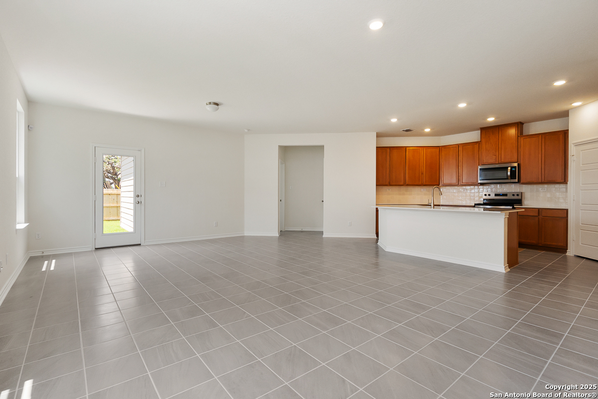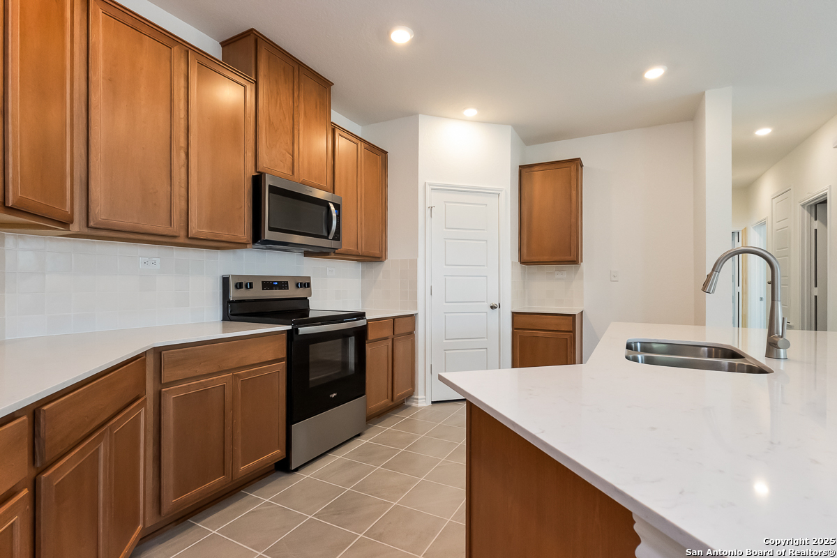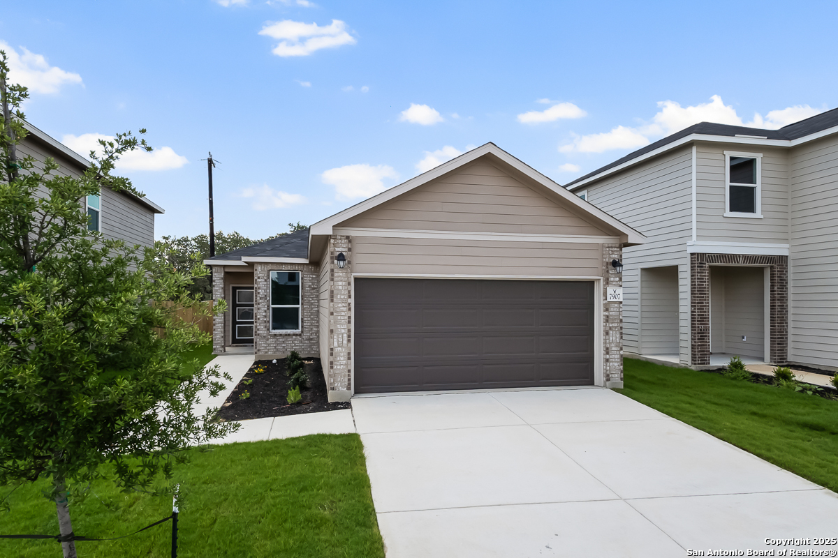This inviting home features 9-ft. first-floor ceilings, creating an open and airy ambiance. The kitchen is equipped with Whirlpool stainless steel appliances, a Daltile tile backsplash, and an extended breakfast bar, perfect for casual dining and entertaining. The primary bath offers a spa-like retreat with an extended cabinet and knee space, a 42-in. garden tub, and a separate shower with Daltile tile surround. Stylish touches include a Texas Star entry door, Kwikset Polo knob interior hardware, and durable Coastline ceramic tile flooring in the great room, kitchen, and bathrooms. Additional highlights include a wireless security system and an automatic sprinkler system to keep your outdoor space vibrant and low-maintenance.